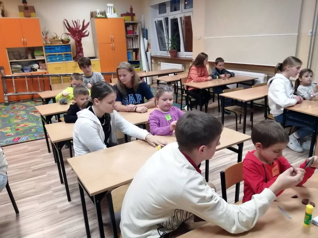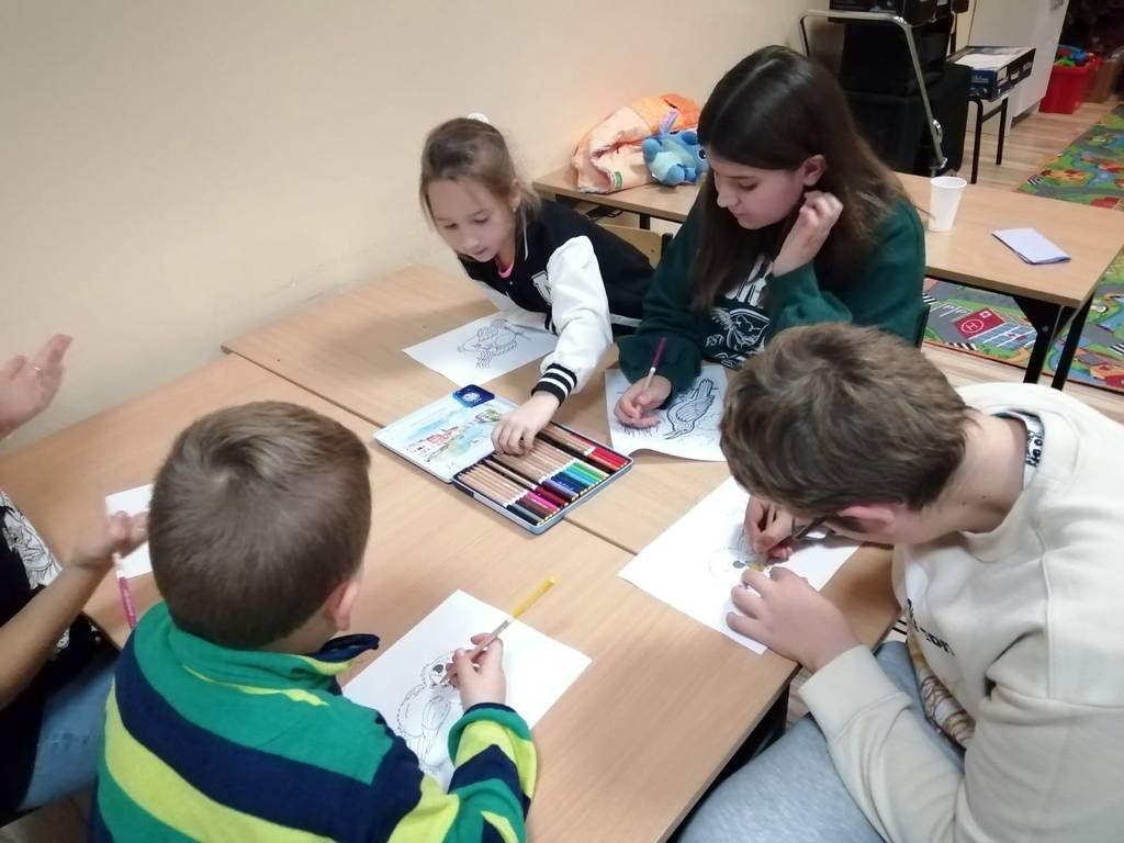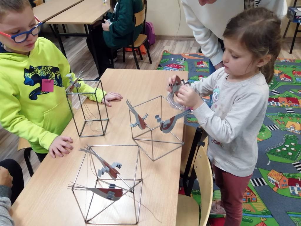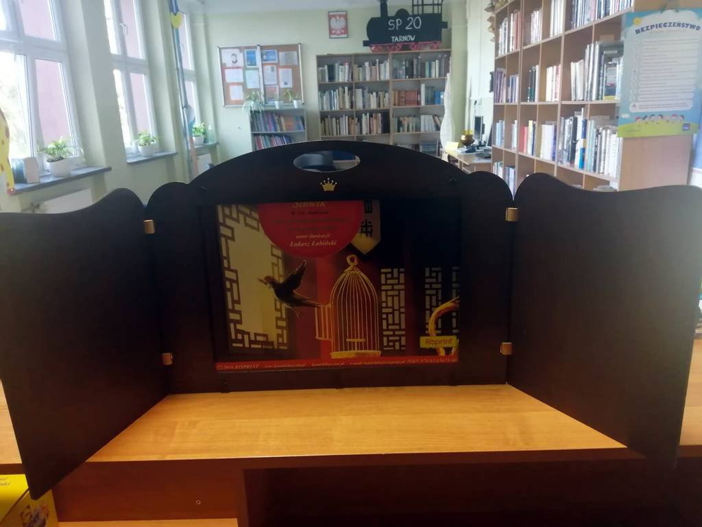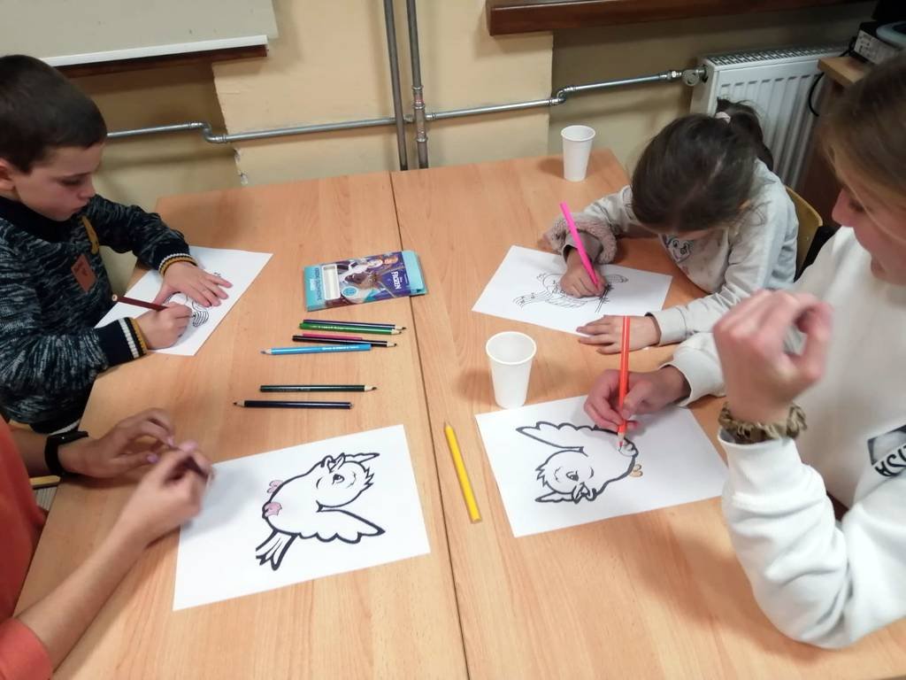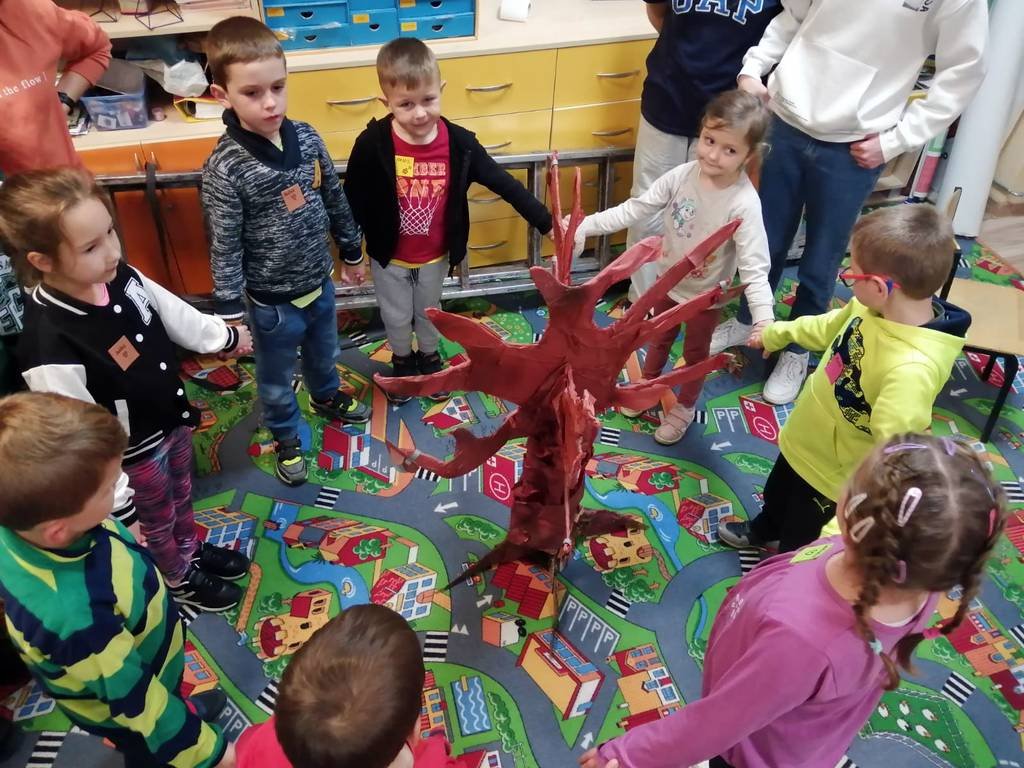 Dzięki pięknym ilustracjom prezentowanym w teatrzyku kamishibai, dzieci nie tylko wysłuchały baśni J. Ch. Andersena „Słowik”, także oglądały karty prezentujące baśń. W części zajęć plastycznych wykonały przy pomocy starszych koleżanek i kolegów papierowego bohatera baśni – słowika. Słuchały odgłosów różnych ptaków odgadując do którego ptaka należy poszczególny dźwięk. Zajęcia zakończyły się wspólną zabawą do „tańca siedmiokroczka”. Dziękujemy wszystkim uczestnikom spotkania  i zapraszamy na kolejne zajęcia.