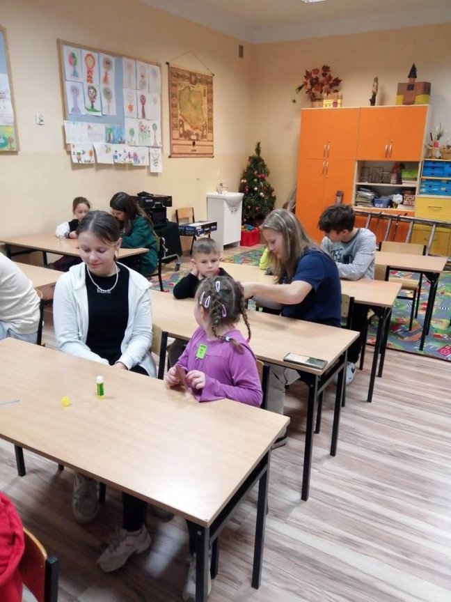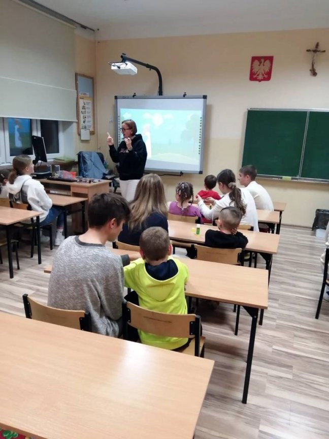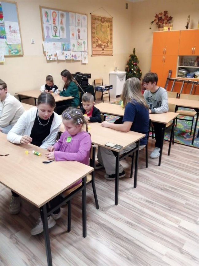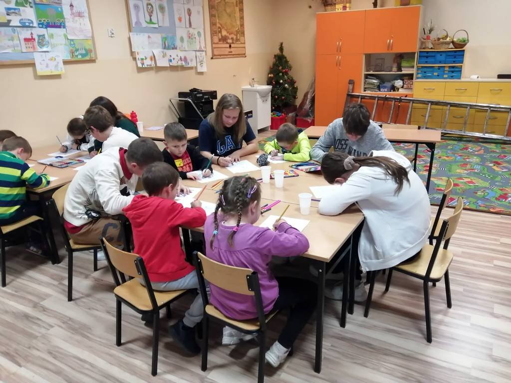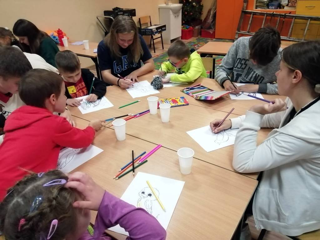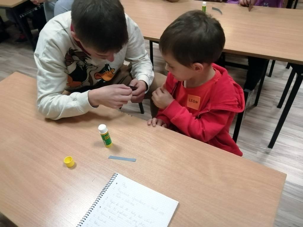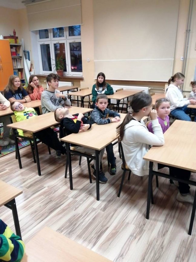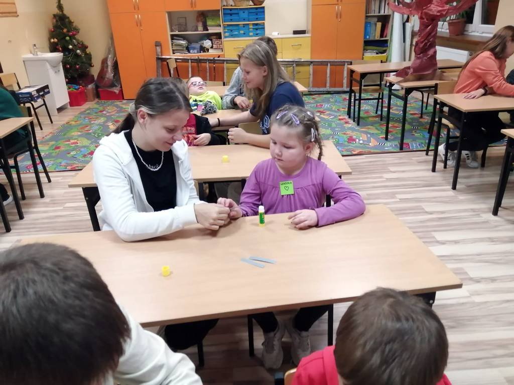 Dzięki pięknym ilustracjom prezentowanym w teatrzyku kamishibai, dzieci nie tylko wysłuchały baśni J. Ch. Andersena „Słowik”, także oglądały karty prezentujące baśń. W części zajęć plastycznych wykonały przy pomocy starszych koleżanek i kolegów papierowego bohatera baśni – słowika. Słuchały odgłosów różnych ptaków odgadując do którego ptaka należy poszczególny dźwięk. Zajęcia zakończyły się wspólną zabawą do „tańca siedmiokroczka”. Dziękujemy wszystkim uczestnikom spotkania  i zapraszamy na kolejne zajęcia.