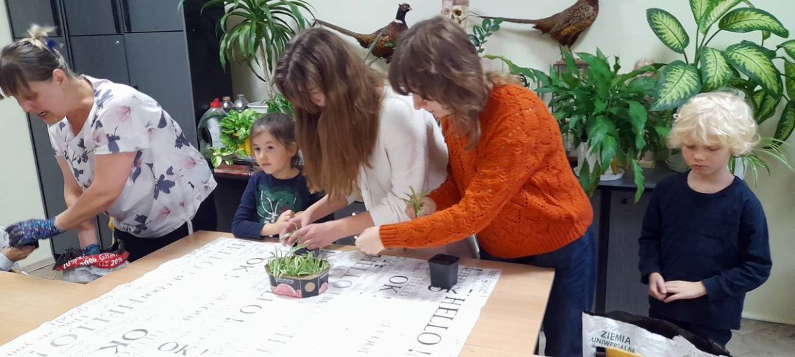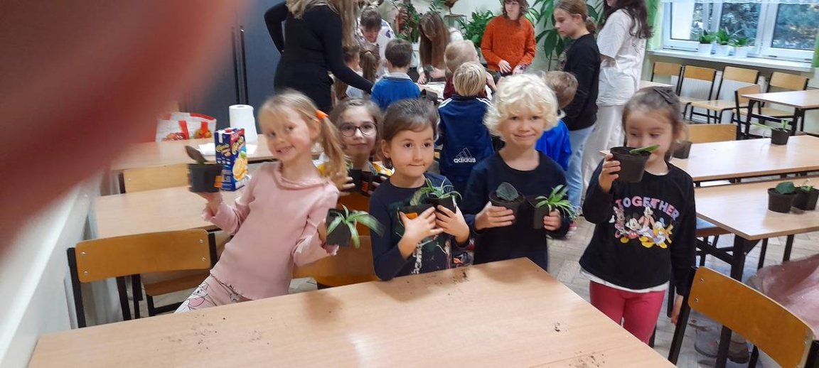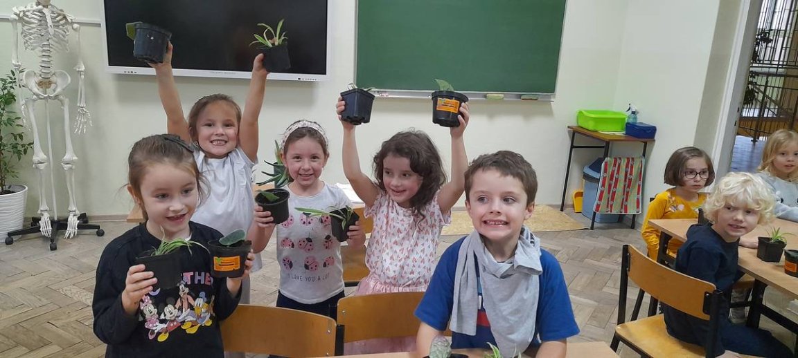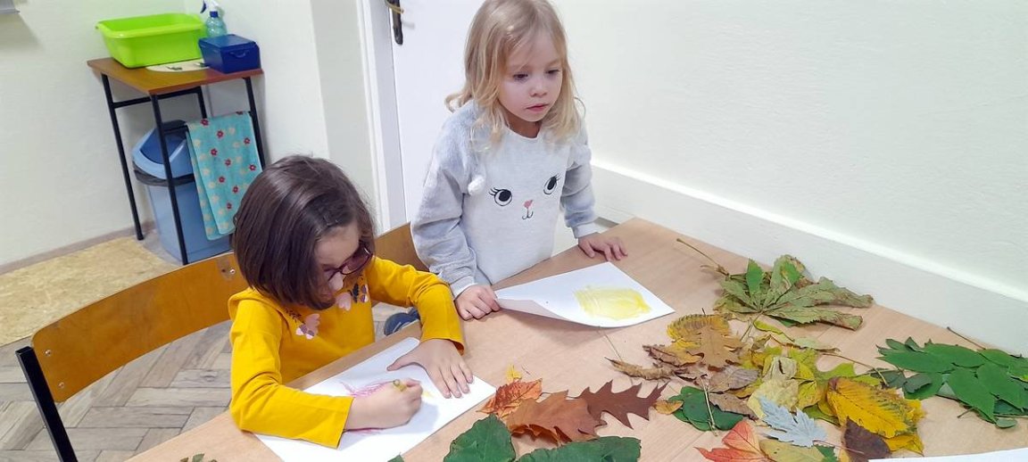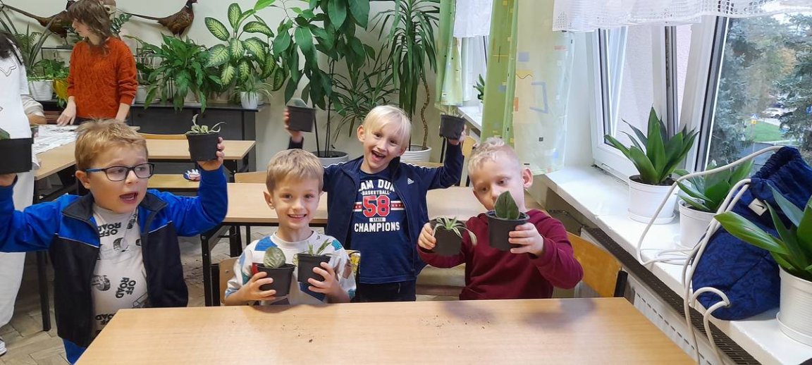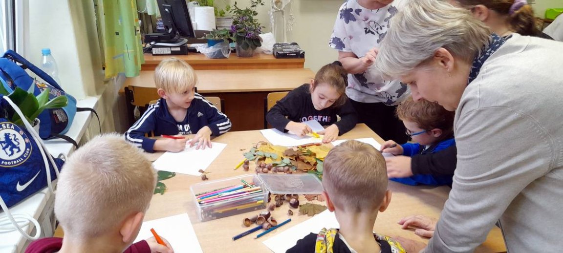 Tematem przewodnim spotkania były zmiany zachodzące w przyrodzie jesienią. Przedszkolaki wykazały się dużą znajomością zwyczajów zwierząt związanych z przygotowaniem do zimy. Dzieci uczyły się różnic między drzewami iglastymi i liściastymi. Poznały budowę liścia pojedynczego i złożonego. Sortowały liście według kształtów i kolorów, poznawały nazwy gatunków drzew liściastych. Przyporządkowywały owoce do gatunków drzew. Następnie z użyciem liści wykonały niezwykle atrakcyjne prace plastyczne metodą frotażu, rozpoznawały również barwy ciepłe. Po krótkiej przerwie na „małe co nieco” dzieci poznały gatunki kwiatów z tropików, które spotykamy w naszych domach, w uprawie całorocznej. Sadziły rozłogi zielistki, aloesy i liście fiołka afrykańskiego, które zabrały do swoich domowych hodowli. Dużym zainteresowaniem cieszyły się kwiatowe puzzle układane na szkolnych komputerach w pracowni informatycznej oraz zabawa w łapanie świetlików na tablicy multimedialnej. Nasi mali goście dużo się nauczyli i świetnie się przy tym bawili. Do zobaczenia na kolejnych spotkaniach.