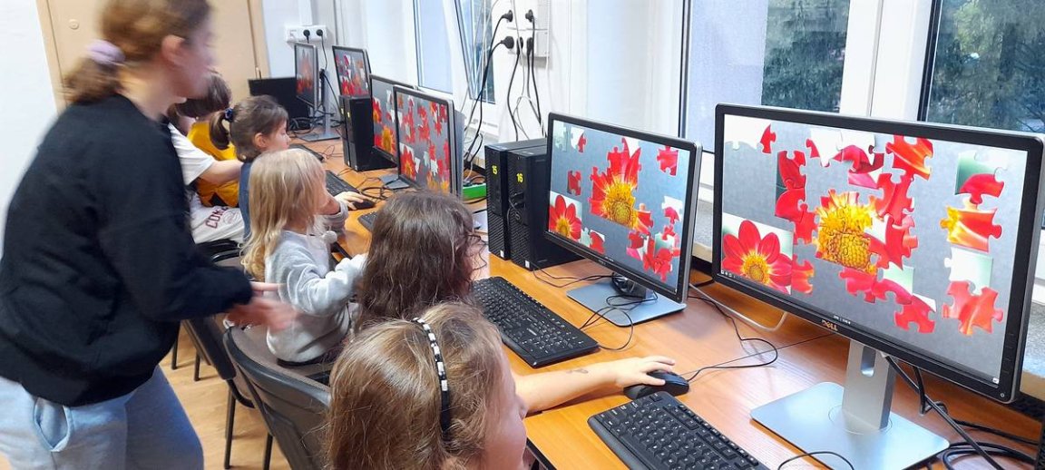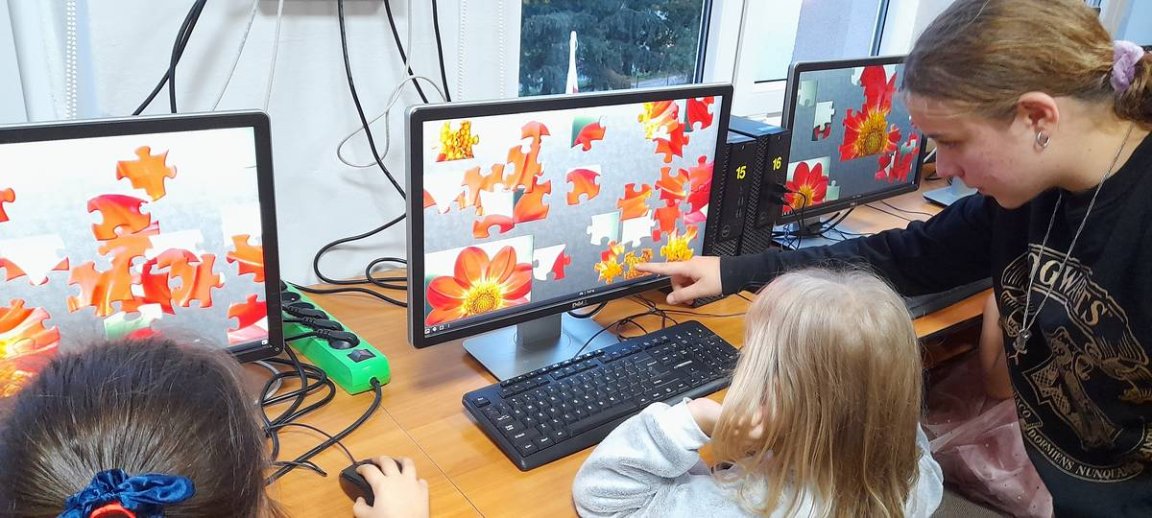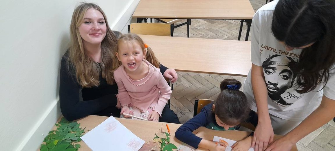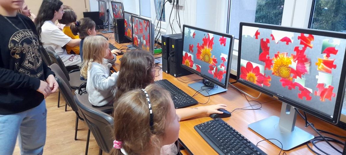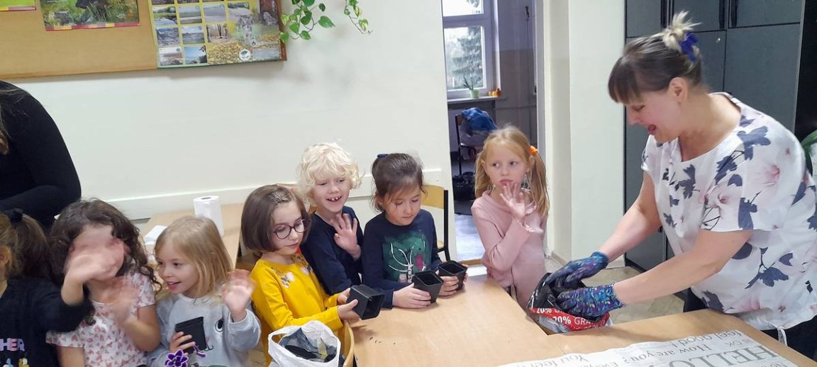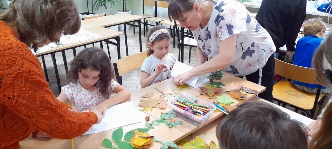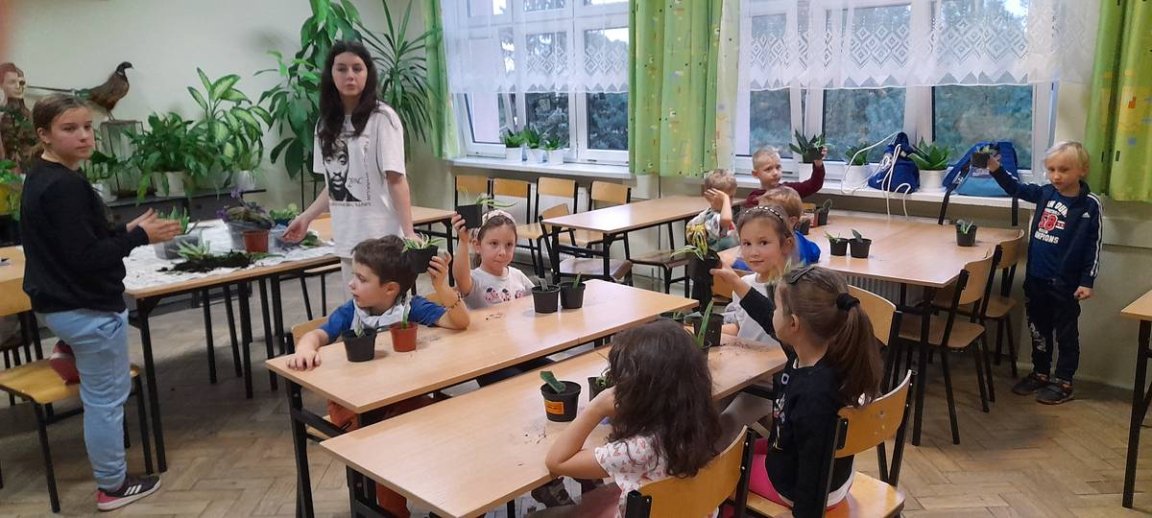 Tematem przewodnim spotkania były zmiany zachodzące w przyrodzie jesienią. Przedszkolaki wykazały się dużą znajomością zwyczajów zwierząt związanych z przygotowaniem do zimy. Dzieci uczyły się różnic między drzewami iglastymi i liściastymi. Poznały budowę liścia pojedynczego i złożonego. Sortowały liście według kształtów i kolorów, poznawały nazwy gatunków drzew liściastych. Przyporządkowywały owoce do gatunków drzew. Następnie z użyciem liści wykonały niezwykle atrakcyjne prace plastyczne metodą frotażu, rozpoznawały również barwy ciepłe. Po krótkiej przerwie na „małe co nieco” dzieci poznały gatunki kwiatów z tropików, które spotykamy w naszych domach, w uprawie całorocznej. Sadziły rozłogi zielistki, aloesy i liście fiołka afrykańskiego, które zabrały do swoich domowych hodowli. Dużym zainteresowaniem cieszyły się kwiatowe puzzle układane na szkolnych komputerach w pracowni informatycznej oraz zabawa w łapanie świetlików na tablicy multimedialnej. Nasi mali goście dużo się nauczyli i świetnie się przy tym bawili. Do zobaczenia na kolejnych spotkaniach.