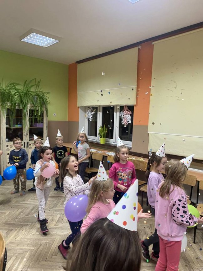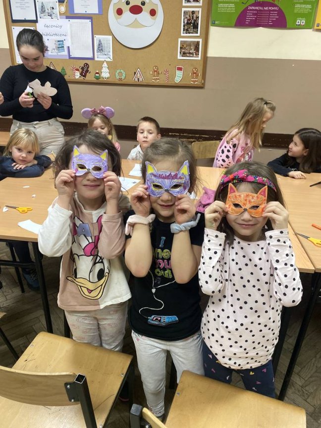 Przesympatyczne przedszkolaki, które regularnie już odwiedzają naszą szkołę, tym razem podczas zajęć poszerzyły swoją wiedzę na temat karnawału. Dzieci wykonały również karnawałowe maski, odgadywały zagadki oraz wzięły udział w zabawie. Kolorowe balony, czapeczki, błyszczące konfetti stanowiły doskonałą oprawę naszego szkolnego karnawału. Było niezwykle sympatycznie i radośnie. Zajęcia prowadziły panie: Jolanta Wierzchowiec i Laura Wojtarowicz.