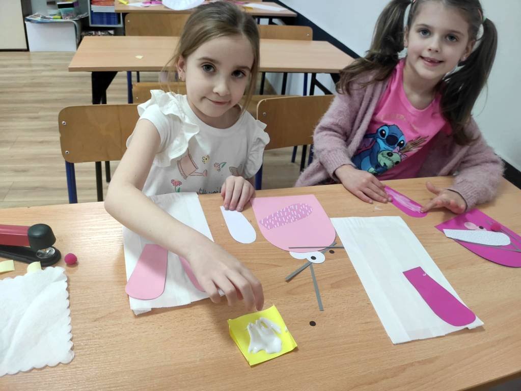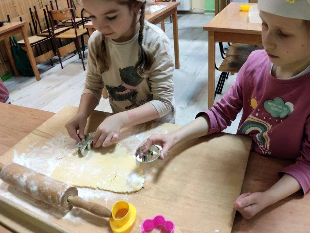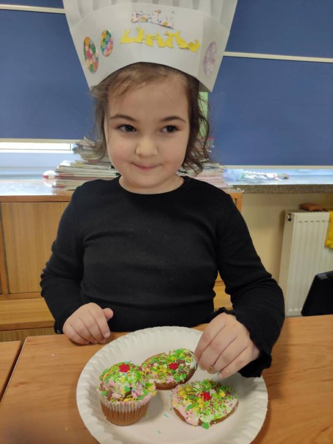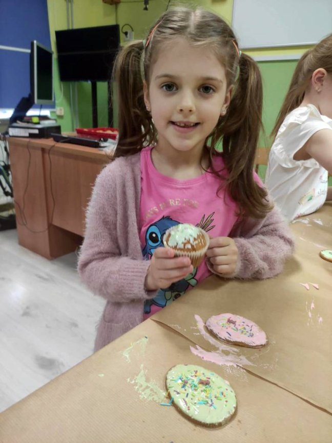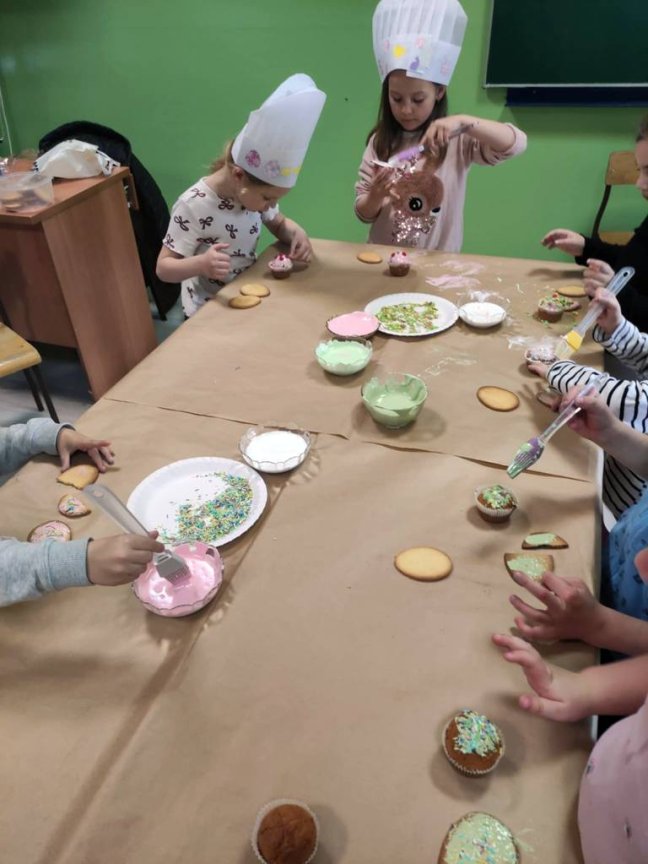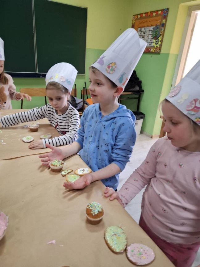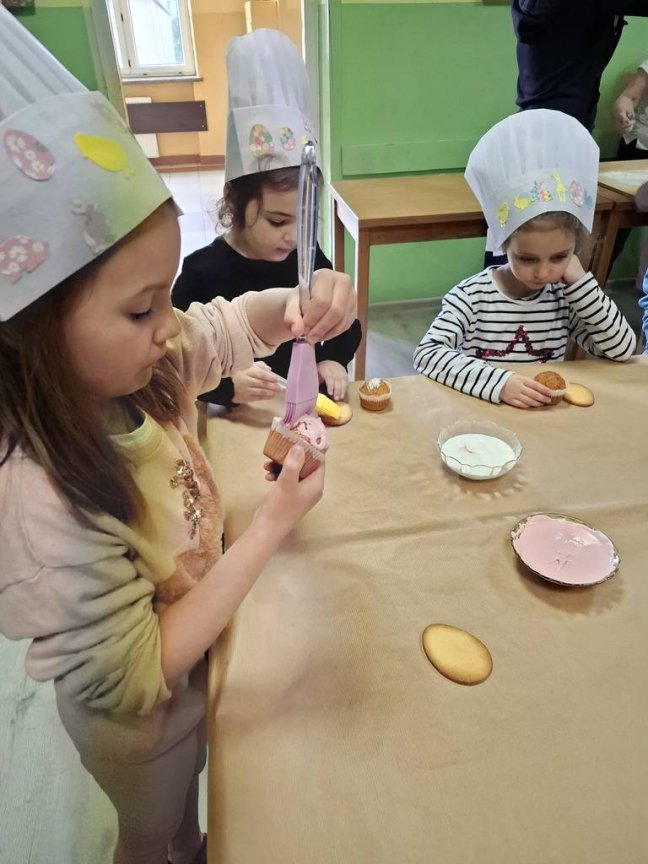Na początek otrzymały czapki kucharskie, które ozdobiły elementami świątecznymi, a następnie zabrały się do wykonania wielkanocnych ciasteczek. Samodzielnie wałkowały ciasto i wykrawały świąteczne jajka, zajączki itp. Tak przygotowane ciasteczka powędrowały do piekarnika. W tym czasie przedszkolaki chętnie dekorowały kolorowymi lukrami już wcześniej przygotowane ciasteczka i mufinki. Pokusie dekorowania, degustacji mufinek i upieczonych cząsteczek nie oparli się również wolontariusze. Następnie dzieci udały się na poczęstunek. Potem przystąpiły do przyklejania wyciętych elementów, z których na papierowych torebkach powstał wielkanocny królik. Do ozdobionych torebeczek dzieci zapakowały upieczone ciasteczka. Zajęcia prowadziły: p.Marta Kamykowska i p. Maria Suwała