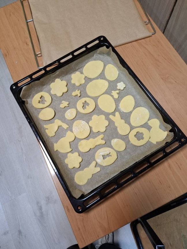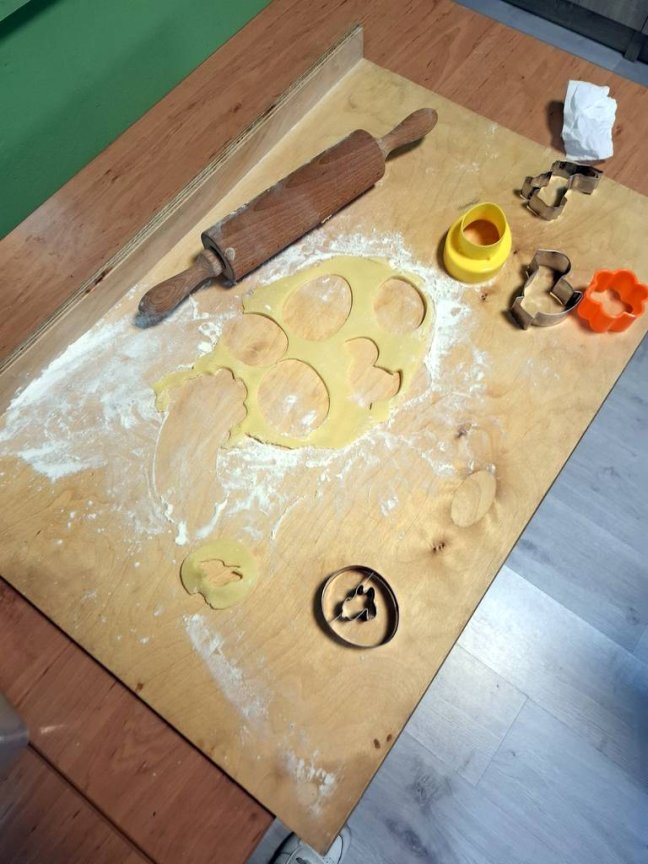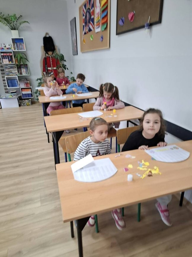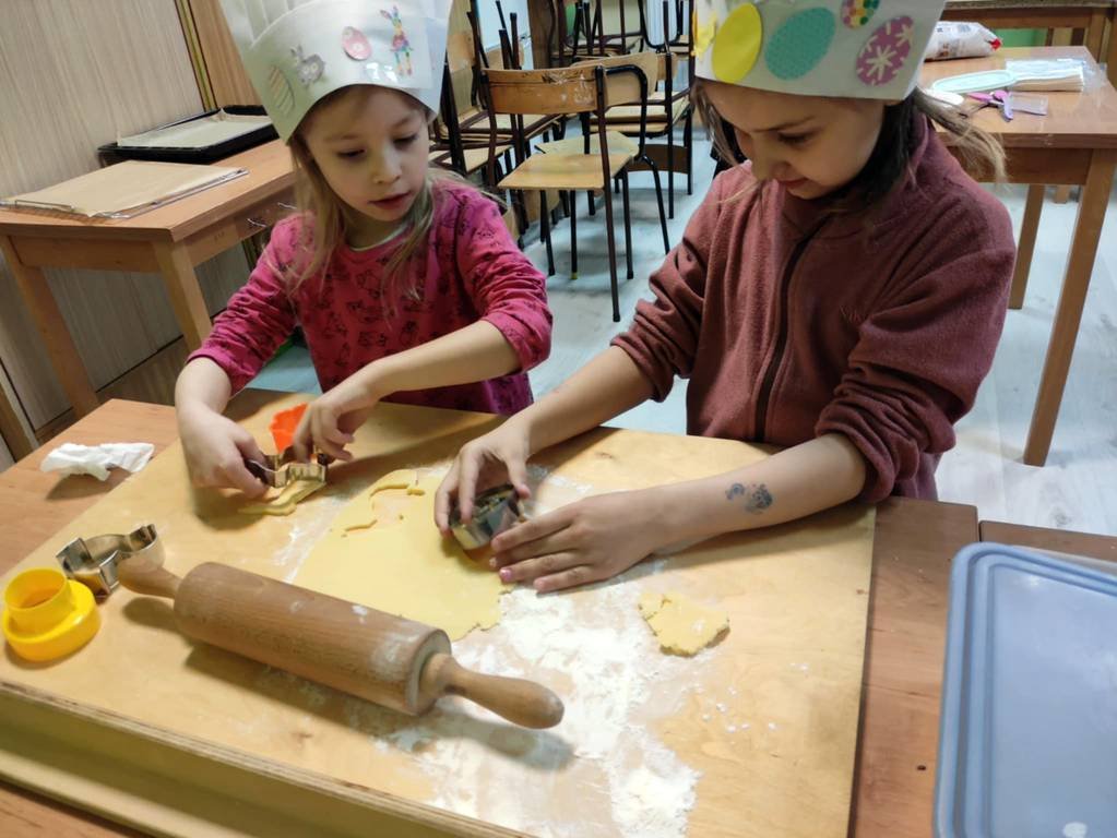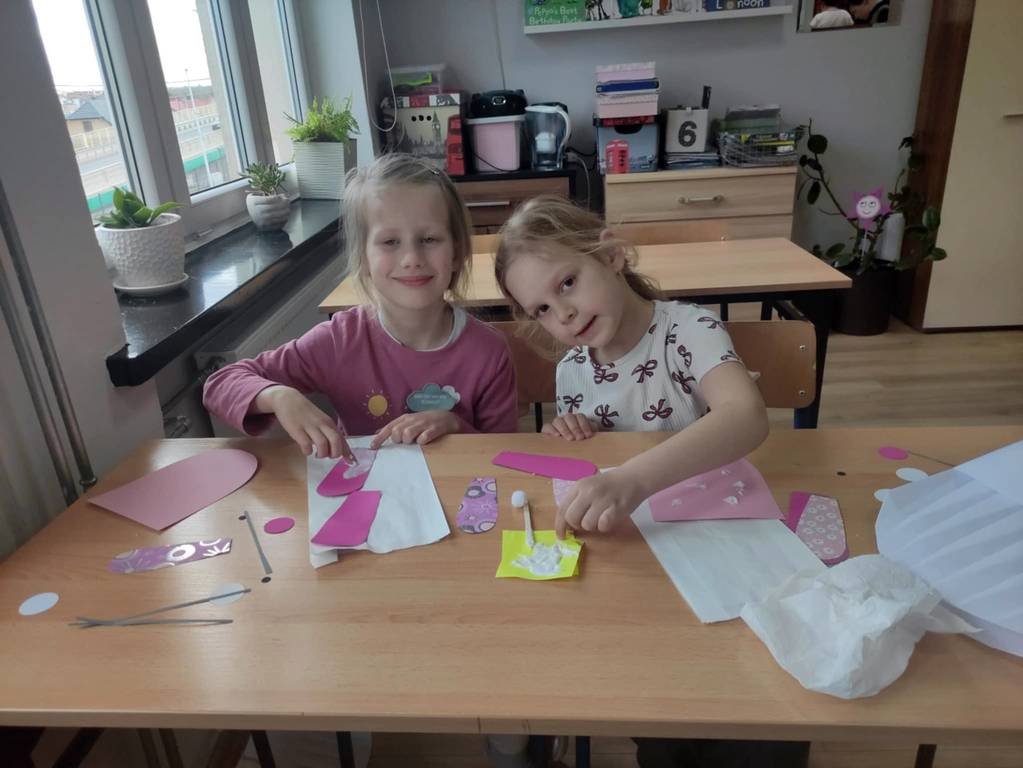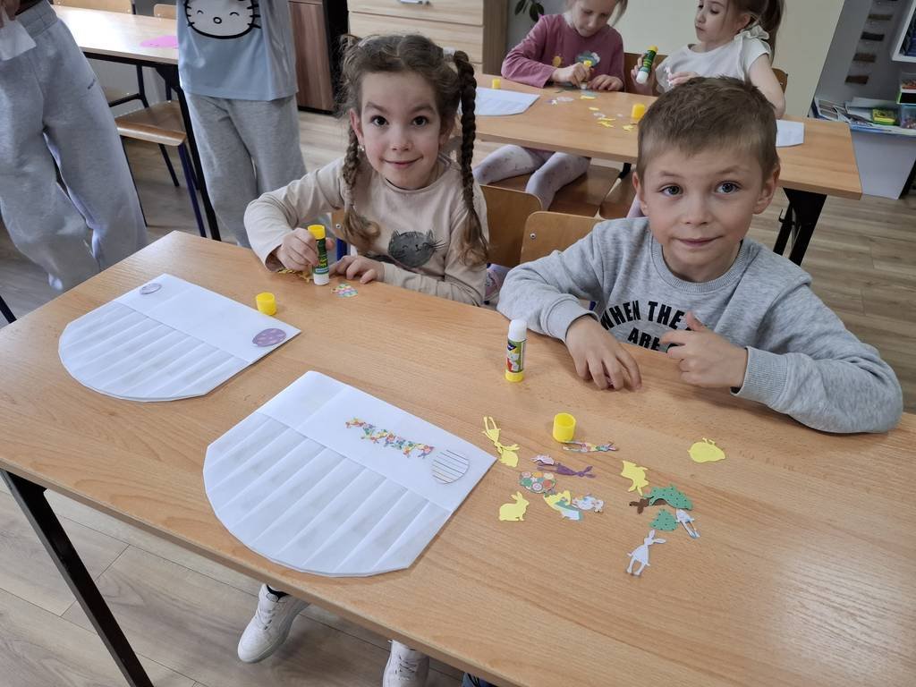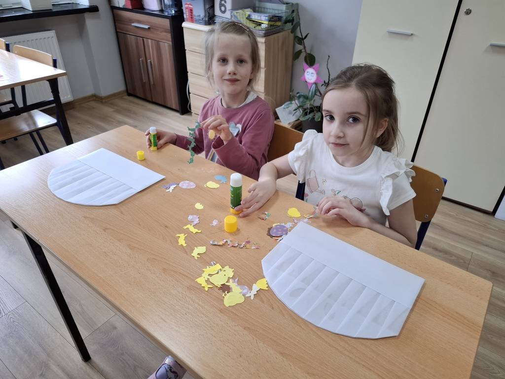 Na początek otrzymały czapki kucharskie, które ozdobiły elementami świątecznymi, a następnie zabrały się do wykonania wielkanocnych ciasteczek. Samodzielnie wałkowały ciasto i wykrawały świąteczne jajka, zajączki itp. Tak przygotowane ciasteczka powędrowały do piekarnika. W tym czasie przedszkolaki chętnie dekorowały kolorowymi lukrami już wcześniej przygotowane ciasteczka i mufinki. Pokusie dekorowania, degustacji mufinek i upieczonych cząsteczek nie oparli się również wolontariusze. Następnie dzieci udały się na poczęstunek. Potem przystąpiły do przyklejania wyciętych elementów, z których na papierowych torebkach powstał wielkanocny królik. Do ozdobionych torebeczek dzieci zapakowały upieczone ciasteczka. Zajęcia prowadziły: p.Marta Kamykowska i p. Maria Suwała