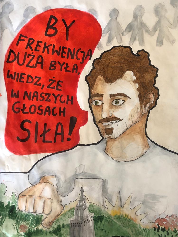 Celem konkursu było propagowanie idei czynnego prawa wyborczego i jego znaczenia dla kształtowania społeczeństwa obywatelskiego, które zna swoje prawa i potrafi odpowiedzialnie z nich korzystać. Warto powtórzyć za poetą: Nie ma poczucia wolności bez poczucia wolności wyboru. Zadaniem uczniów było wykonanie plakatu zachęcającego Polaków do udziału w czerwcowych wyborach prezydenckich. Nadesłano 11 prac, a autorem najciekawszej został Mikołaj Drogoś z klasy 8c. Gratuluję zwycięzcy i dziękuję wszystkim Uczniom za udział w konkursie.