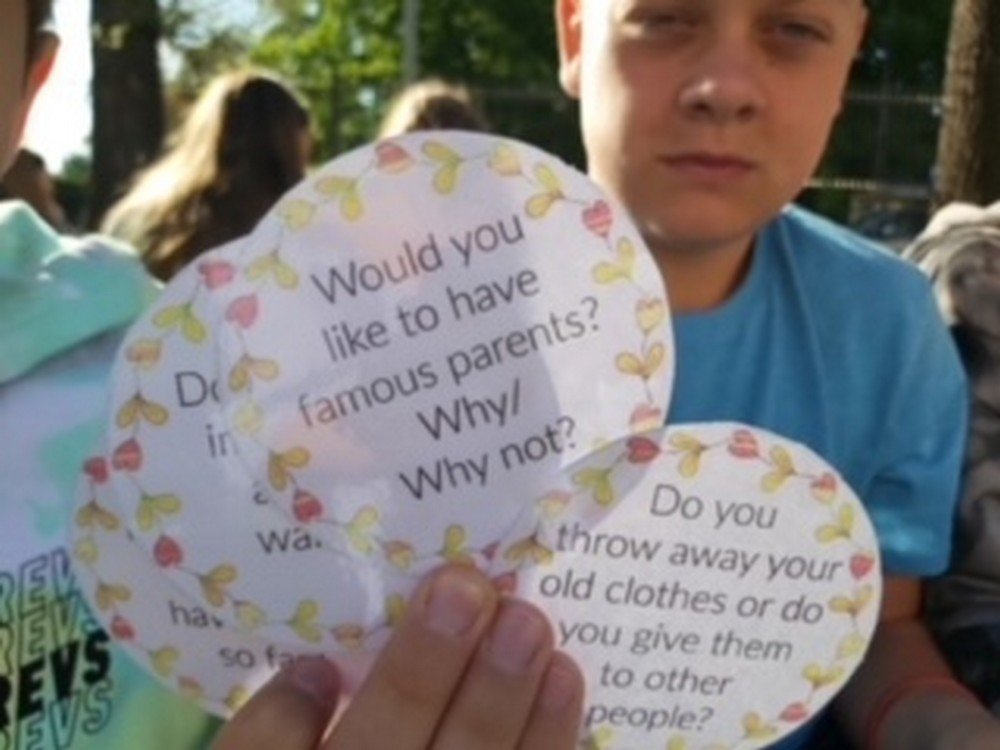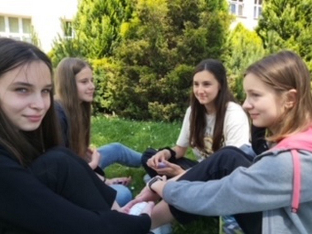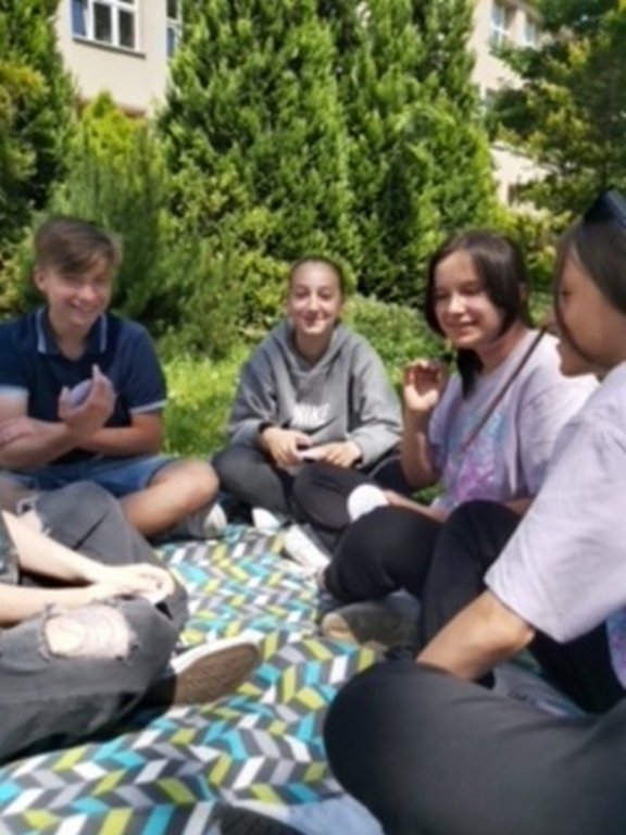 Uczniowie klas Euro przy sprzyjajacej czerwcowej aurze uczestniczą w ciekawych zajęciach jezykowych na świeżym powietrzu. Uczniowie pracują w parach lub grupach, odpowiadają na ciekawe pytania dotyczace codziennego życia i poglądu na różne sprawy życiowe.