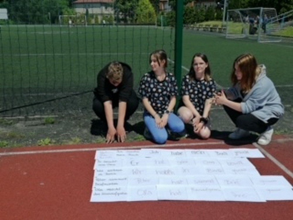 Lekcja języka niemieckiego w 8b odbyła się na świeżym powietrzu. Pracując w grupach uczniowie bawili się, powtarzali materiał i budowali na nowo relacje koleżeńskie.