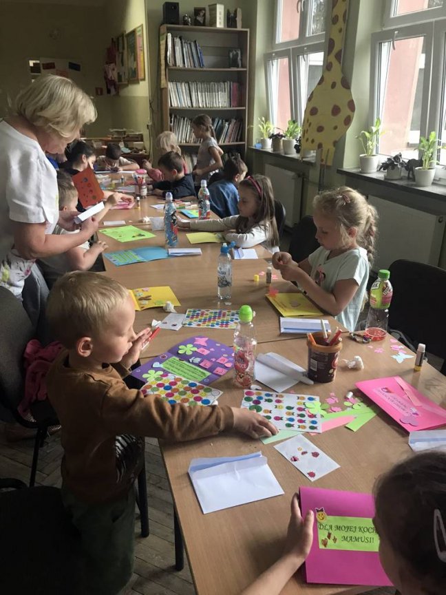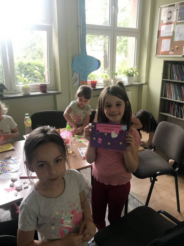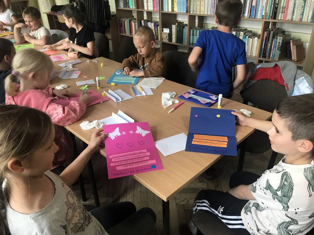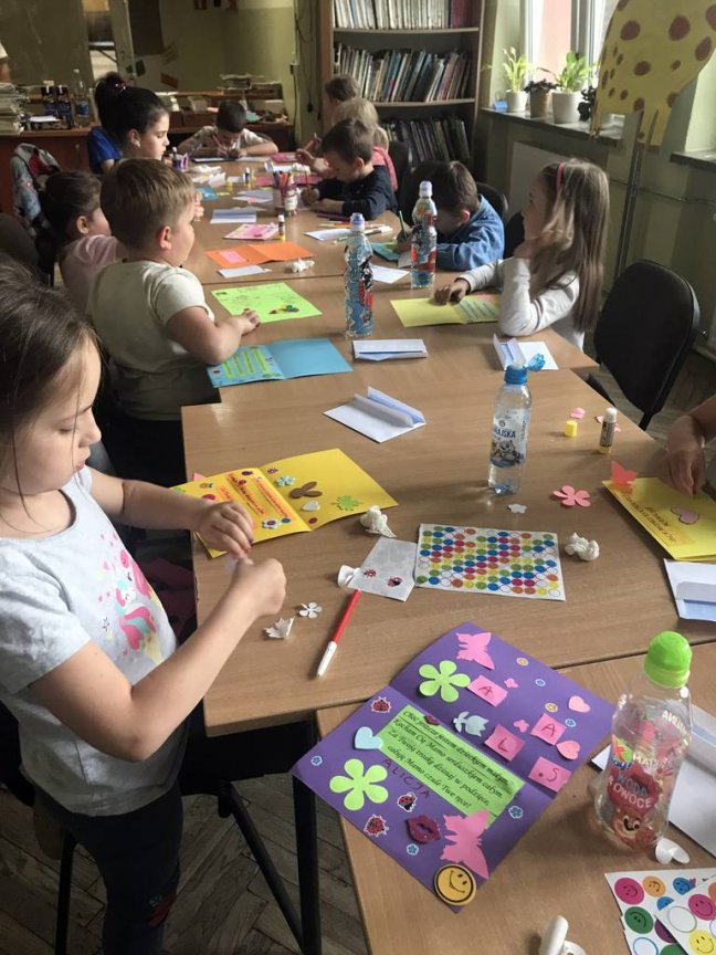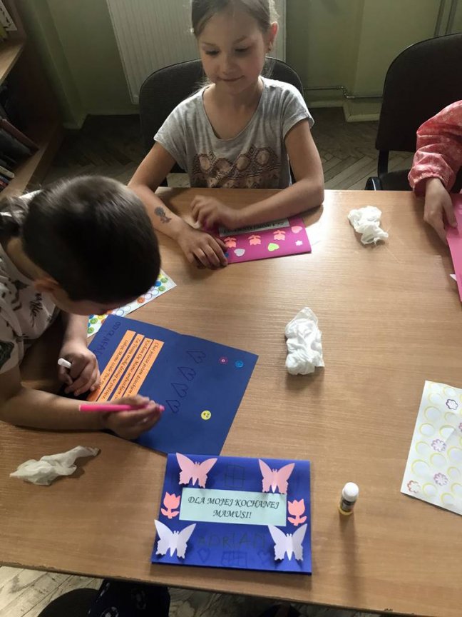 Szybko okazało się, że nasi goście świetnie rymują i są niezwykle kreatywni. Z niewielką pomocą pań udało im się ułożyć piękny wierszyk dla Mam oraz wkleić go do wykonanych przez siebie laurek. Zajęcia odbywały się w sympatycznej i twórczej atmosferze.