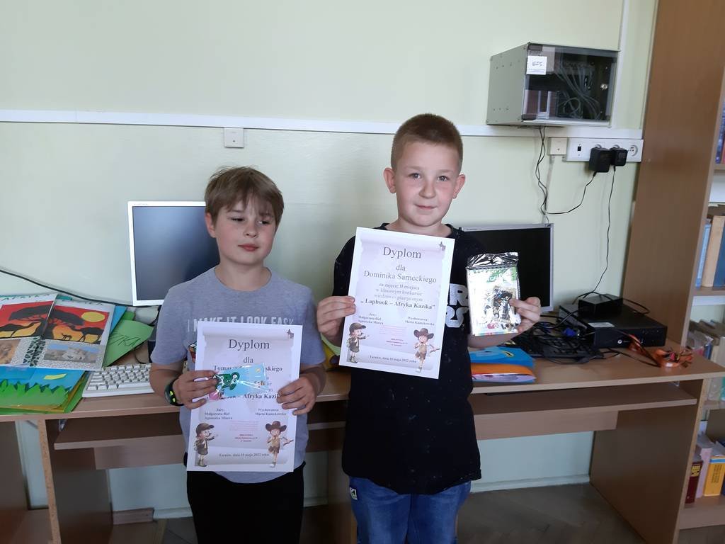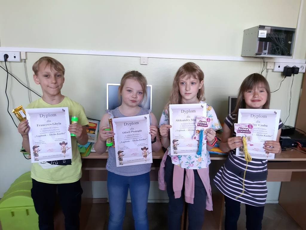 Trzeba przyznać, że uczniowie wykazali się ogromną pomysłowością i kreatywnością. Ich lapbooki były kolorowe, zawierały rysunki przedstawiające bohaterów książek, zdjęcia, opisy miejsc, plany wydarzeń. To wszystko umieszczone zostało w książeczkach, kopertach, kieszonkach i na karteczkach o przeróżnym kształcie i kolorze. Dzięki lapbookom uczniowie rozwijają różne umiejętności, uczą się samodzielności, porządkują i pogłębiają wiedzę. To również wspaniały sposób na spędzenie wolnego czasu. A co najważniejsze to idealny sposób na naukę. Każdy uczeń otrzymał pamiątkowy dyplom i batona, a ośmiu dodatkową nagrodę.