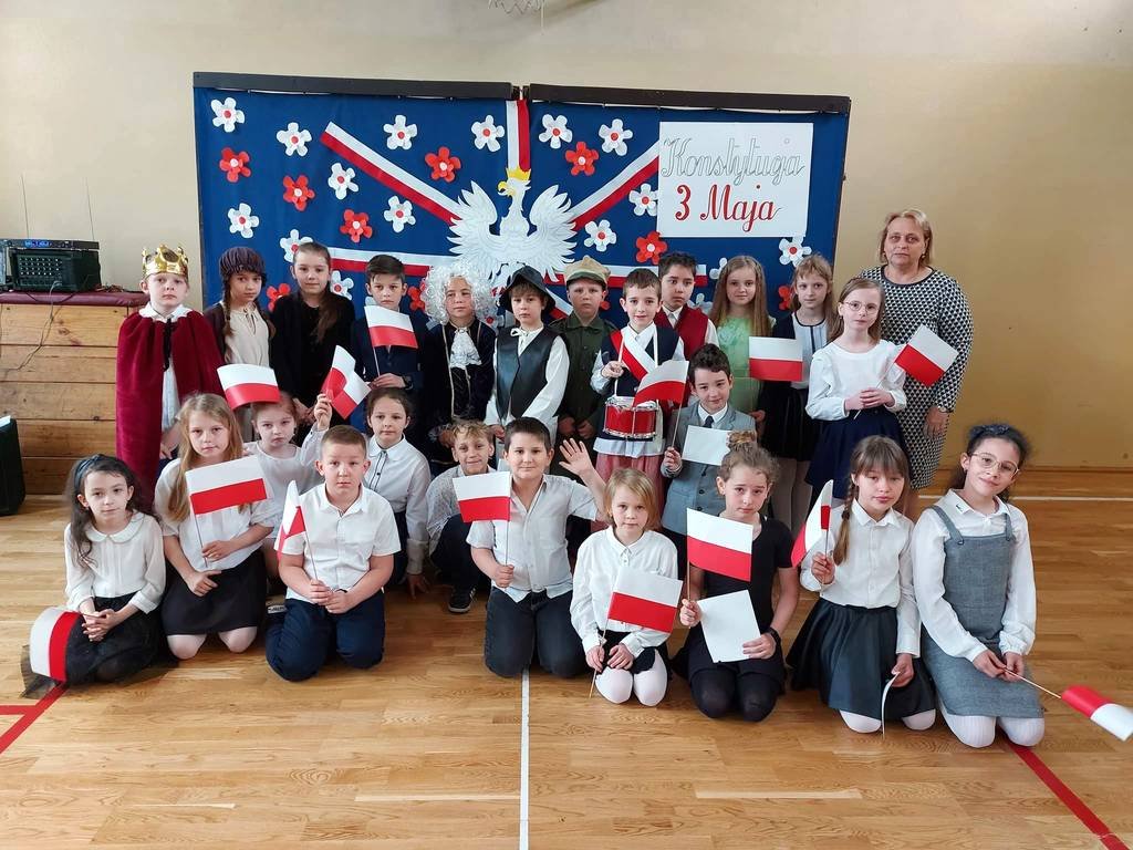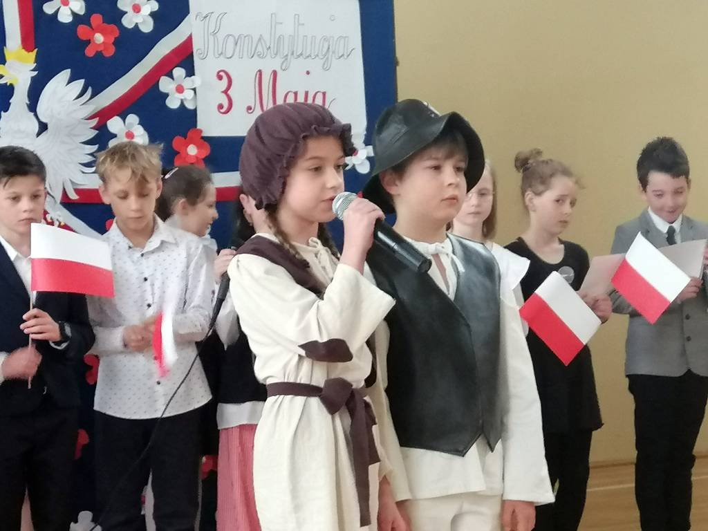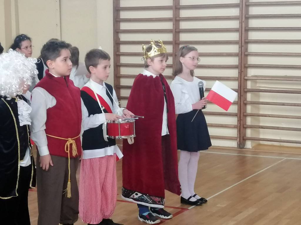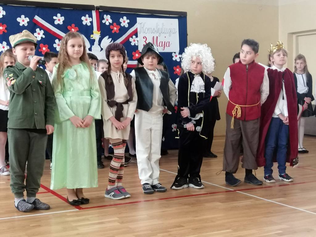 Chcąc przybliżyć uczniom naszej szkoły to ważne wydarzenie z historii naszego kraju, klasa II a z panią Martą przygotowała montaż słowno-muzyczny. Była to okazja do refleksji nad tymi ważnymi wydarzeniami , do pielęgnowania patriotyzmu wśród ucznióworaz do przeżycia dumy z tego, że jest się Polakiem.Uczniowie w pięknych strojach recytowali wiersze, mówiące o tych wydarzeniach, o miłości do Ojczyzny i o Konstytucji. Wiersze były przeplatane piosenkami : „Witaj, majowa jutrzenko…”, „Polonez Trzeciego Maja” itp. Dzięki tej akademii, data 3 Maja 1791 roku pozostanie dla uczniów datą znaczącą. Świat idzie z postępem: komputer, Internet, nowoczesne technologie, ale historia naszego narodu to skarb, który każdy Polak powinien nosić w sercu!