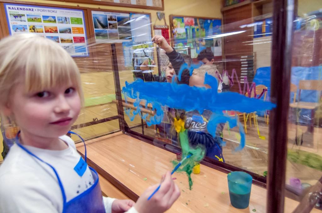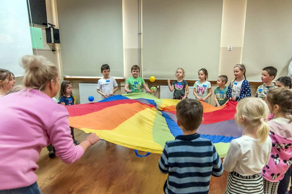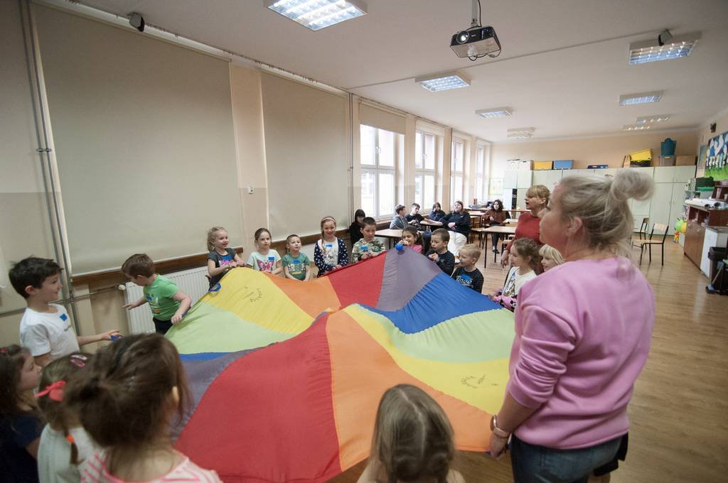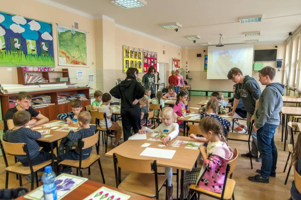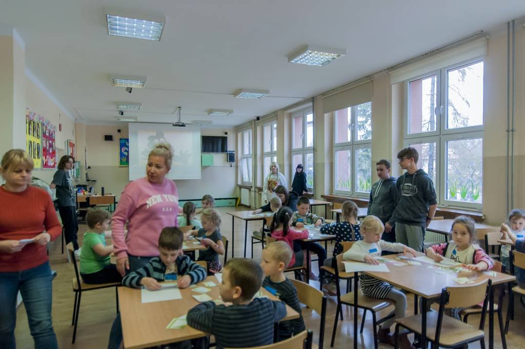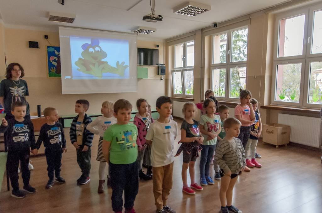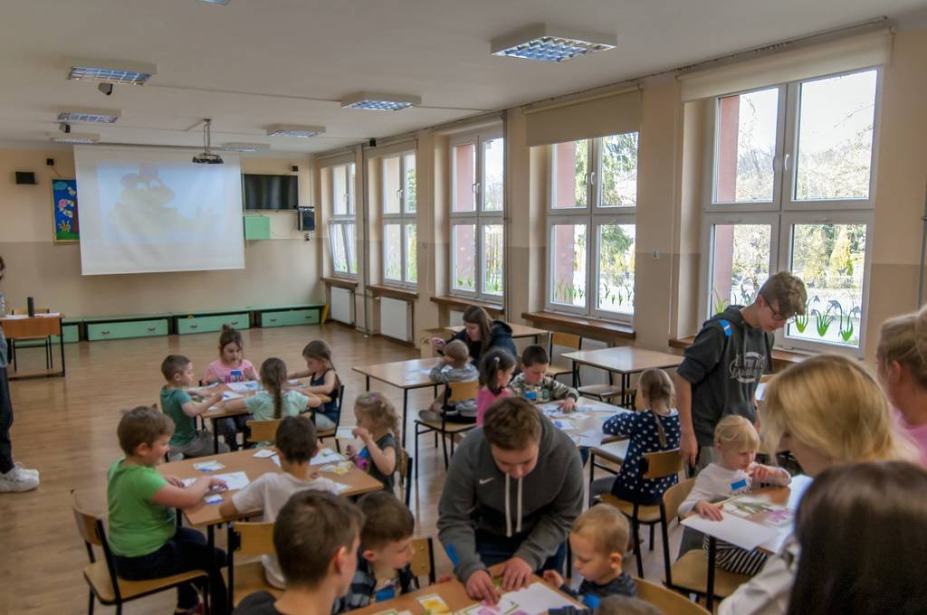 Dnia 5 kwietnia odbyły się kolejne zajęcia dla przedszkolaków. Dzieci poznały świetlicę szkolną, brały udział w zajęciach świetlicowych związanych z tematyką wiosenną. Wykonały pracę plastyczną, nauczyły się piosenki o wiośnie, uczestniczyły w zabawach ruchowych z chustą animacyjną oraz poznały nową technikę malowania na folii. Nie obyło się też bez słodkiego poczęstunku. Mali artyści wyszli bardzo zadowoleni.