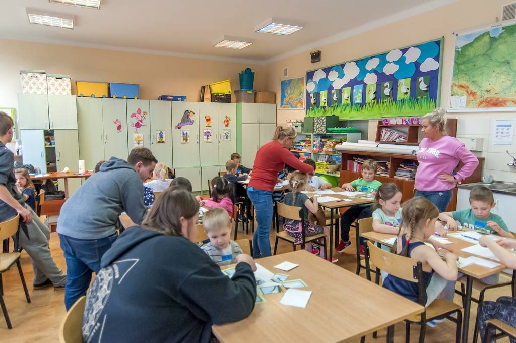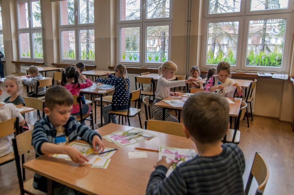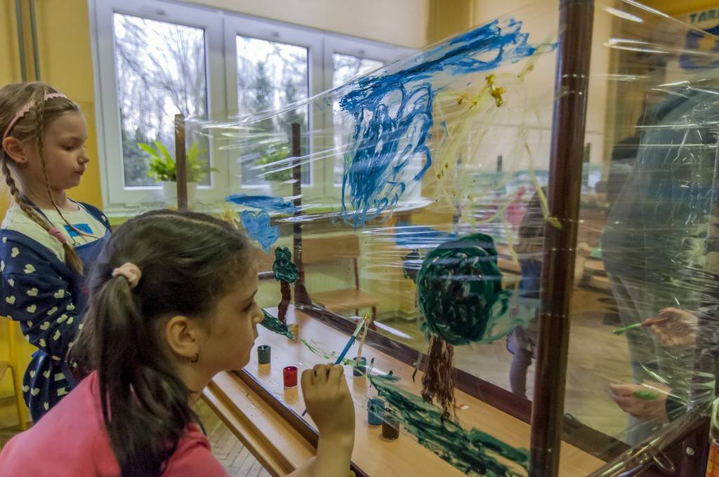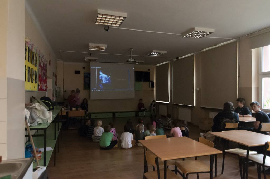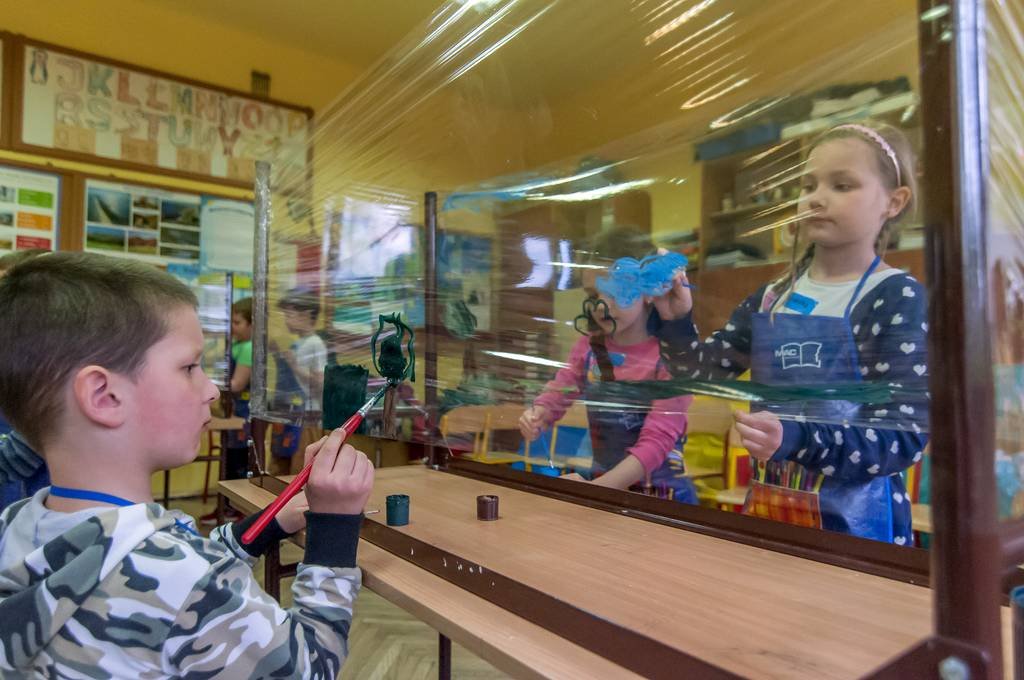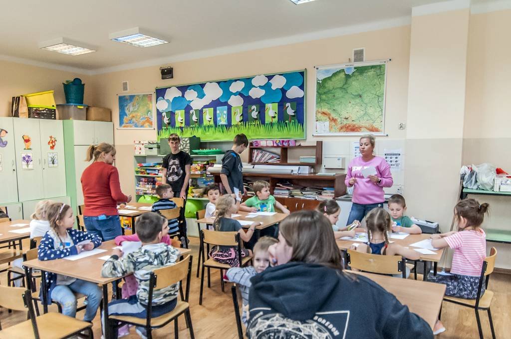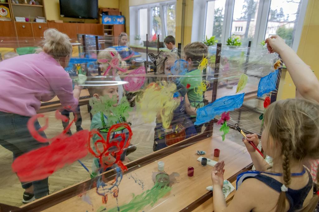Dnia 5 kwietnia odbyły się kolejne zajęcia dla przedszkolaków. Dzieci poznały świetlicę szkolną, brały udział w zajęciach świetlicowych związanych z tematyką wiosenną. Wykonały pracę plastyczną, nauczyły się piosenki o wiośnie, uczestniczyły w zabawach ruchowych z chustą animacyjną oraz poznały nową technikę malowania na folii. Nie obyło się też bez słodkiego poczęstunku. Mali artyści wyszli bardzo zadowoleni.