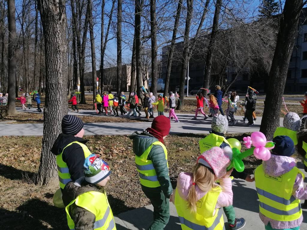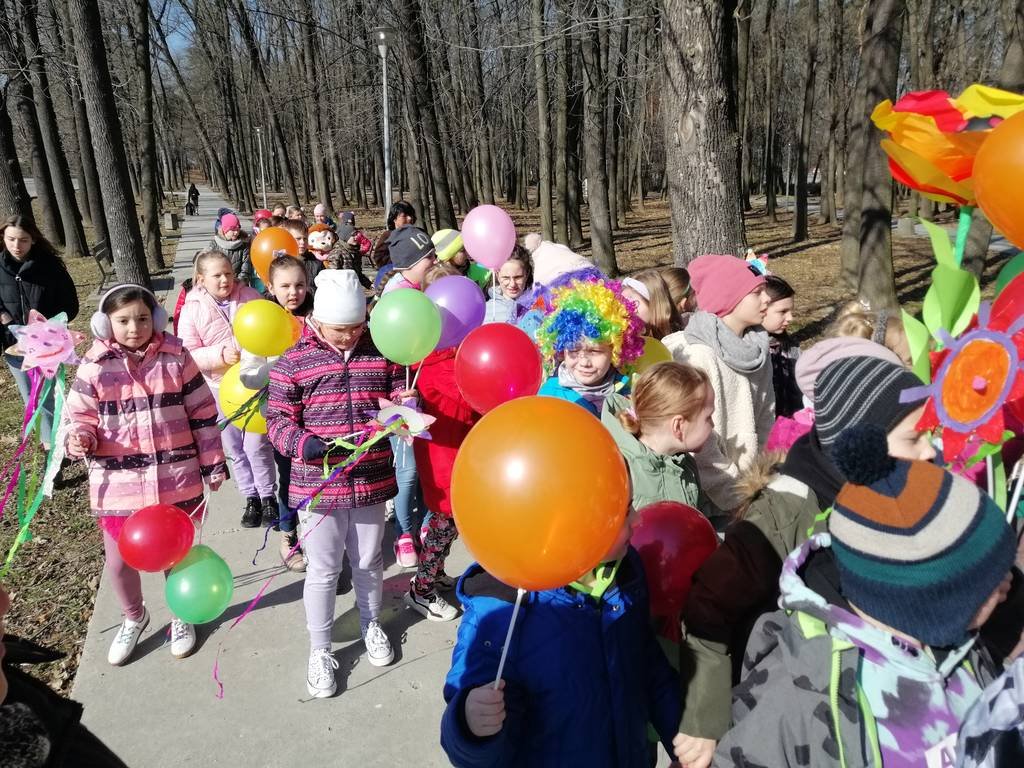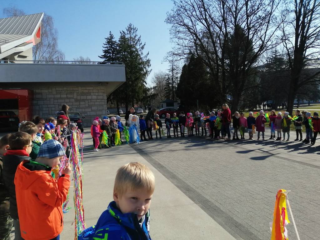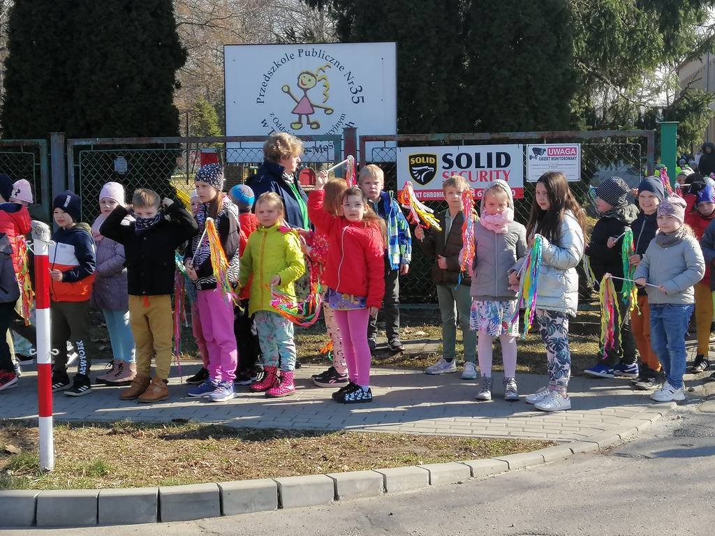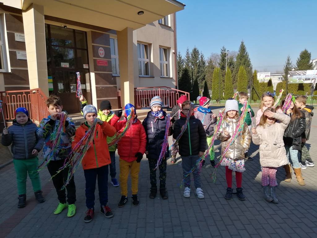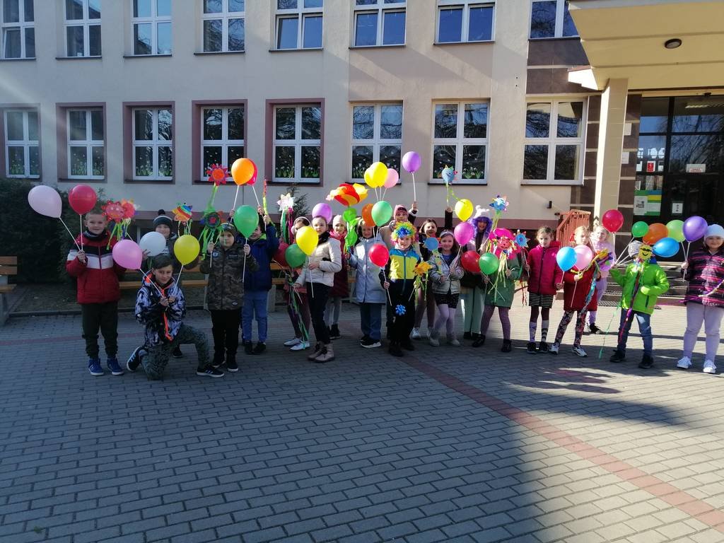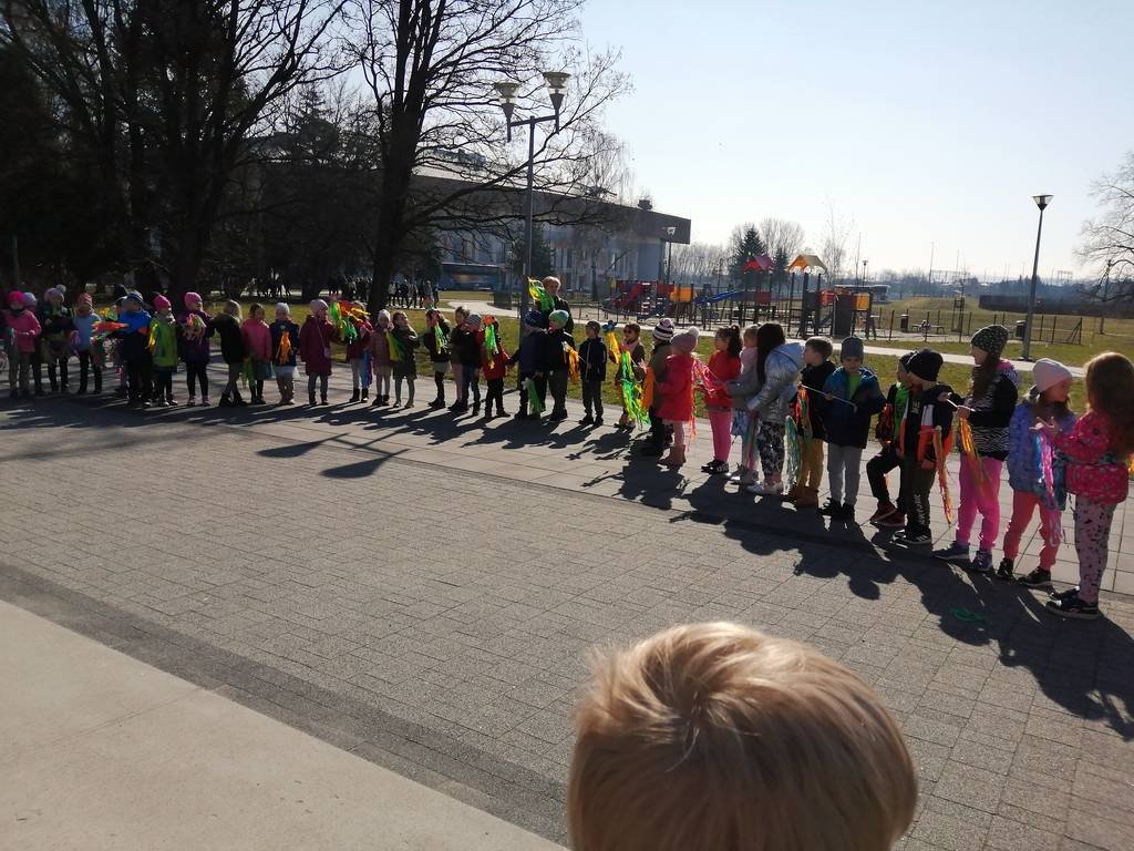 21 marca uczniowie klas 1-3 oraz przedszkolaki z zaprzyjaźnionych Przedszkoli nr 33 i 35 wraz z wychowawcami przywitali kalendarzową wiosnę.