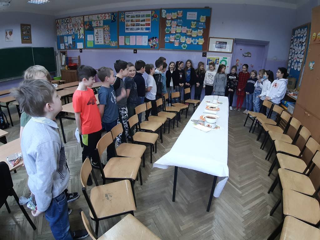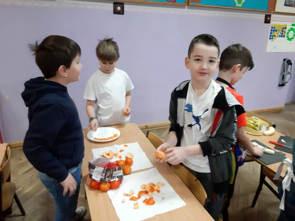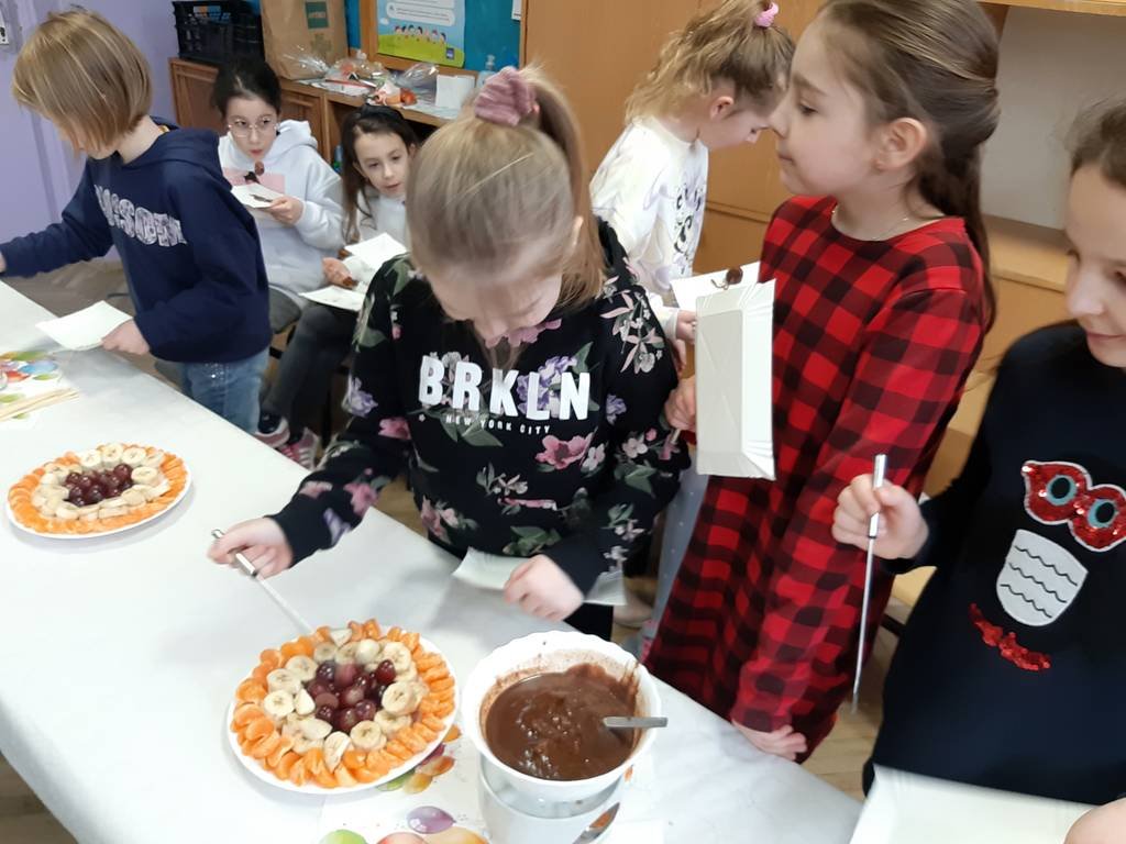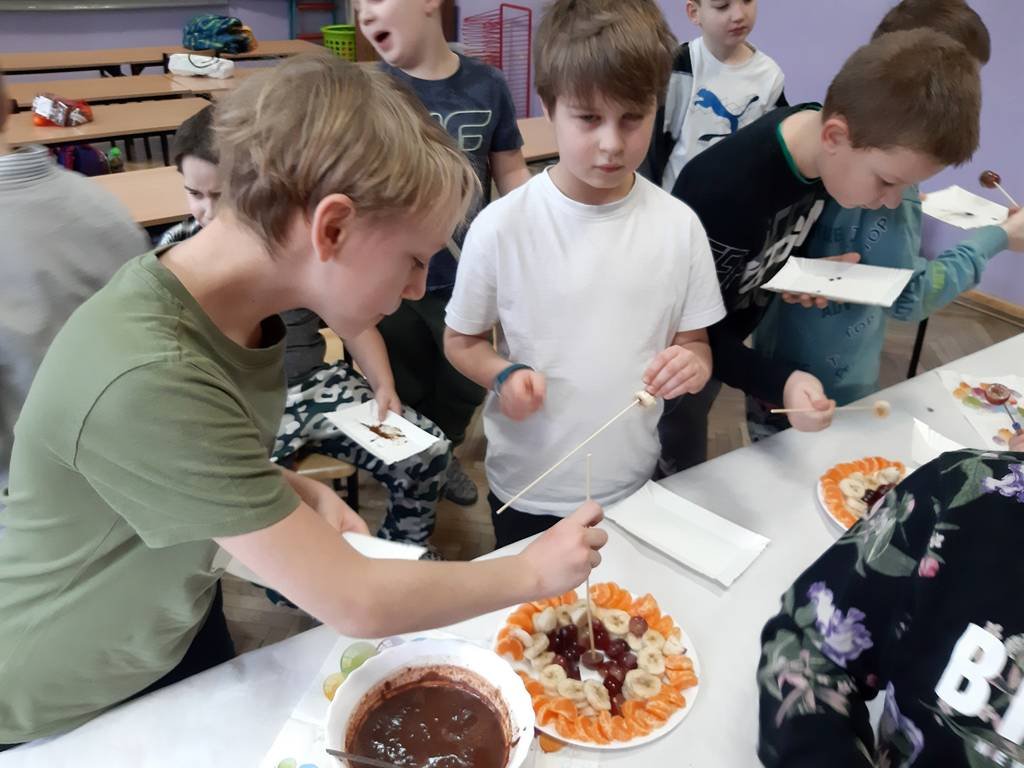 W dniu 8 marca chłopcy złożyli swoim koleżankom i pani Marcie życzenia z okazji „Dnia Kobiet” wręczając drobne upominki i przygotowując samodzielnie fondue czekoladowe z owocami.