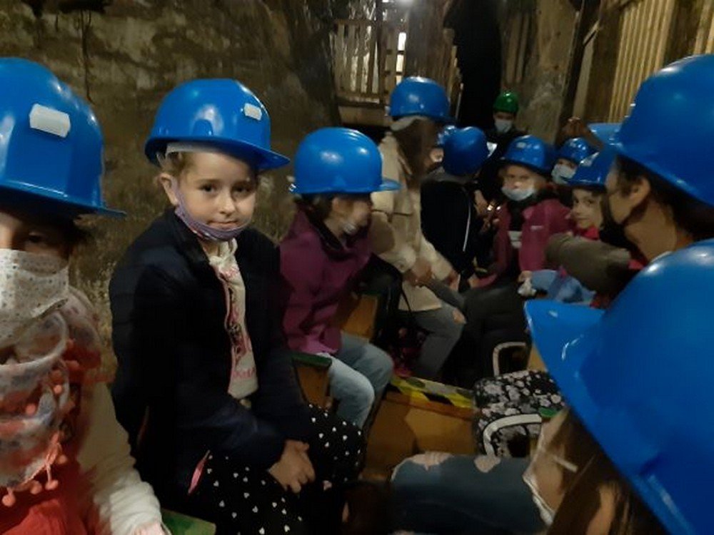 Po spotkaniu z przewodnikiem, zwiedzanie rozpoczęto od zjazdu pod ziemię ciemnym, wilgotnym szybem Campi. Zjazd windą na głębokość 212 m zrobił na niektórych dzieciach duże wrażenie. Tuż po zjeździe pod ziemię, na uczestników wycieczki czekała kolejka, która przemierzała kilometrową trasę pomiędzy szybami Campi i Sutoris. Następnie przewodnik, wykorzystując ekspozycję multimedialną, opowiadał