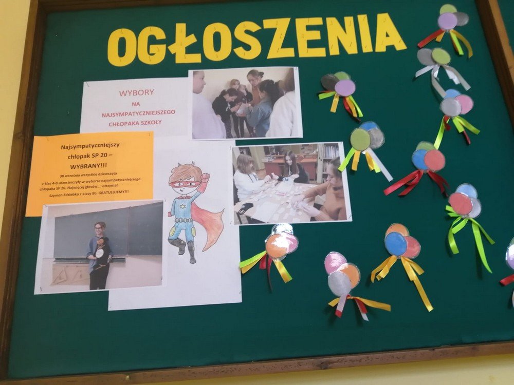Najsympatyczniejszy chłopak SP 20 – WYBRANY. 30 września wszystkie dziewczęta z klas 4-8 uczestniczyły w wyborze najsympatyczniejszego chłopaka naszej szkoły. Najwięcej głosów otrzymał… Szymon Zdziebko z klasy 8b.