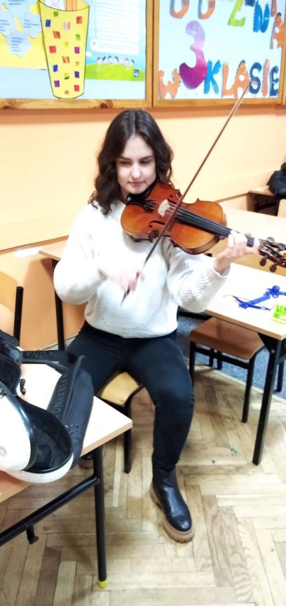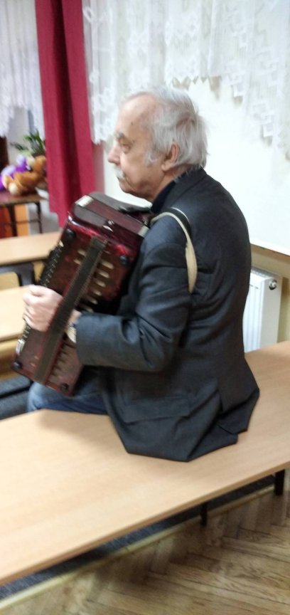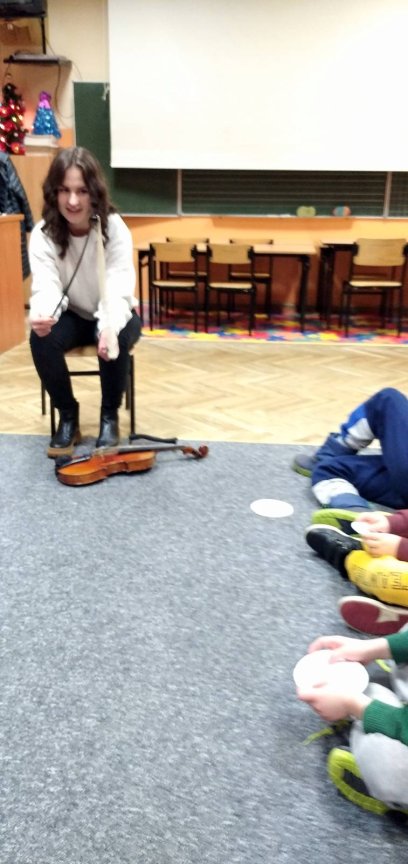 Towarzyszyły im tego dnia dwa instrumenty muzyczne: akordeon i skrzypce. Słuchano, śpiewano, grano, a nawet tańczono. Zabawa w rozpoznawanie instrumentów również przyniosła naszym gościom wiele frajdy. Na koniec przedszkolaki wykonały swoje instrumenty i muzykowały razem ze skrzypcami i akordeonem. Zajęcia przygotowały G.Chruściel i M.Strejczek oraz goście specjalni - muzyczna rodzina Strejczek.