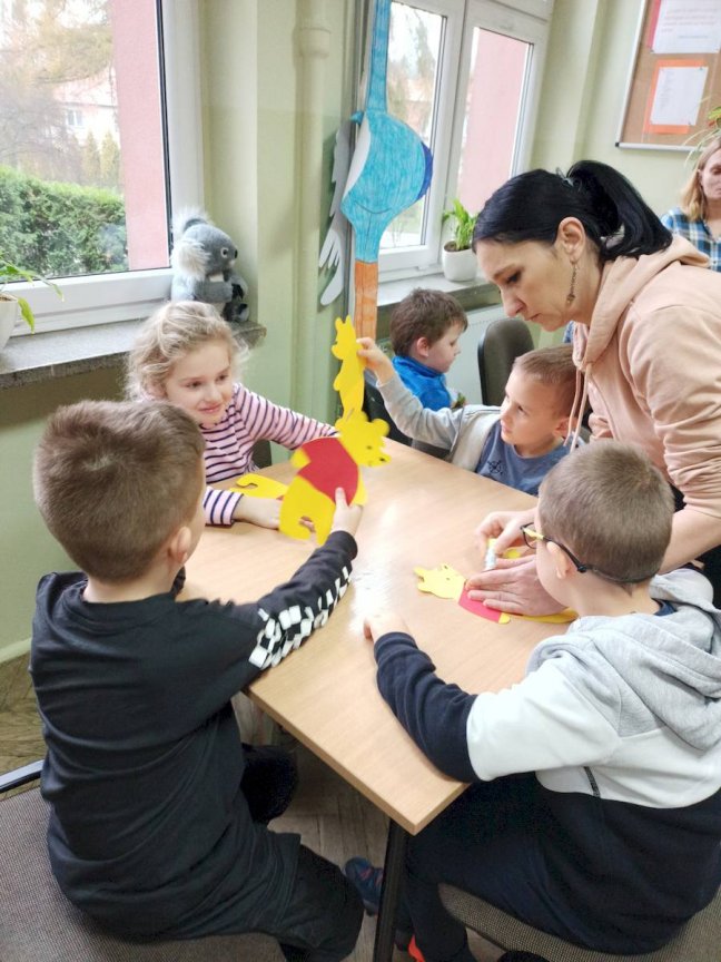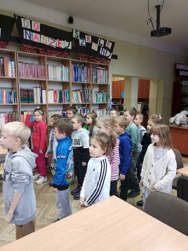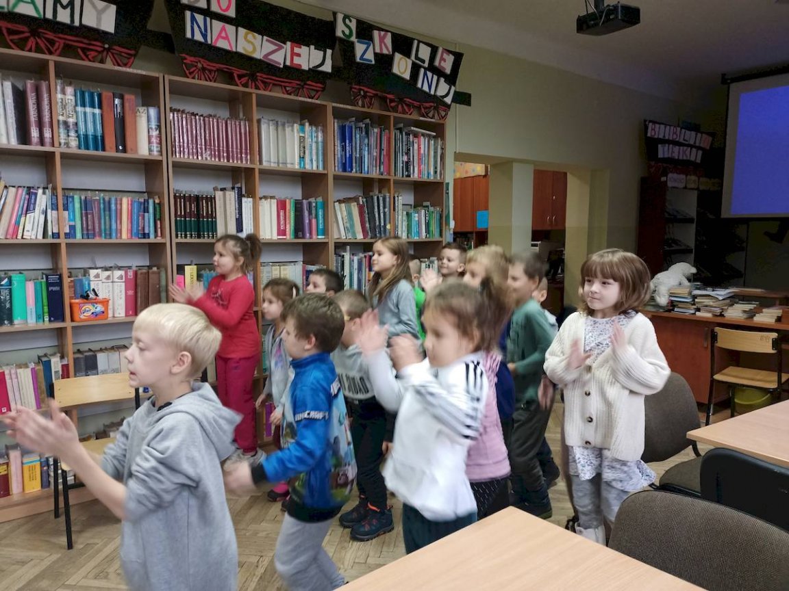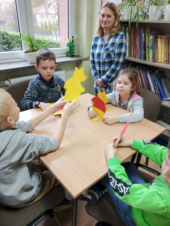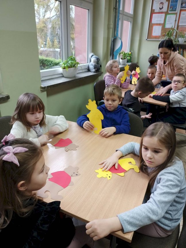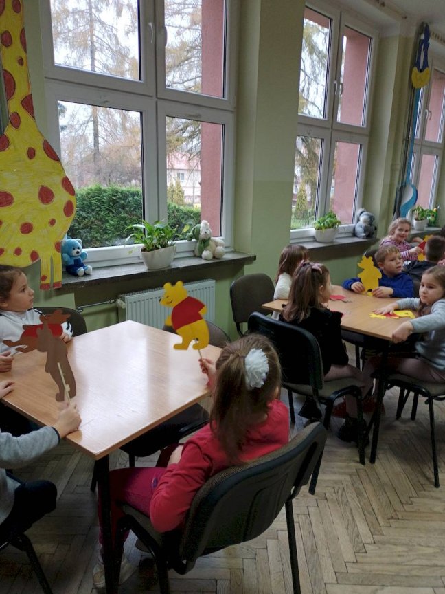 Dzieci z Przedszkola nr 35, które zostały zaproszone do naszej szkoły, miały okazję zapoznać się z historią powstania pierwszego pluszowego misia, książkami, w których bohaterami są misie oraz oglądnąć prezentację multimedialną o gatunkach i życiu prawdziwych niedźwiedzi. Był również czas na zabawę, dzieci tańczyły do piosenki pt. „Gdy szczęśliwy jesteś, to z Kubusiem skacz”! Na zajęciach plastycznych nasi mali goście ubierali przygotowane misie w kubraczki. Spotkanie zakończyło się „małym co nieco” - przysmakiem Kubusia Puchatka. Każde dziecko otrzymało Medal Przyjaciela Pluszowego Misia. Dziękujemy wszystkim za spotkanie.