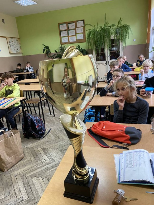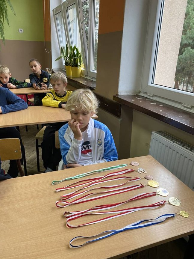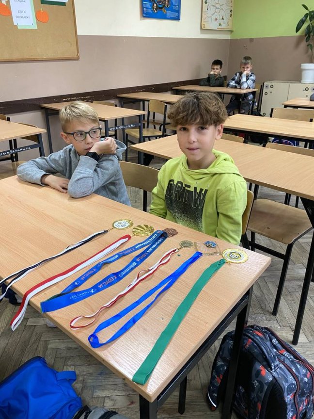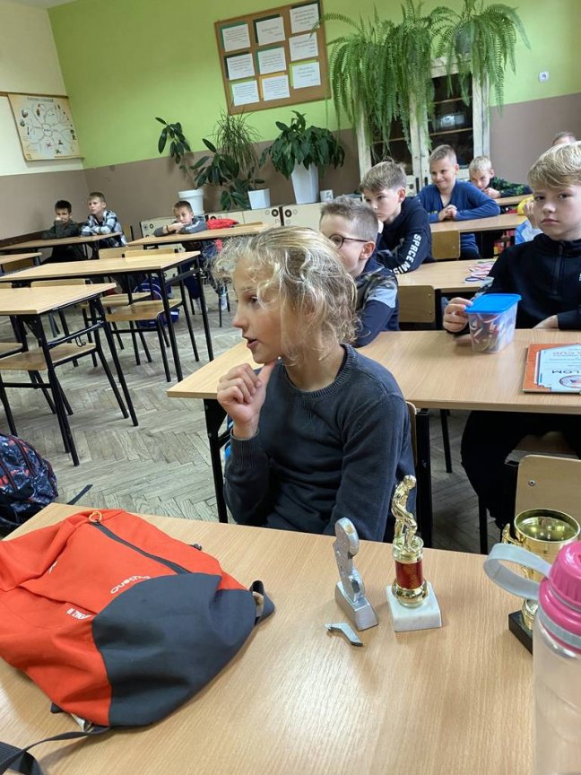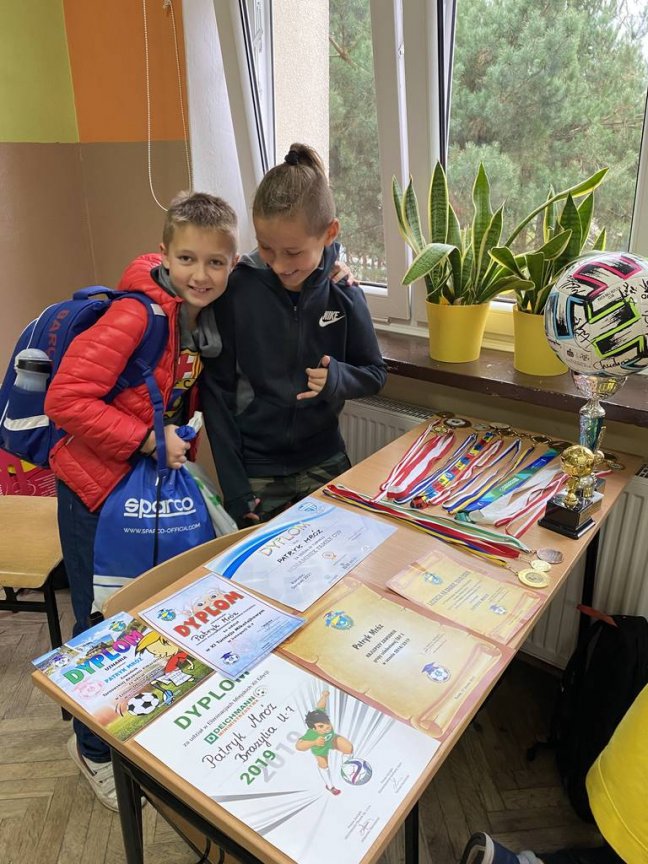 Młodzi piłkarze z zapartym tchem słuchali historii Tej słynnej olimpijki z 1992 roku. Na temat historii pierwszych olimpiad oraz spektakularnych osiągnięć swojej mamy bardzo ciekawie opowiadała córka p. Ewy - Oliwia Kalisz. Chłopcy mieli okazję oglądnąć masę pamiątek olimpijskich oraz podpytać panią Ewę jaki jest sposób na osiągnięcie tak wielkich sukcesów sportowych. Odpowiedź naszego gościa była jednoznaczna: ciężka praca. Tego dnia uczniowie przynieśli do klasy również swoje medale – te pierwsze w ich życiu, jak i te zdobyte całkiem niedawno. A dorobek młodych sportowców jest naprawdę imponujący.