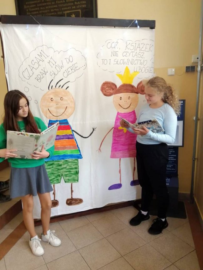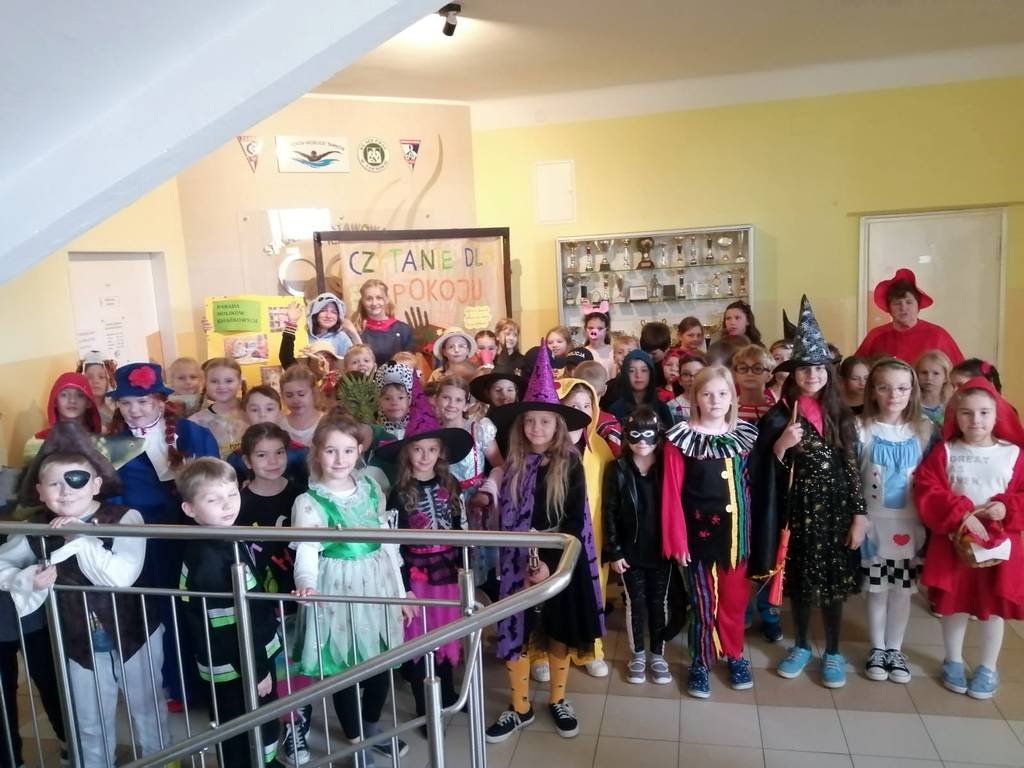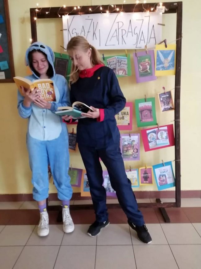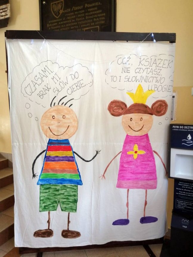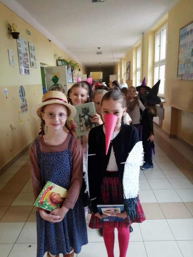 W tym roku również zaproponowaliśmy zabawę dla starszych i młodszych czytelników. Dla uczniów klas młodszych przeprowadziliśmy „Paradę Molików”- uczniowie przebrali się za ulubionych bohaterów książkowych. Parada pod przewodnictwem prowadzących Oliwii i Nadii, głośno zaznaczając swą obecność, przeszła korytarzami szkoły dając dzieciom dużo radości. Uczniowie klas starszych przygotowali plakaty reklamujące czytanie, odpowiadając na hasło tegorocznych obchodów „Czytanie dla pokoju”. Przygotowali również inspirujące foto - ścianki do zdjęć, na których tle chętnie pozowali z ulubionymi książkami.