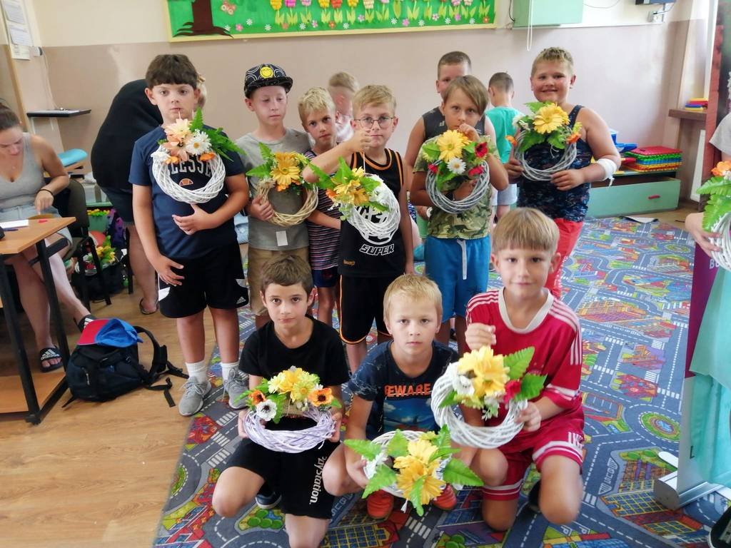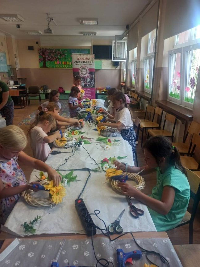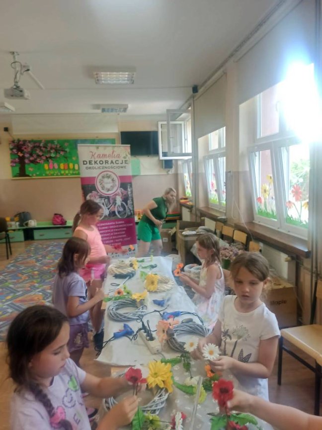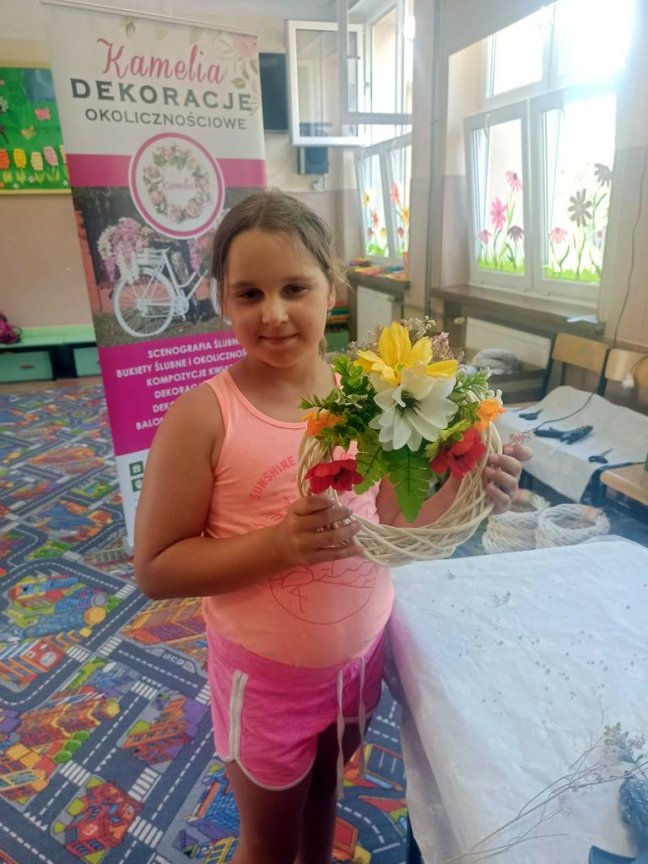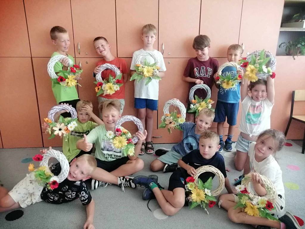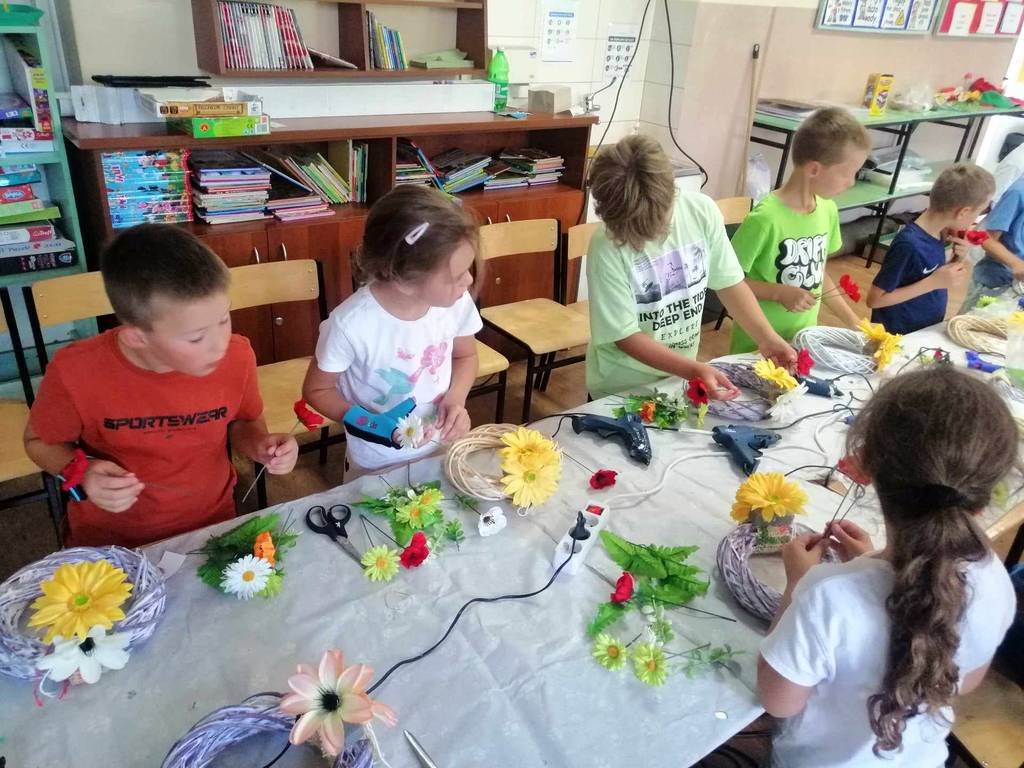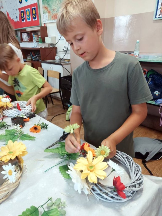 Po obiedzie dzięki właścicielce firmy Dekoracje Okolicznościowe „Kamelia”, która poprowadziła z nami niezwykle inspirujące zajęcia z florystyki wykonaliśmy piękną kompozycję ułożoną z kwiatów na wianku. Ten dzień zakończyliśmy bardzo kreatywnie i twórczo.
