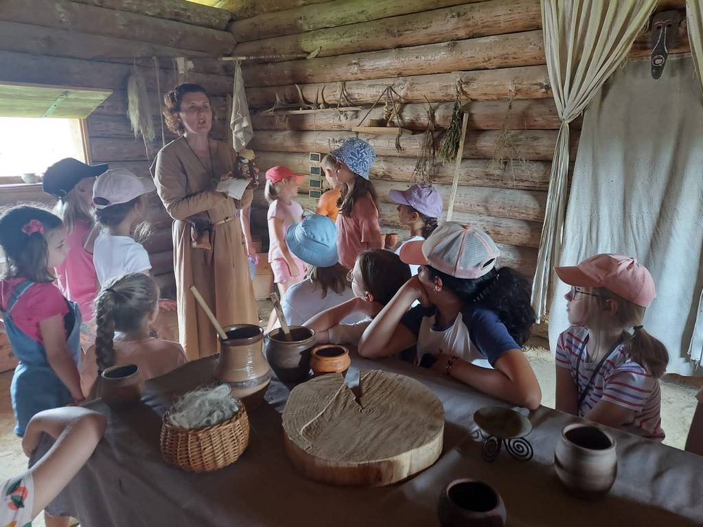 W niezwykłą przygodę zabrał ich bosonogi, młody woj. Małomir. Uczniowie mogli zobaczyć chaty, ich wyposażenie, naczynia, ubrania, narzędzia walki, którymi posługiwano się w tamtych czasach.