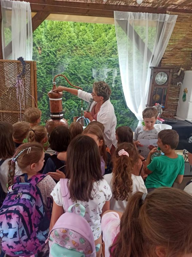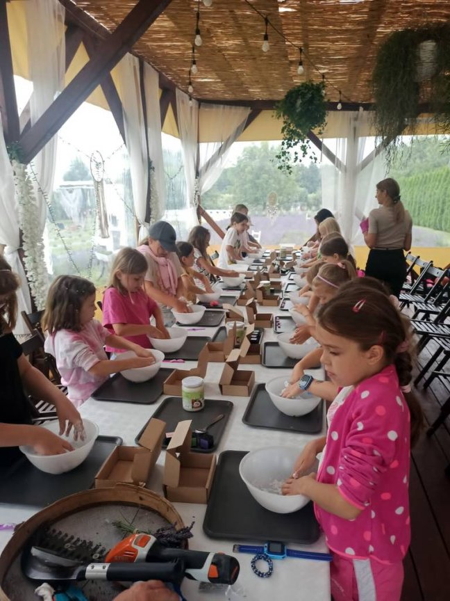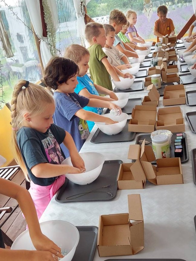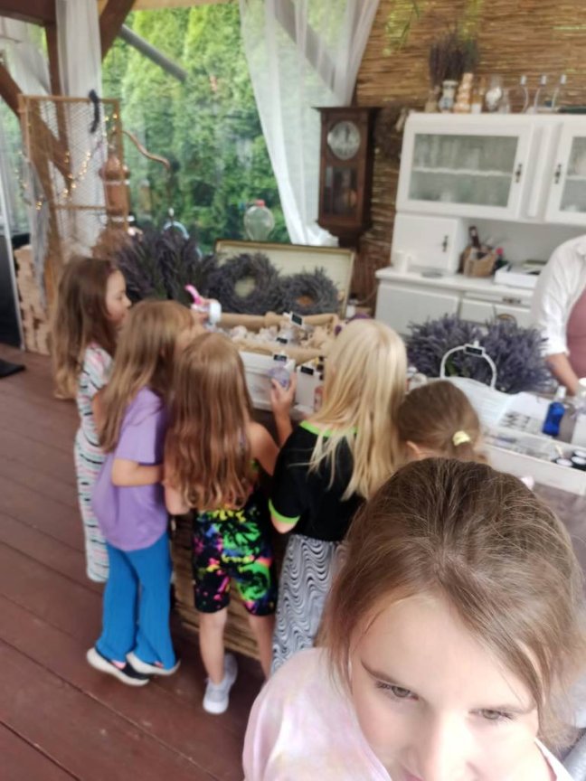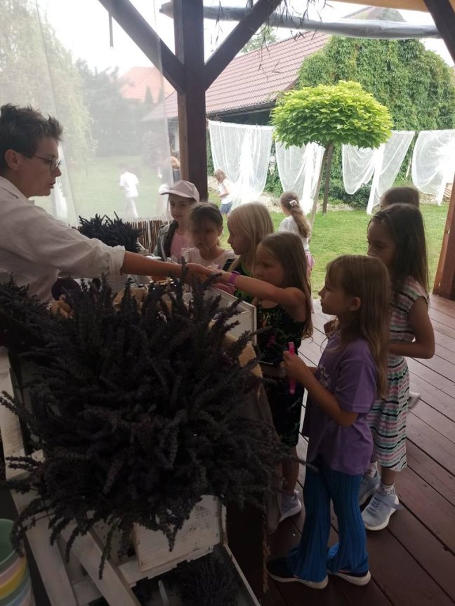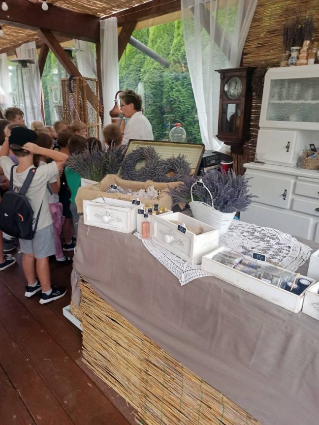Uczniowie z grupy I,II,III rozpoczęli dzień w bajkowym miejscu - Lawendowy Zagonek Tarnów na warsztatach kosmetyczno-zielarskich, gdzie poznali tajniki uprawy lawendy oraz zrobili " Naturalne lawendowe kostki mydła".