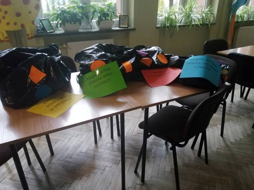 16 kwietnia biblioteka zaproponowała uczniom z klas 1-4 zabawę w loterię. Zabawa polegała na wylosowaniu spośród czterech kategorii książek z odpowiednio oznakowanych worków.