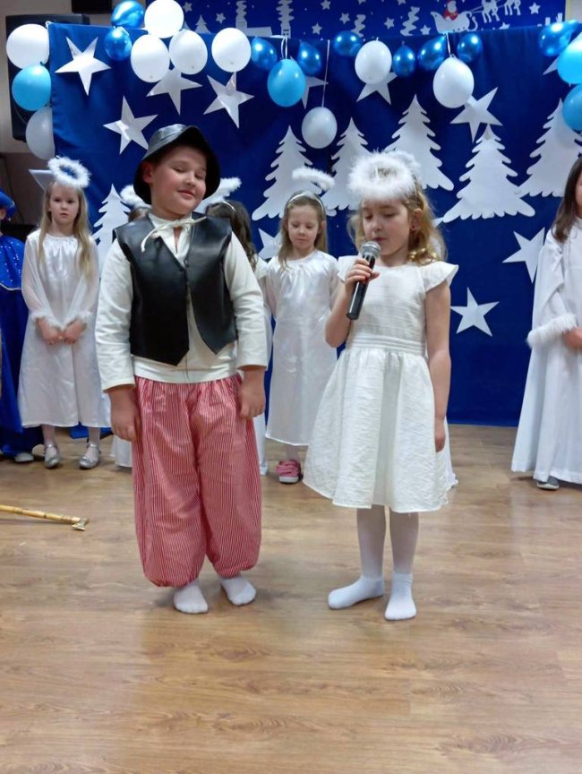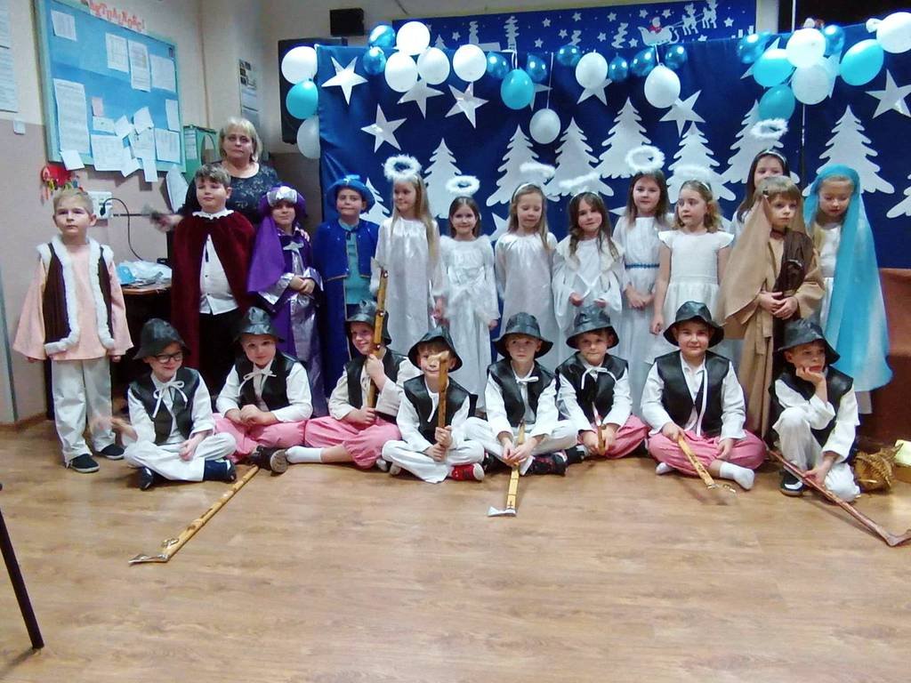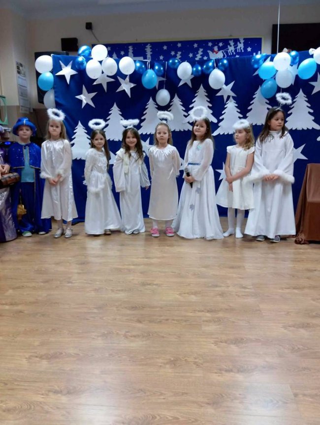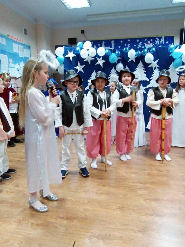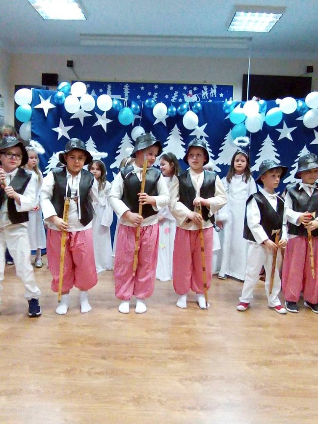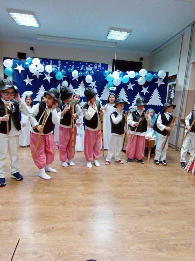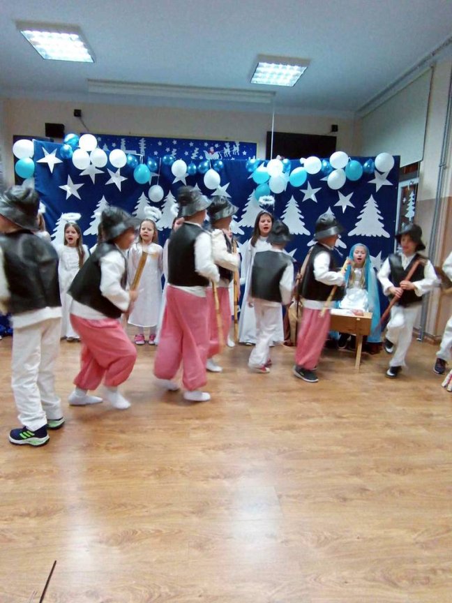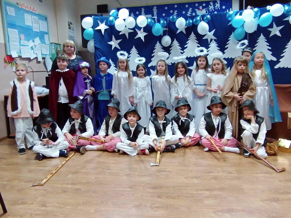 Świąteczny nastrój podkreślały niecodzienne stroje dzieci i zimowa dekoracja sali. Uczniowie na moment przestali być dziećmi i zmienili się w najświętszą rodzinę, anioły, górali i królów, przenosząc wszystkich obecnych w czasy sprzed dwóch tysięcy lat. Mali artyści z dużym przejęciem i zaangażowaniem wiernie odtwarzali swoje role, prezentowali umiejętności recytatorskie, wokalne i taneczne. Na koniec złożyli życzenia i zaśpiewali piosenkę „ Nasi kochani babcia i dziadek ” oraz wręczyli samodzielnie wykonane serduszka swoim Dziadkom.