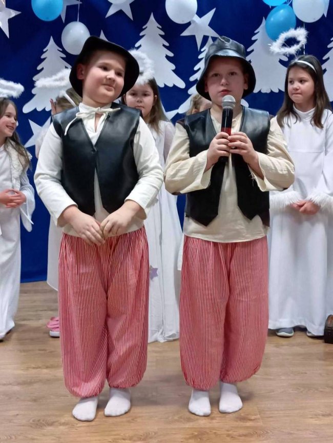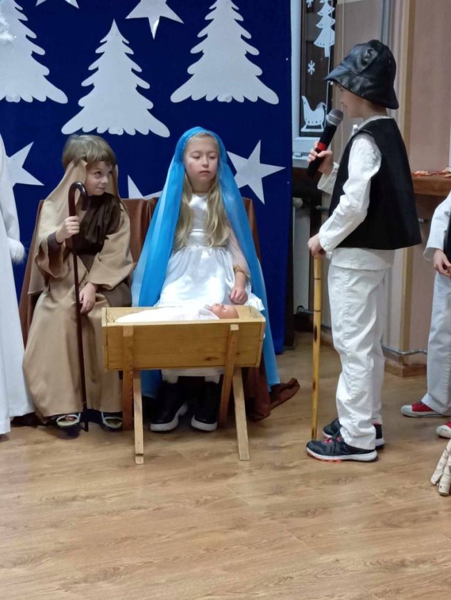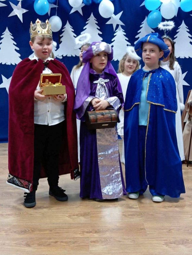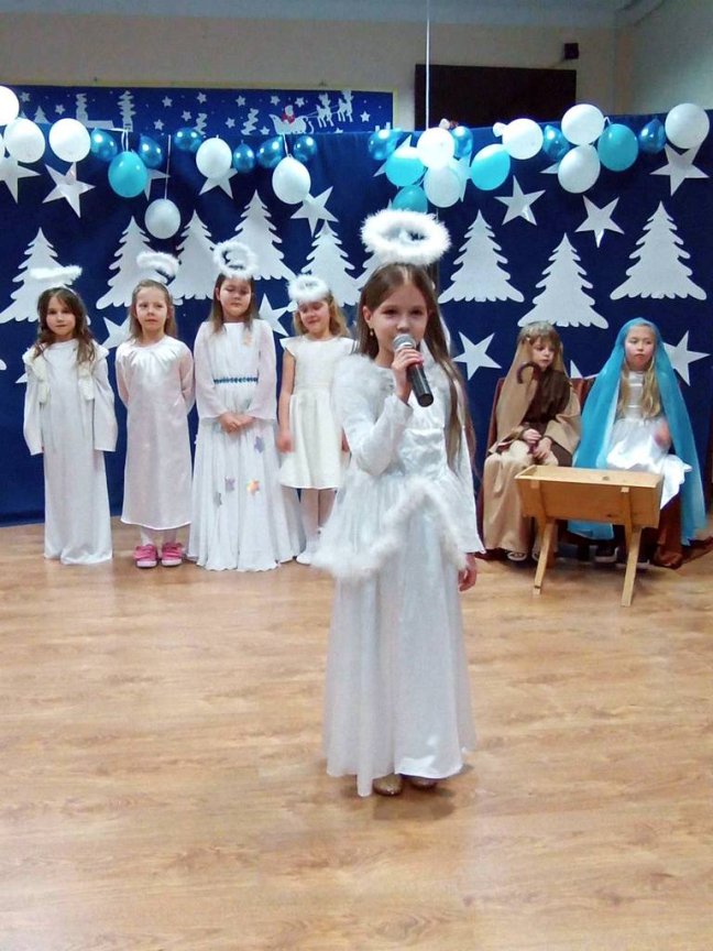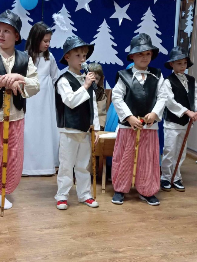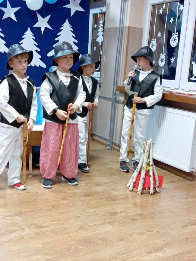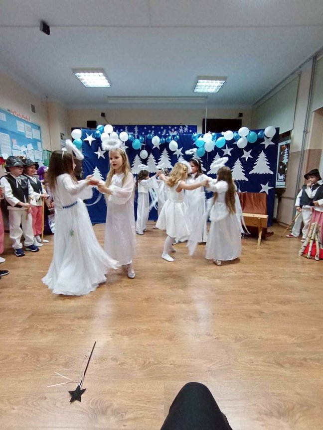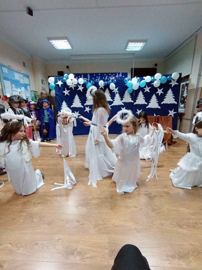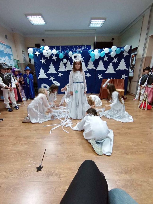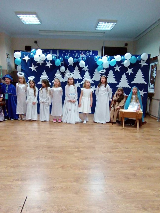 Świąteczny nastrój podkreślały niecodzienne stroje dzieci i zimowa dekoracja sali. Uczniowie na moment przestali być dziećmi i zmienili się w najświętszą rodzinę, anioły, górali i królów, przenosząc wszystkich obecnych w czasy sprzed dwóch tysięcy lat. Mali artyści z dużym przejęciem i zaangażowaniem wiernie odtwarzali swoje role, prezentowali umiejętności recytatorskie, wokalne i taneczne. Na koniec złożyli życzenia i zaśpiewali piosenkę „ Nasi kochani babcia i dziadek ” oraz wręczyli samodzielnie wykonane serduszka swoim Dziadkom.