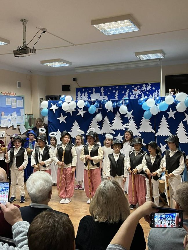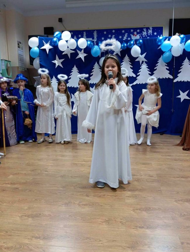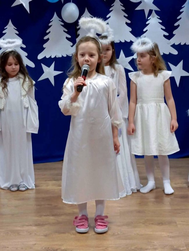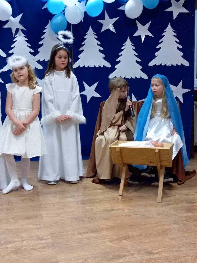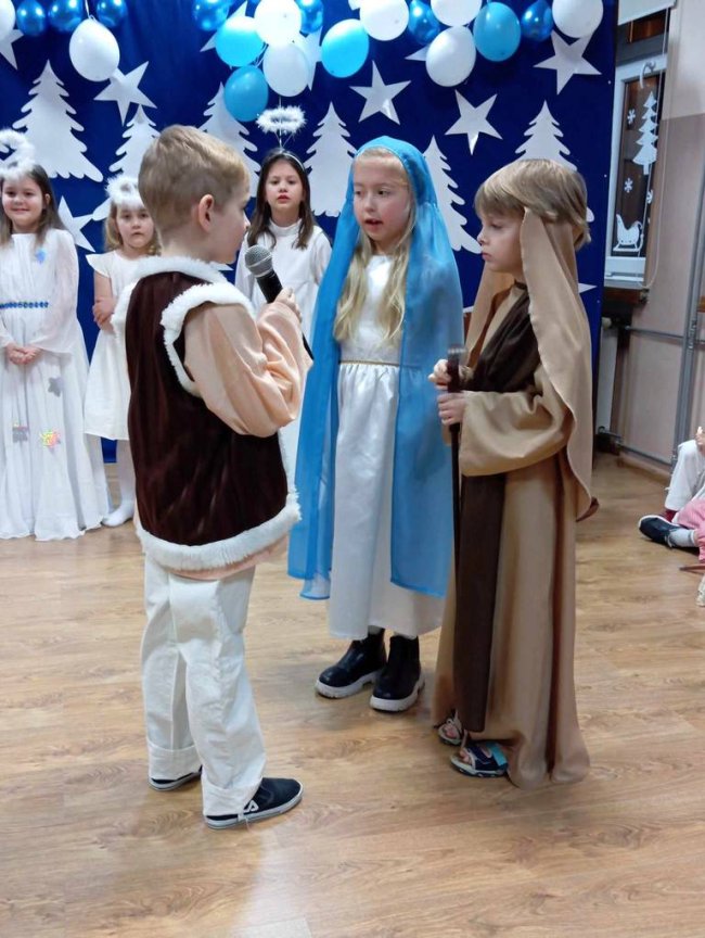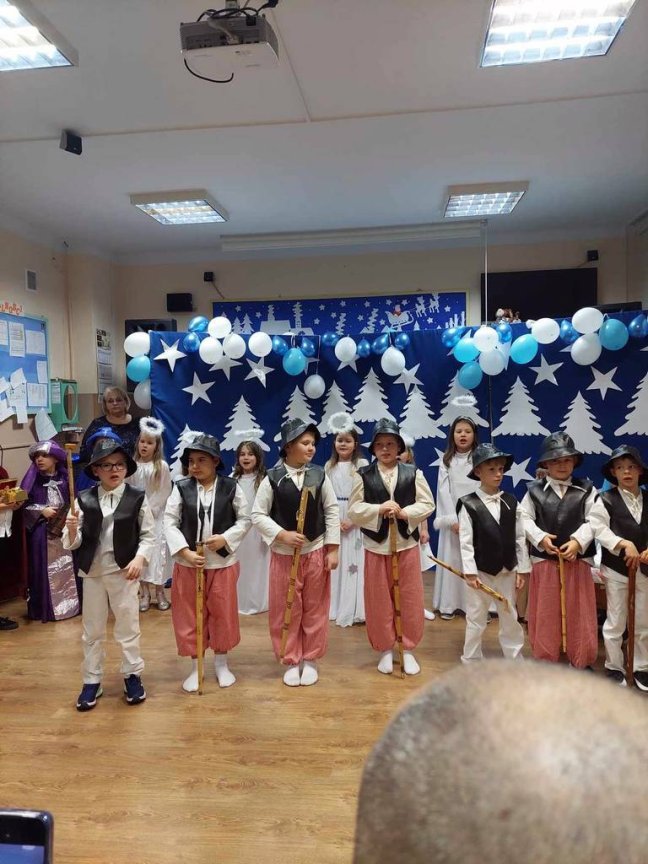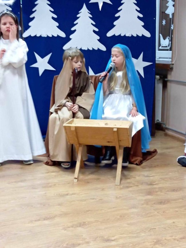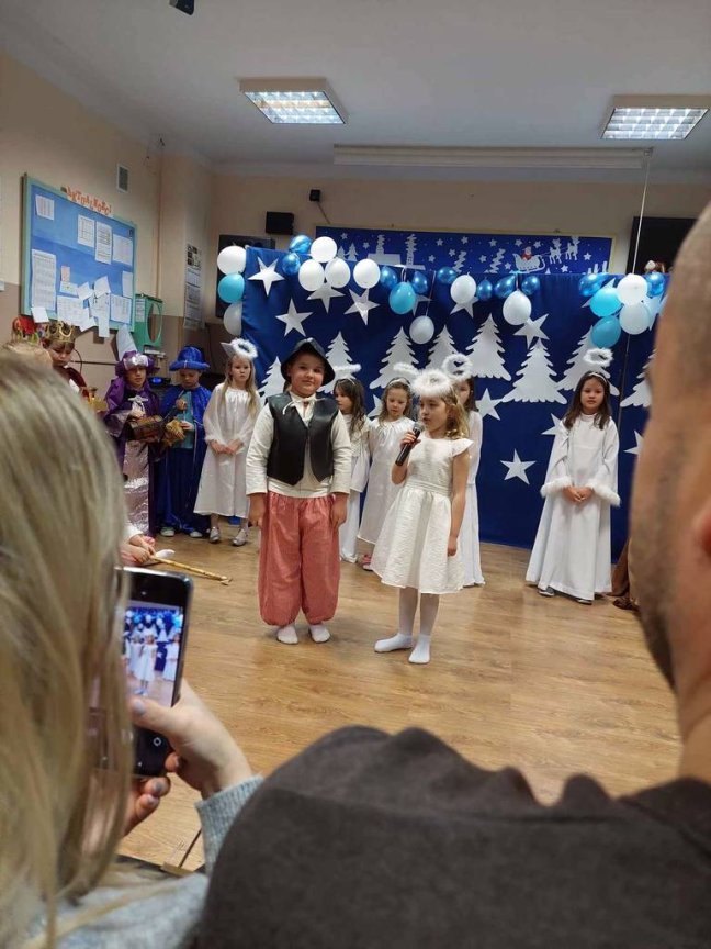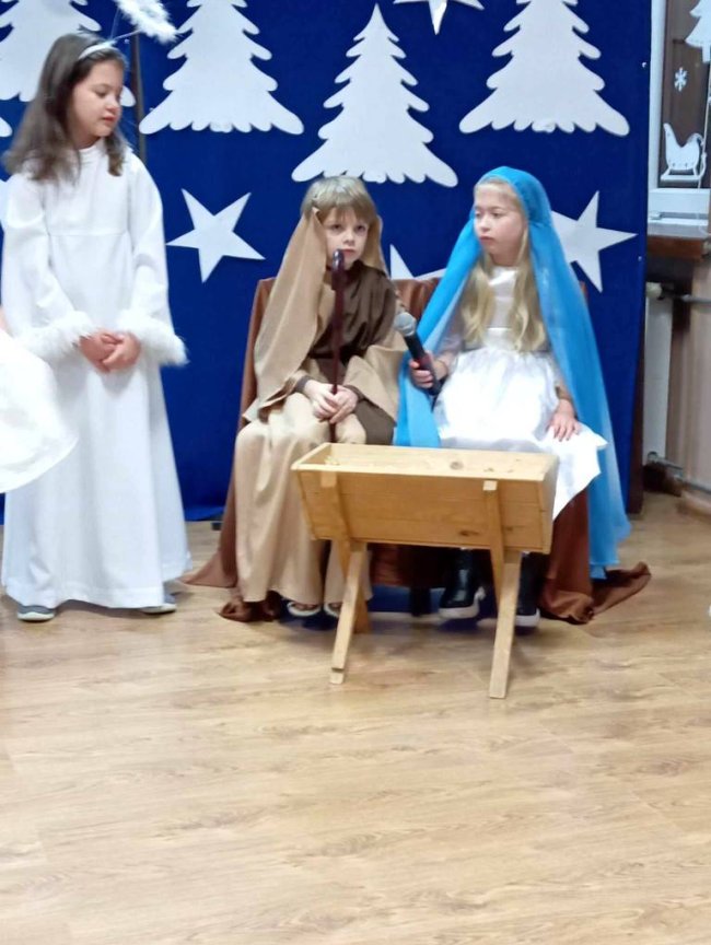 Świąteczny nastrój podkreślały niecodzienne stroje dzieci i zimowa dekoracja sali. Uczniowie na moment przestali być dziećmi i zmienili się w najświętszą rodzinę, anioły, górali i królów, przenosząc wszystkich obecnych w czasy sprzed dwóch tysięcy lat. Mali artyści z dużym przejęciem i zaangażowaniem wiernie odtwarzali swoje role, prezentowali umiejętności recytatorskie, wokalne i taneczne. Na koniec złożyli życzenia i zaśpiewali piosenkę „ Nasi kochani babcia i dziadek ” oraz wręczyli samodzielnie wykonane serduszka swoim Dziadkom.