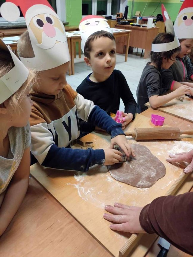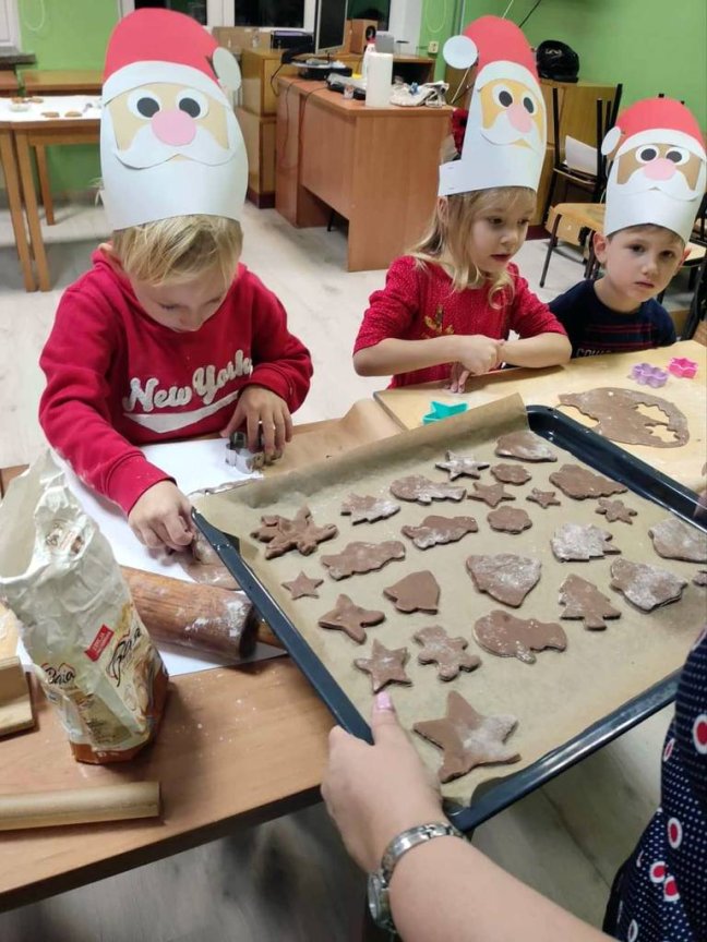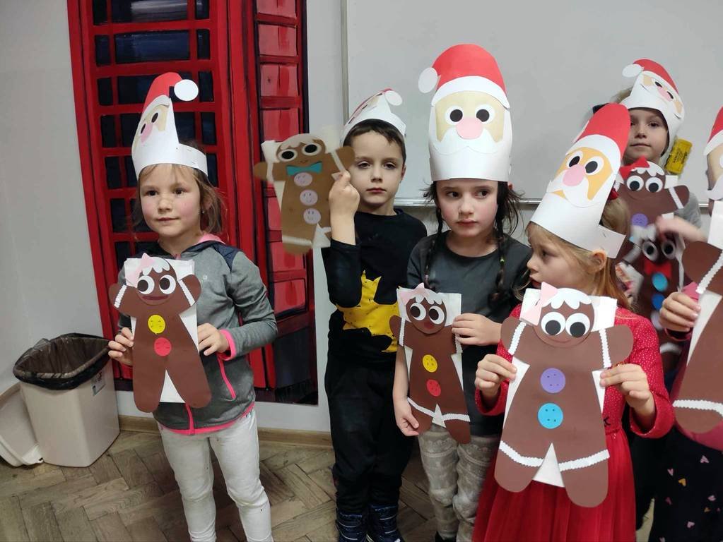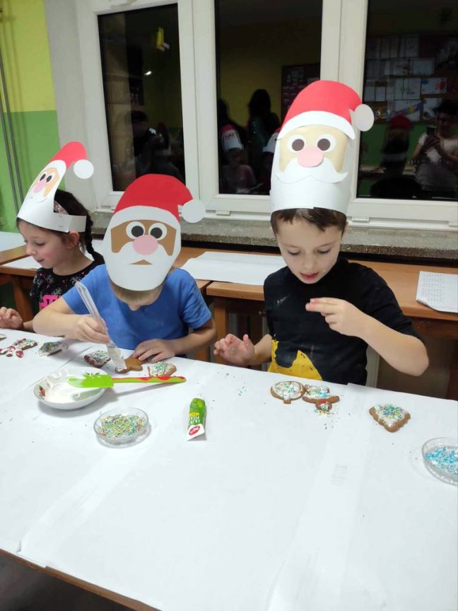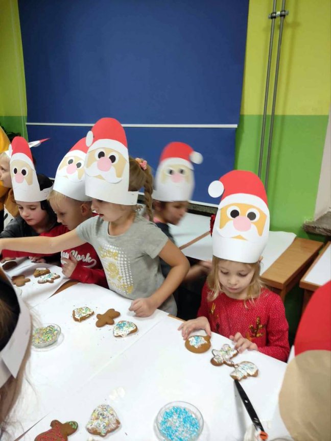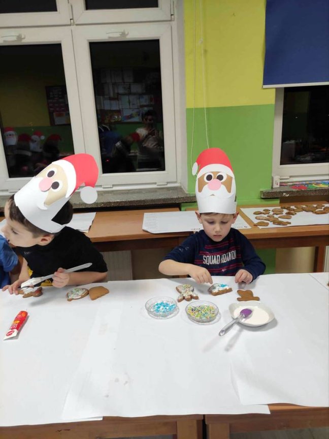W grupach 2-3 osobowych wałkowały ciasto i wykrawały różne kształty świątecznych pierników. Podczas wypieku ciastek dzieci dekorowały przygotowane wcześniej pierniki: lukrem, pisakami kultowymi oraz kolorowymi posypkami. Po tak intensywnej pracy udały się na zasłużony poczęstunek. Kolejnym etapem spotkania były zajęcia plastyczne w czasie, których przedszkolaki wykonały "Piernikowego ludka" i nakleily go na papierową torebkę. Na koniec dzieci zapakowały upieczone i ozdobne przez siebie świąteczne pierniki.