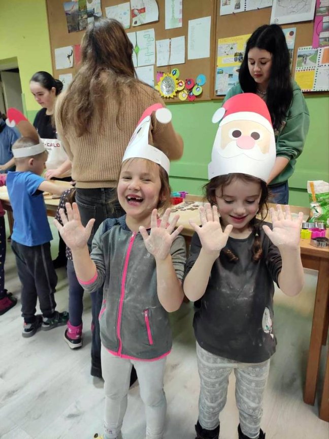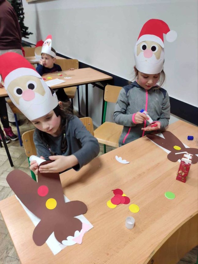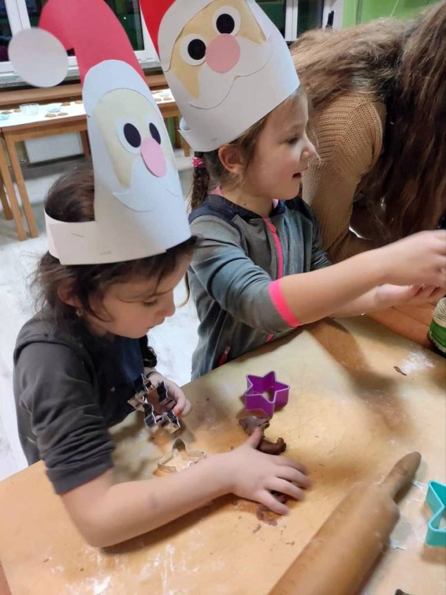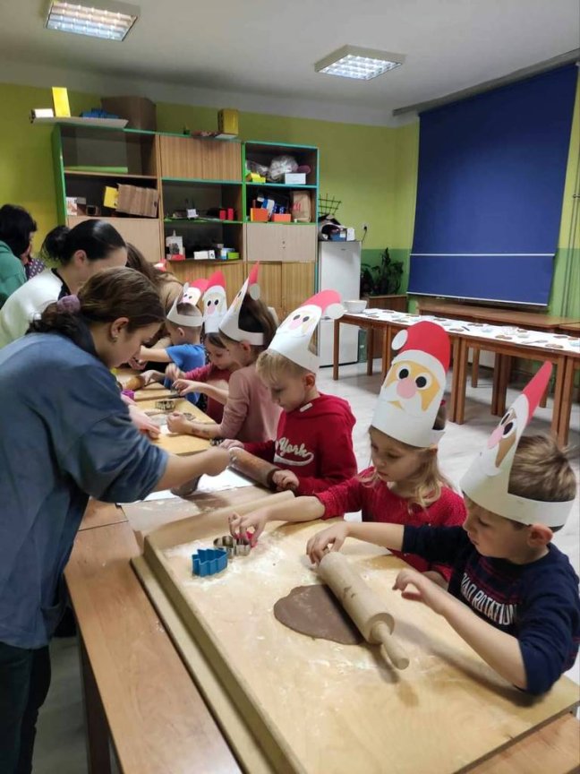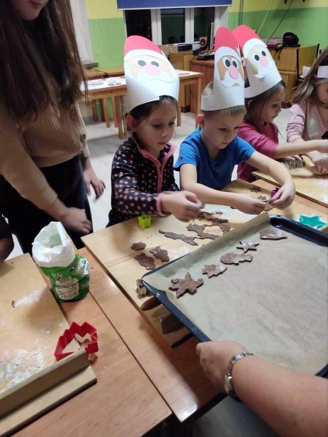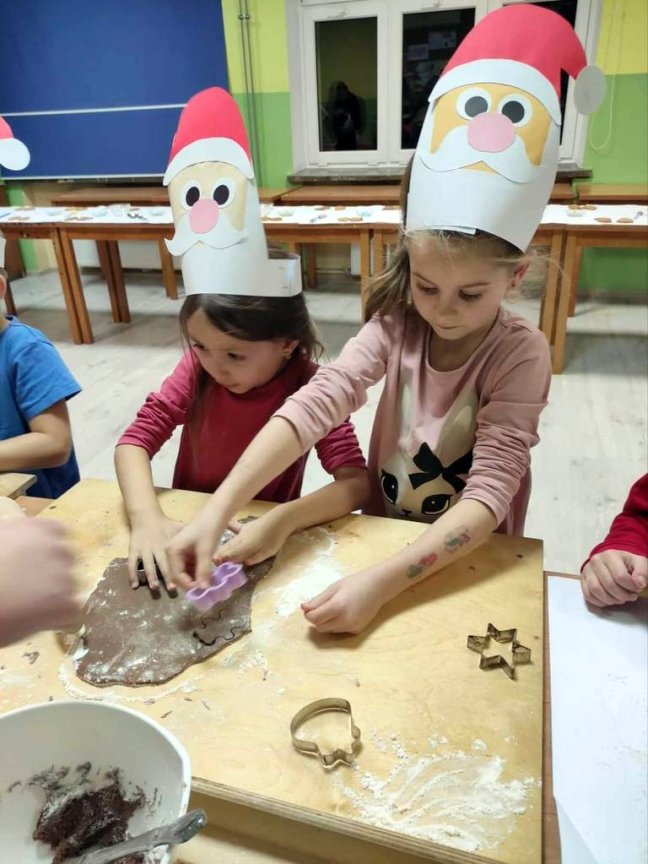 W grupach 2-3 osobowych wałkowały ciasto i wykrawały różne kształty świątecznych pierników. Podczas wypieku ciastek dzieci dekorowały przygotowane wcześniej pierniki: lukrem, pisakami kultowymi oraz kolorowymi posypkami. Po tak intensywnej pracy udały się na zasłużony poczęstunek. Kolejnym etapem spotkania były zajęcia plastyczne w czasie, których przedszkolaki wykonały "Piernikowego ludka" i nakleily go na papierową torebkę. Na koniec dzieci zapakowały upieczone i ozdobne przez siebie świąteczne pierniki.