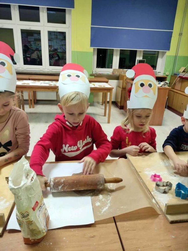 5 grudnia przedszkolaki, które przyszły na cyklicznie zajęcia do SP 20 mogly wykonać zdjęcia w fotobudce z Mikołajem. Następnie udały się do sali przystosowanej do zajęć kulinarnych gdzie otrzymały kolorowe czapki z wizerunkiem świętego Mikołaja.