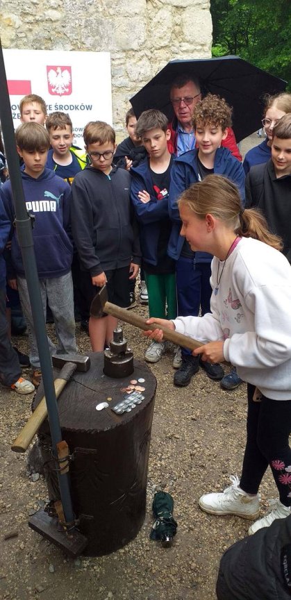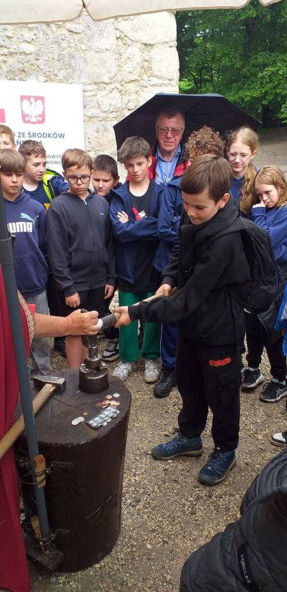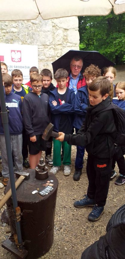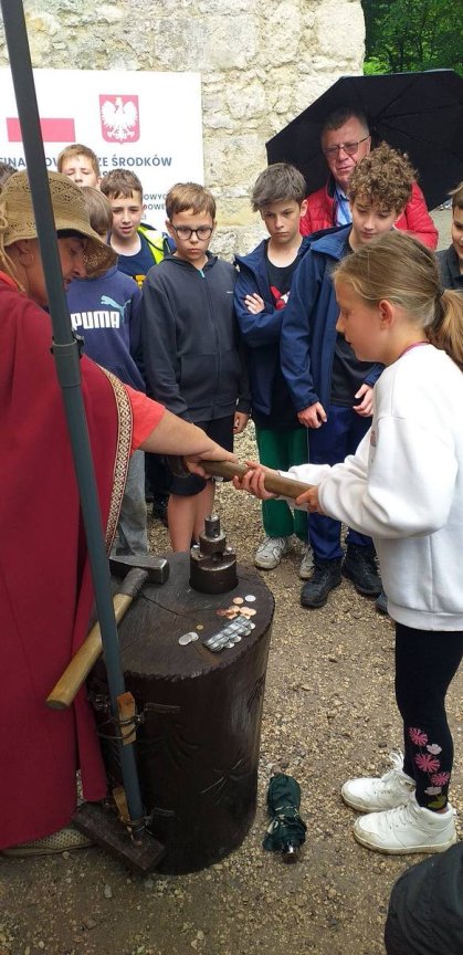 W ramach zajęć edukacyjnych uczniowie wzięli również udział w pokazie wybijania monet. Dzięki tej atrakcji dzieci mogły na własne oczy zobaczyć, jak wyglądał proces tworzenia monet w dawnych czasach oraz dowiedzieć się, kim był mincerz i jaką rolę pełnił w średniowiecznym społeczeństwie. Pokaz wzbudził duże zainteresowanie, a możliwość wybicia własnej, pamiątkowej monety była dla wielu uczniów wyjątkowym przeżyciem.