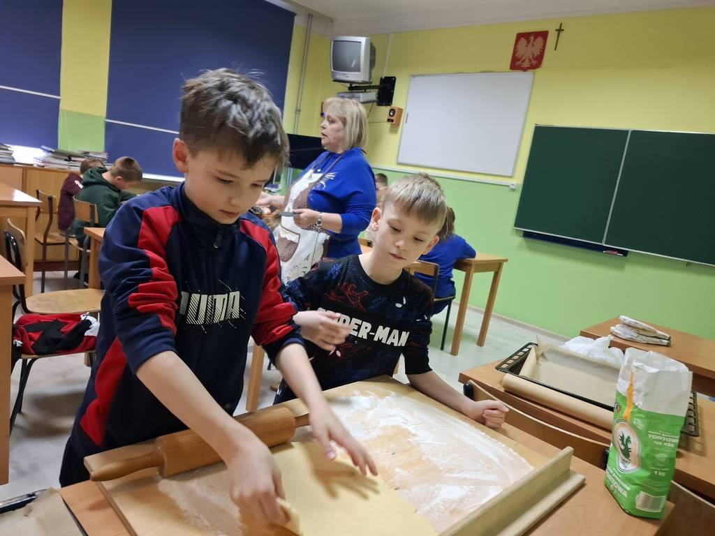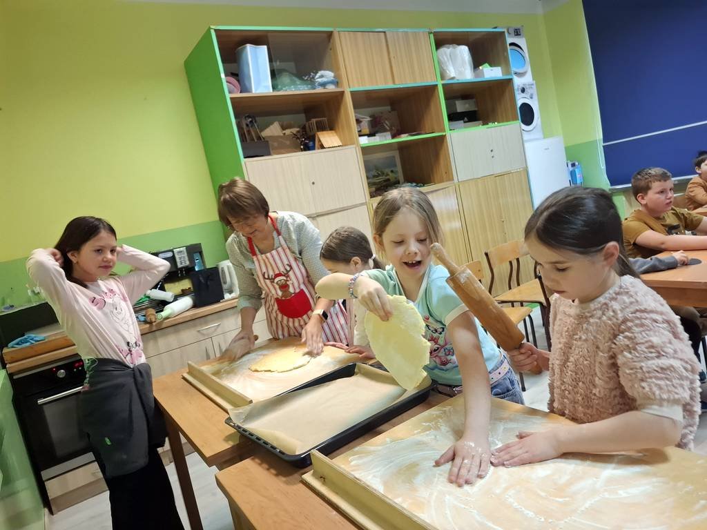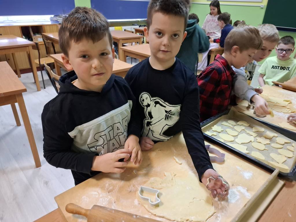 W dniu dzisiejszym uczniowie zamienili się w kucharzy. Zadaniem dzieci było z przygotowanego kruchego ciasta upiec ciasteczka z okazji zbliżających się świąt.