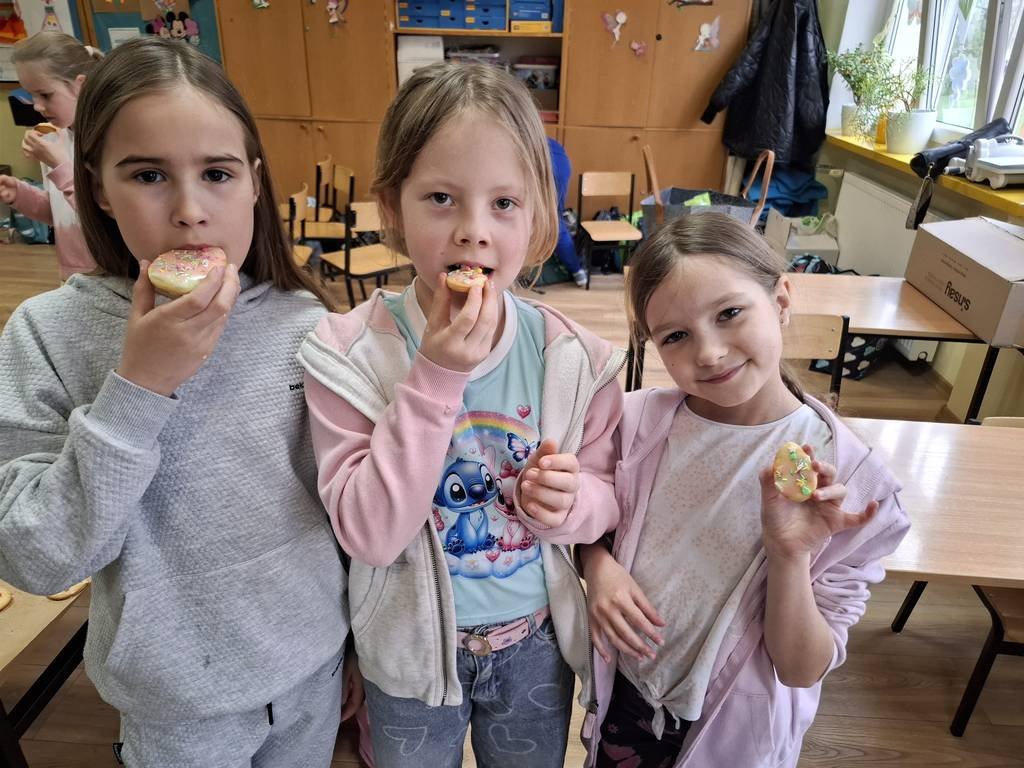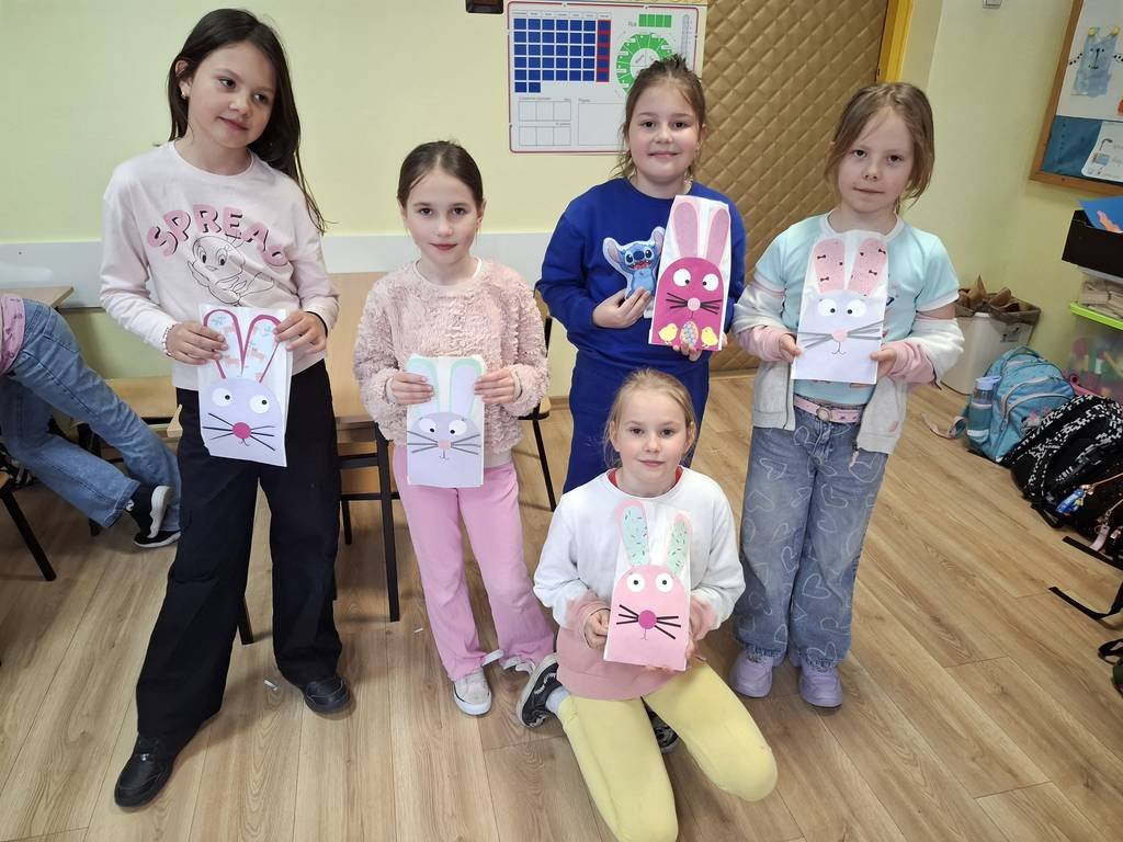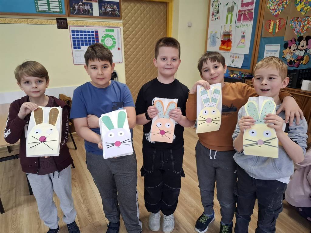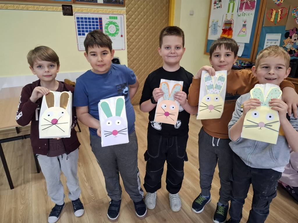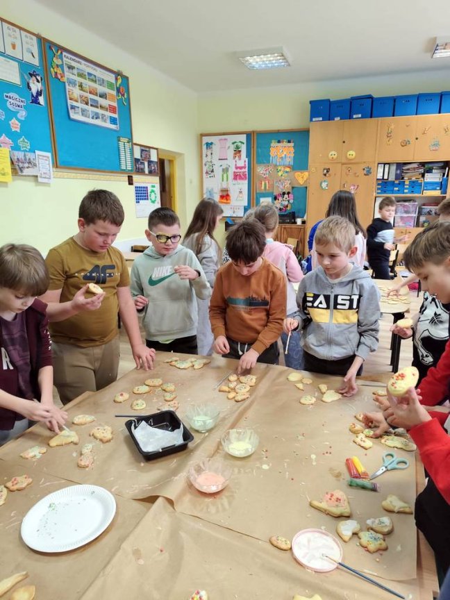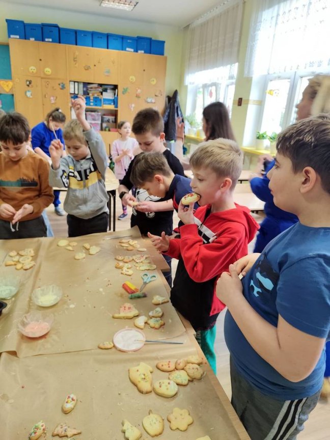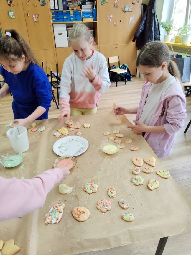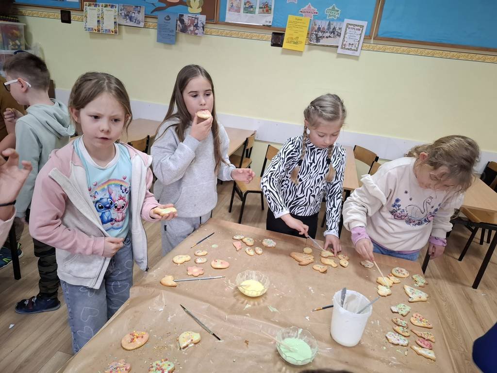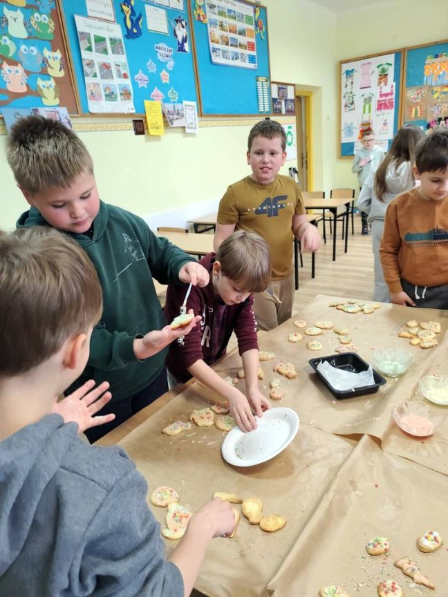 Samodzielnie wałkowali ciasto i wykrawali przy użyciu foremek: kurczaki, baranki, króliki. W czasie, w którym piekły się ciasteczka uczniowie wydrapywali kolorowe pisanki według własnego pomysłu. Po upieczeniu się wszystkich ciasteczek uczniowie chętnie dekorowali kolorowymi lukrami i posypką. Następnie ciasteczka włożyli do papierowych torebek, na których był przyklejony wielkanocny królik wykonany podczas czwartkowych zajęć świetlicowych. Zajęcia takie pozwalają na zdobywanie nowych doświadczeń za pomocą zmysłu smaku, zapachu i dotyku.
