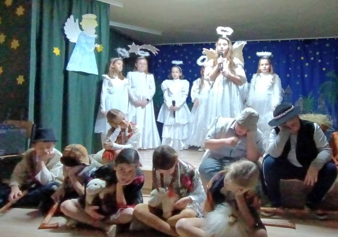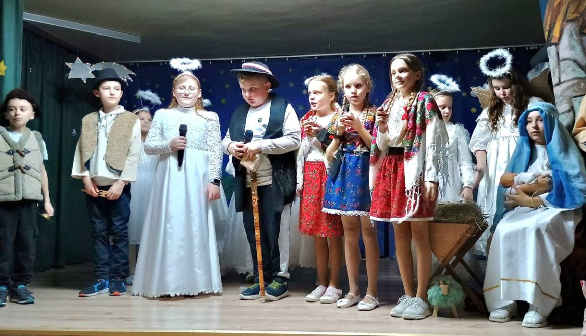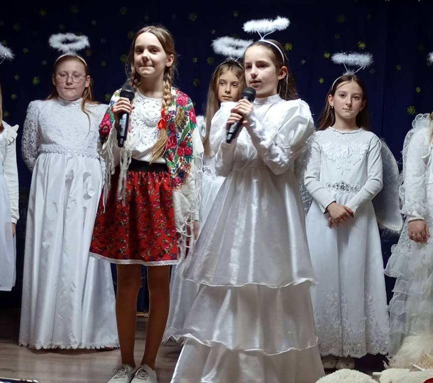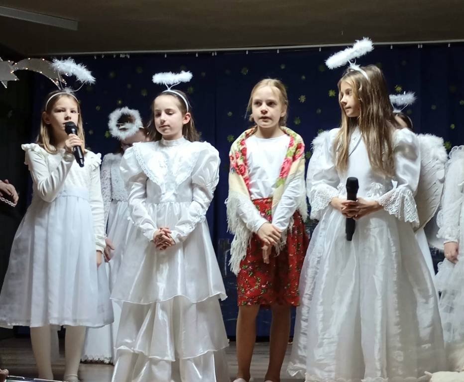 Już na początku przedstawienia Seniorzy zostali zaproszeni do wspólnego śpiewania kolęd i pastorałek. Potem dzieci wcielając się w role Pasterzy, Aniołków, Józefa, Maryi i Trzech Króli w barwny sposób opowiadały o narodzeniu Pana Jezusa. Kolorowe stroje, piękny śpiew i akompaniament muzyczny ubogaciły przedstawienie. W sali zapanowała atmosfera pełna ciepła i emocji, a na twarzach Babć i Dziadziów widać było radość, wzruszenie i ogromną dumę ze swoich wnuków. Na zakończenie spotkania dzieci odśpiewały ukochanym Gościom "Sto lat" i wręczyły własnoręcznie zrobione laurki.