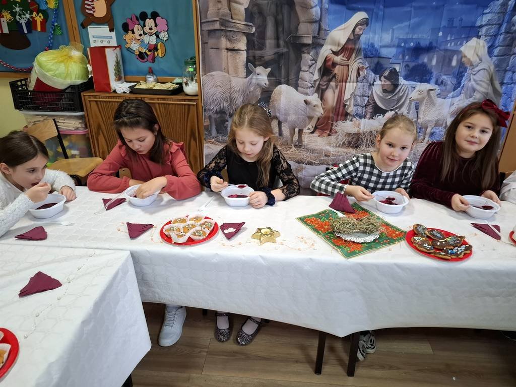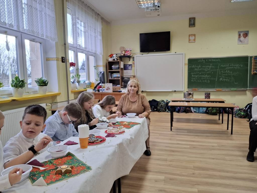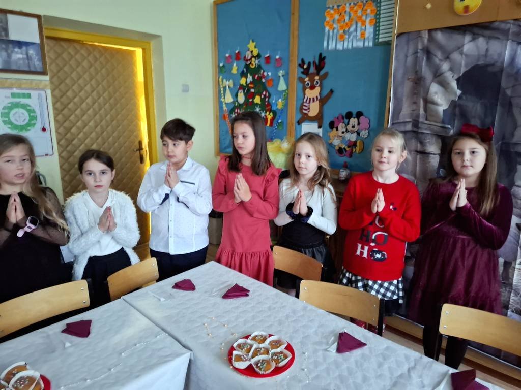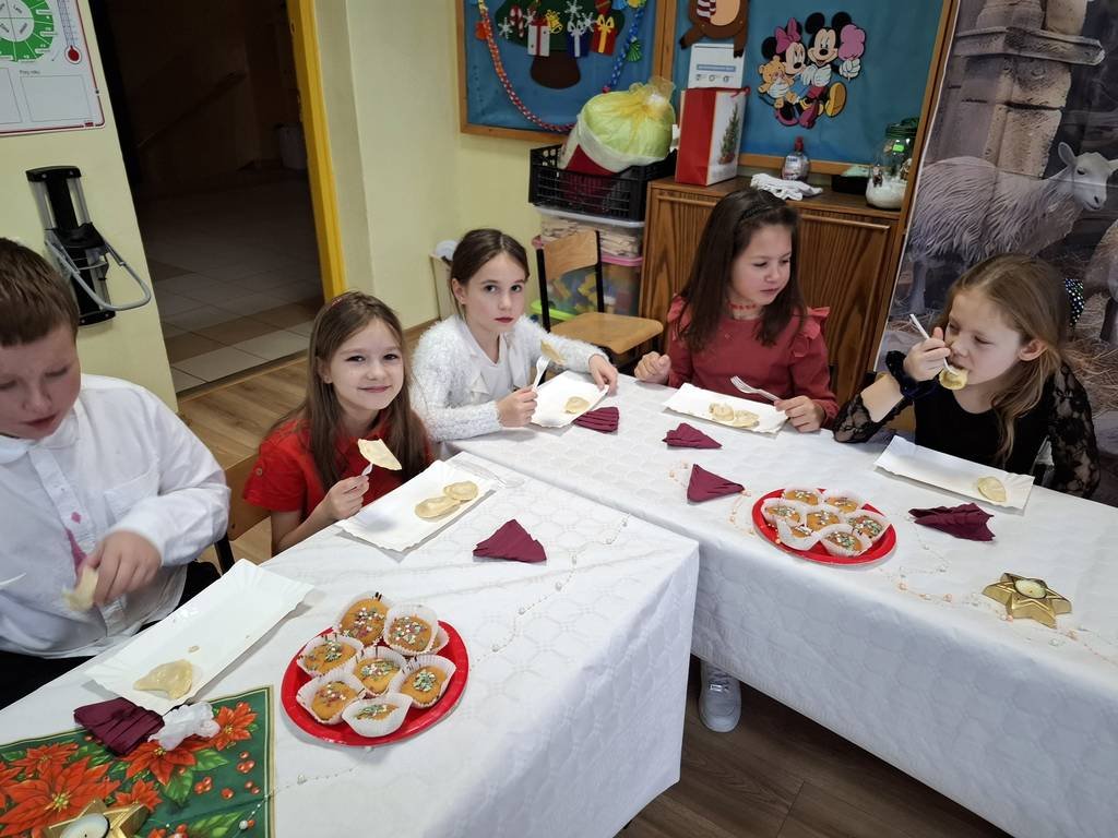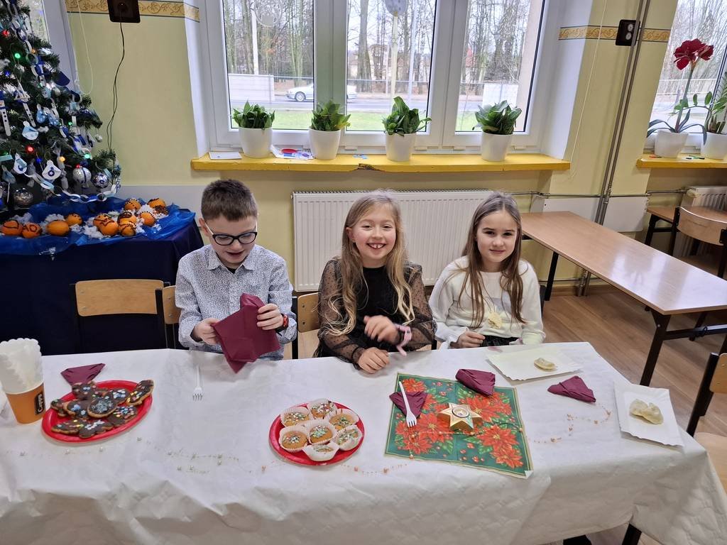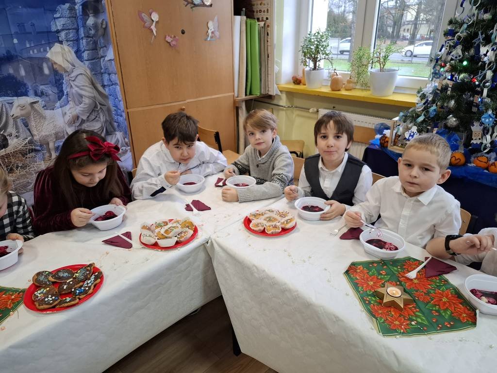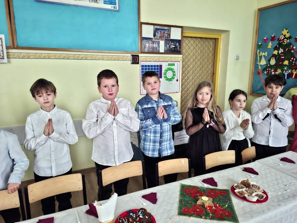 Sami nakryliśmy białym obrusem stoły, na którym znalazło się sianko oraz świece. W blasku choinki zebraliśmy się wszyscy wokół stołu, a nasza Pani wspólnie się z nami pomodliła. Potem wszyscy wszystkim składali najlepsze życzenia i łamaliśmy się opłatkiem. Następnie usiedliśmy przy stole, na którym znalazł się barszcz z uszkami, pierogi ruskie oraz babeczki i pierniczki. Te wszystkie smakołyki zostały przygotowane przez naszych kochanych Rodziców. Śpiewaliśmy kolędy, rozmawialiśmy. Niektórzy opowiadali o tym, jak w ich rodzinach odbywa się wieczerza wigilijna. Było nam bardzo wesoło i miło spędziliśmy czas. Już wiemy, że za rok też wspólnie zasiądziemy przy klasowym, wigilijnym stole. Wesołych świąt!