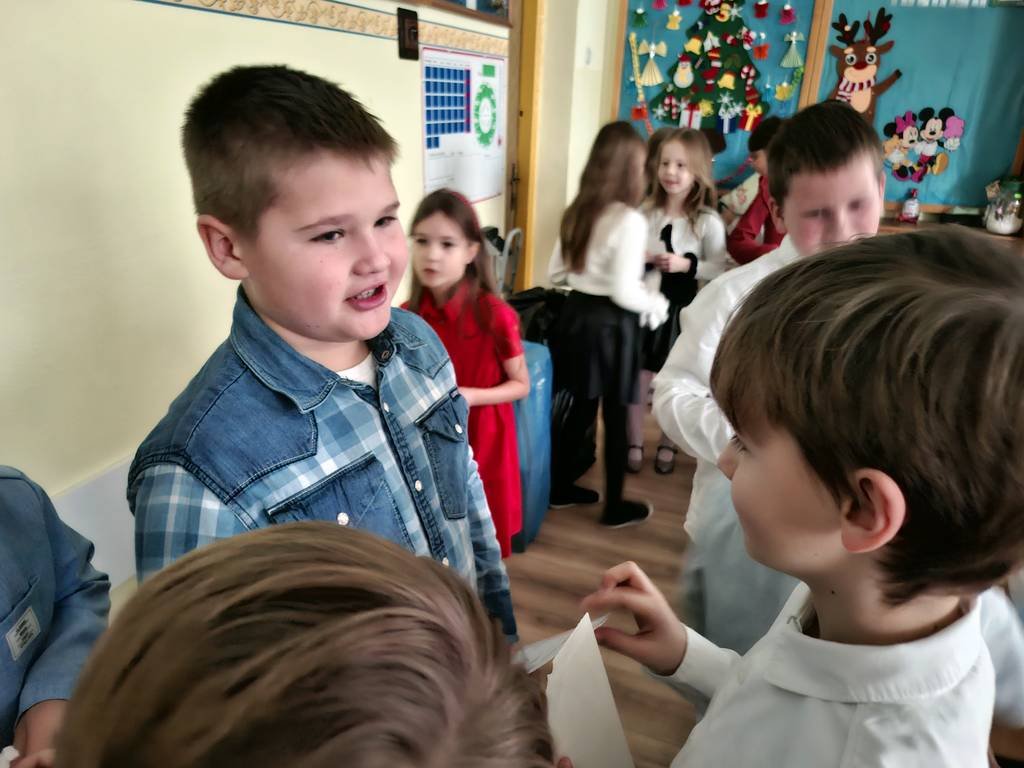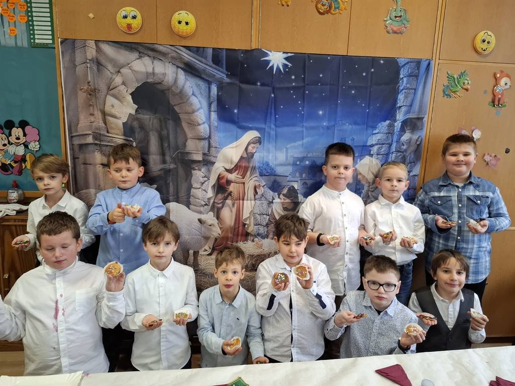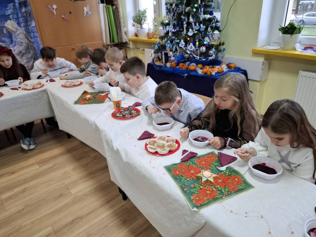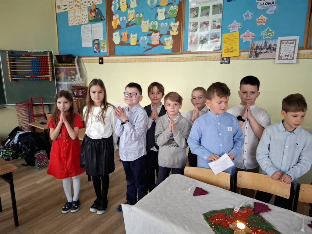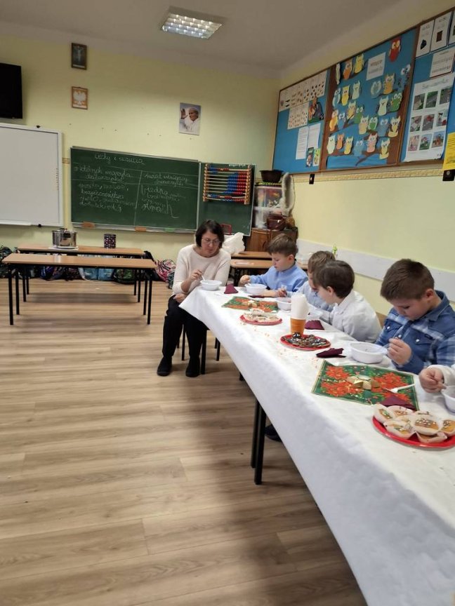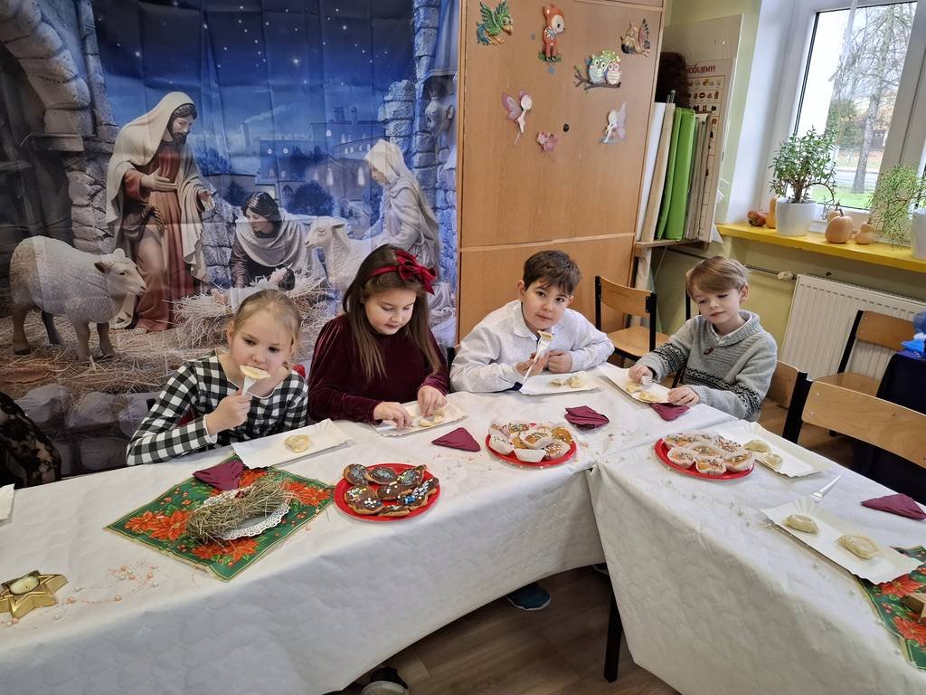 Sami nakryliśmy białym obrusem stoły, na którym znalazło się sianko oraz świece. W blasku choinki zebraliśmy się wszyscy wokół stołu, a nasza Pani wspólnie się z nami pomodliła. Potem wszyscy wszystkim składali najlepsze życzenia i łamaliśmy się opłatkiem. Następnie usiedliśmy przy stole, na którym znalazł się barszcz z uszkami, pierogi ruskie oraz babeczki i pierniczki. Te wszystkie smakołyki zostały przygotowane przez naszych kochanych Rodziców. Śpiewaliśmy kolędy, rozmawialiśmy. Niektórzy opowiadali o tym, jak w ich rodzinach odbywa się wieczerza wigilijna. Było nam bardzo wesoło i miło spędziliśmy czas. Już wiemy, że za rok też wspólnie zasiądziemy przy klasowym, wigilijnym stole. Wesołych świąt!