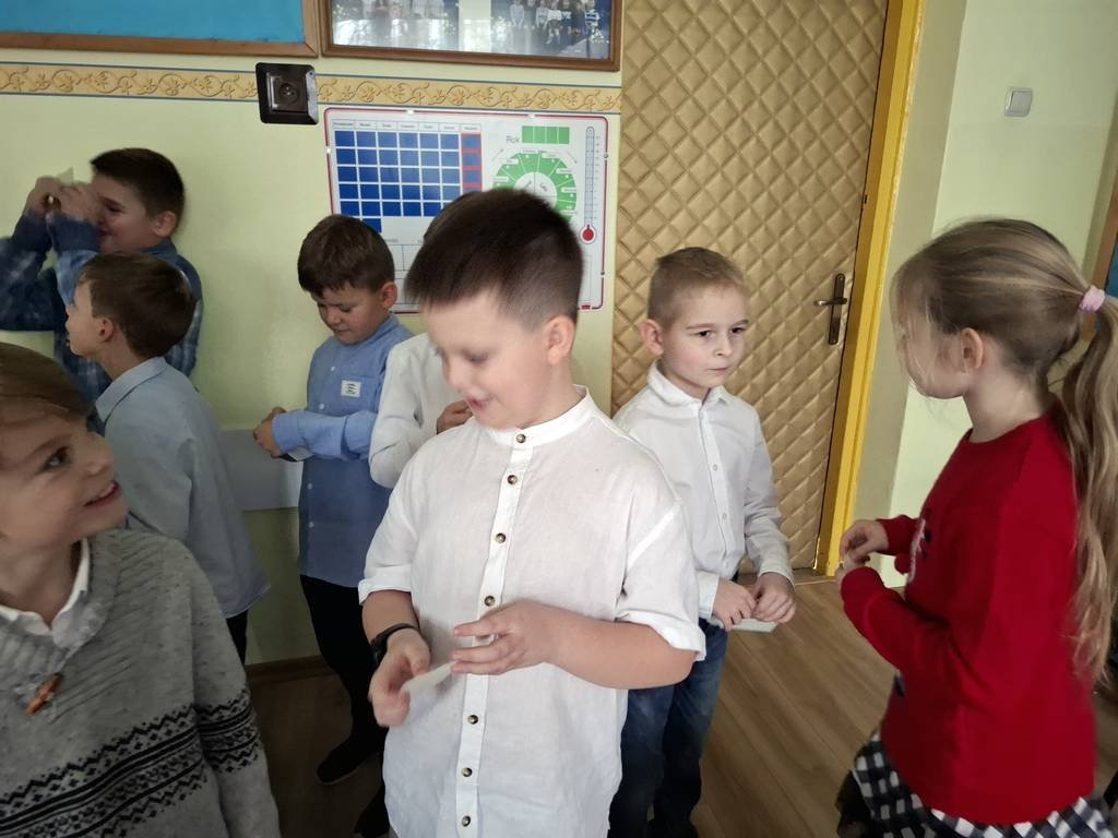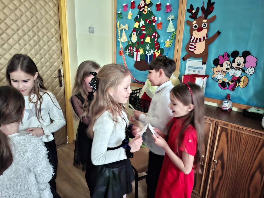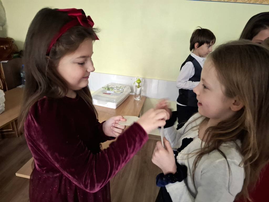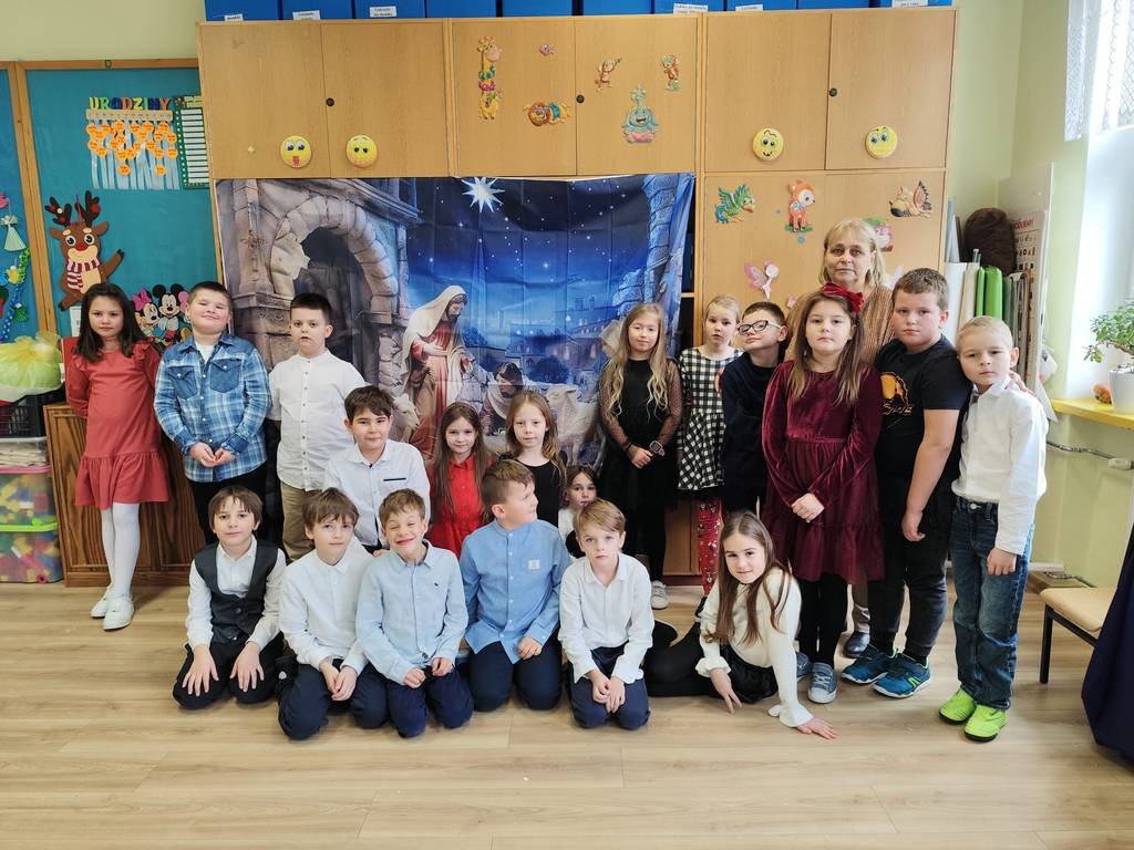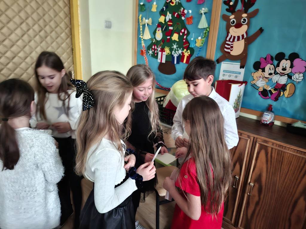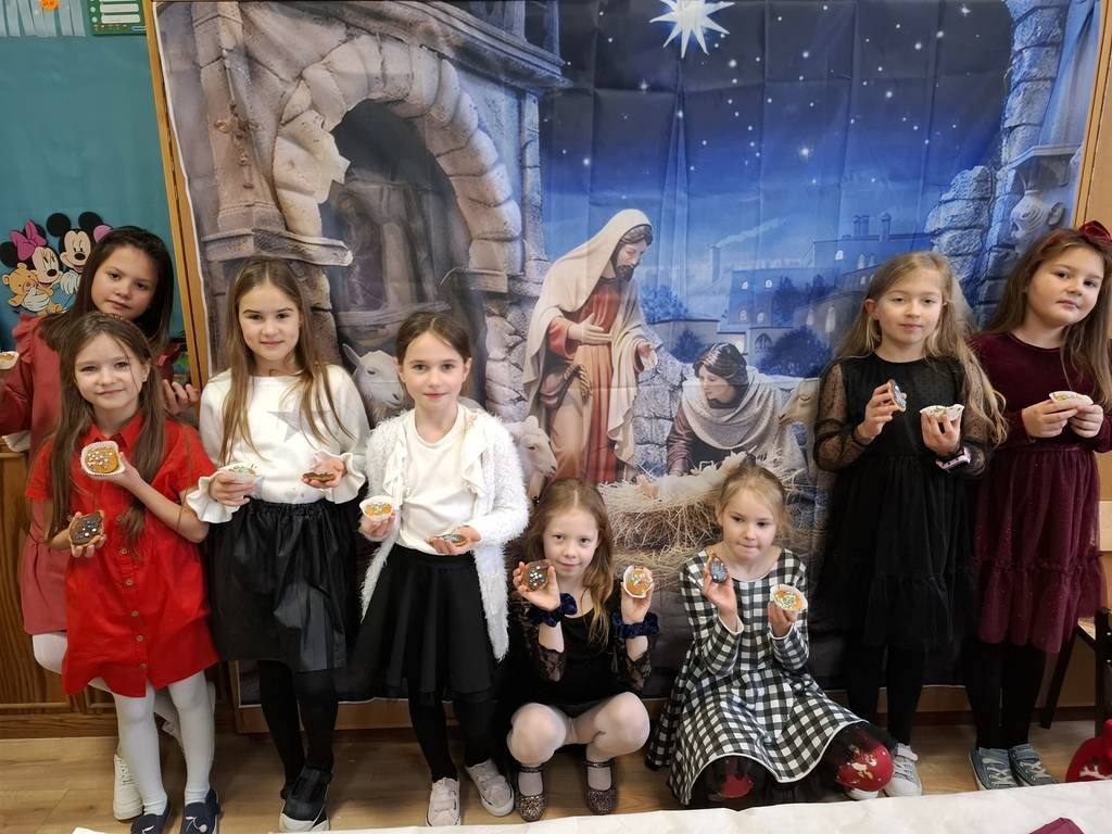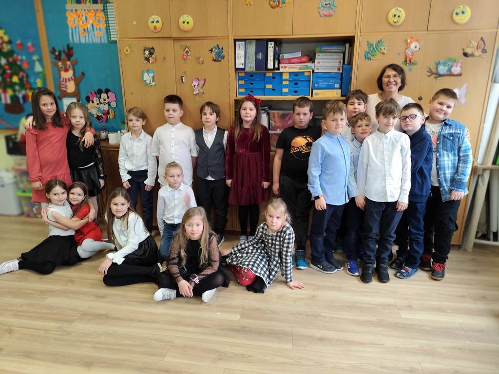 Sami nakryliśmy białym obrusem stoły, na którym znalazło się sianko oraz świece. W blasku choinki zebraliśmy się wszyscy wokół stołu, a nasza Pani wspólnie się z nami pomodliła. Potem wszyscy wszystkim składali najlepsze życzenia i łamaliśmy się opłatkiem. Następnie usiedliśmy przy stole, na którym znalazł się barszcz z uszkami, pierogi ruskie oraz babeczki i pierniczki. Te wszystkie smakołyki zostały przygotowane przez naszych kochanych Rodziców. Śpiewaliśmy kolędy, rozmawialiśmy. Niektórzy opowiadali o tym, jak w ich rodzinach odbywa się wieczerza wigilijna. Było nam bardzo wesoło i miło spędziliśmy czas. Już wiemy, że za rok też wspólnie zasiądziemy przy klasowym, wigilijnym stole. Wesołych świąt!