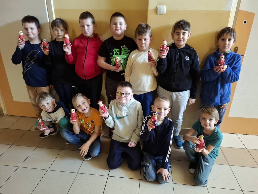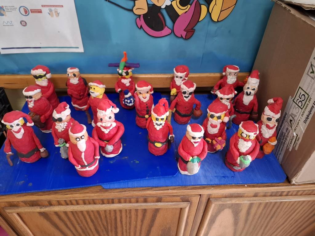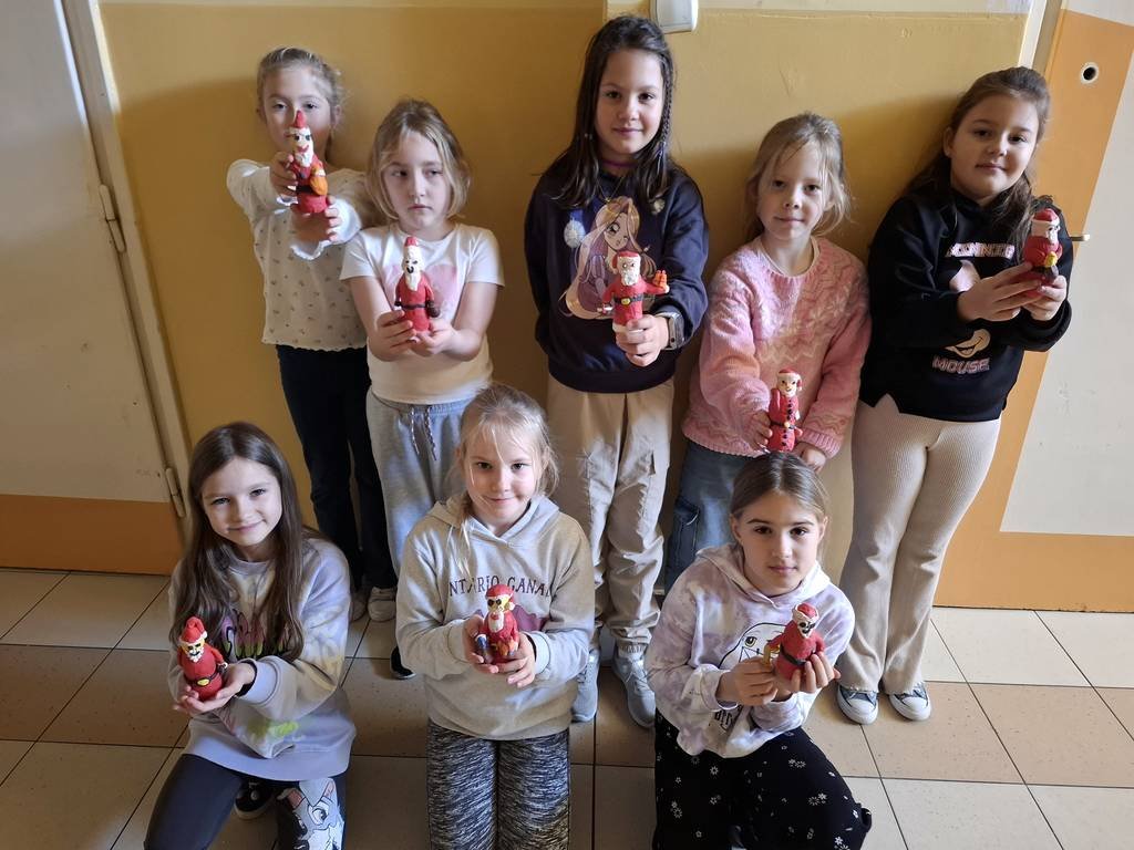 Uczniowie podczas zajęć plastycznych lepili Mikołaja z plasteliny wykorzystując do tego buteleczkę po actimelu.
