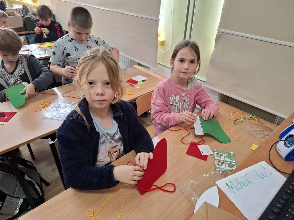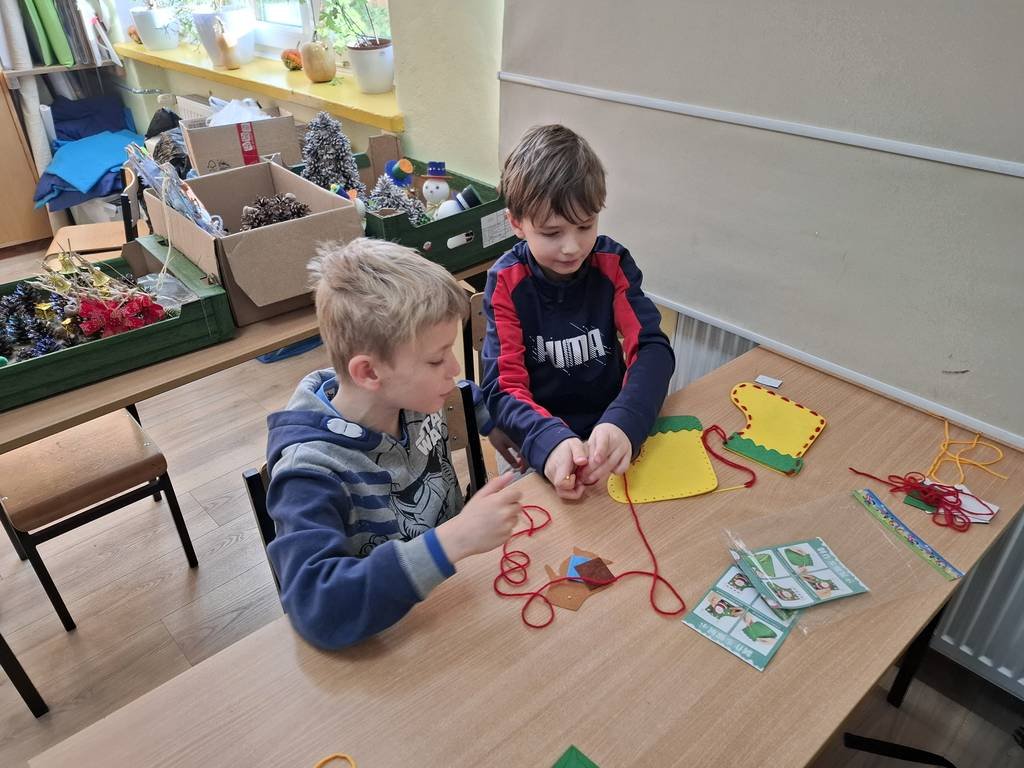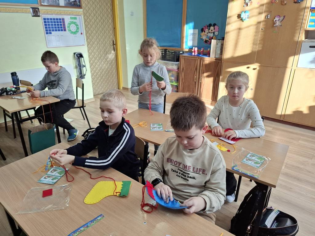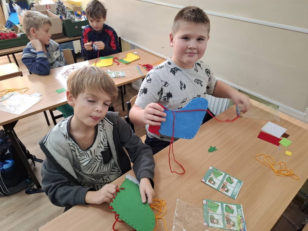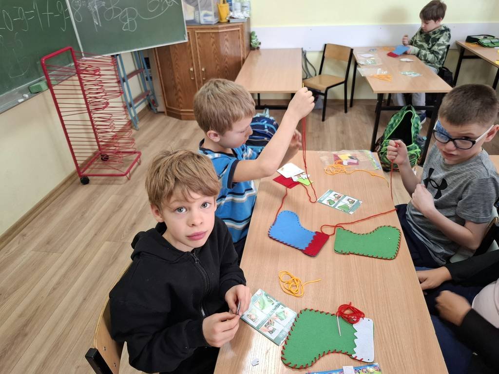 Na kolejnych zajęciach uczniowie uczyli się nawlekać włóczkę na igłę, poznali prosty ścieg, którym obszywali filcowego buta Mikołajkowego. Po wykonaniu tej czynności obszyty but został udekorowany świątecznymi naklejkami.