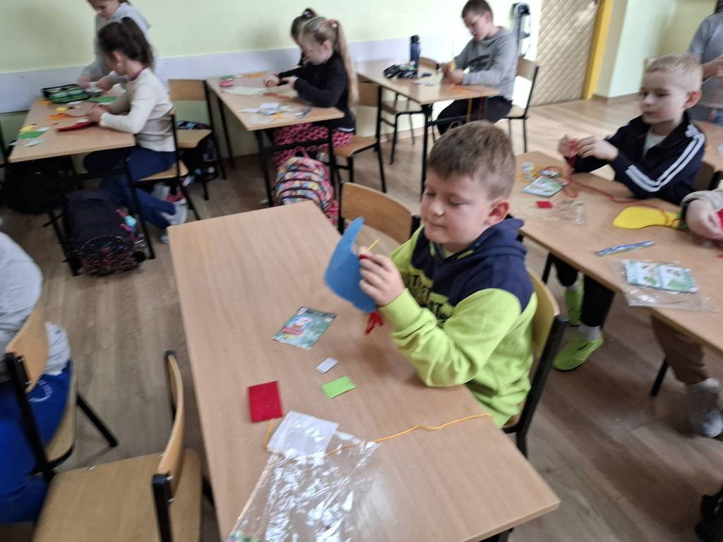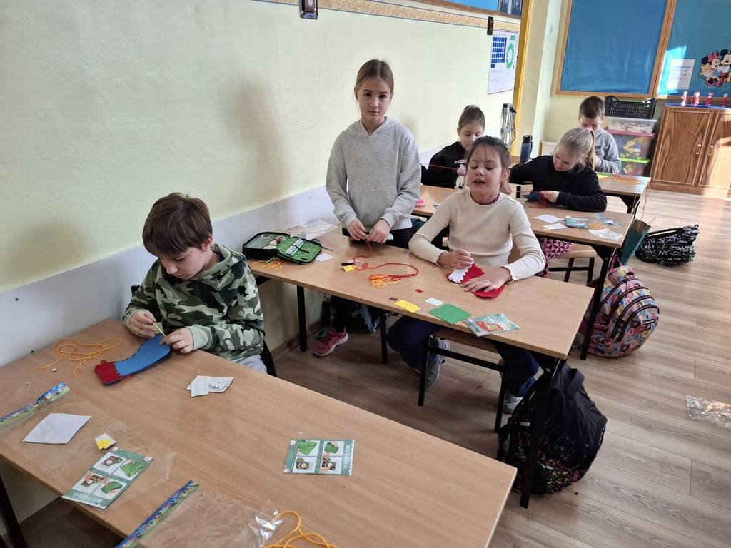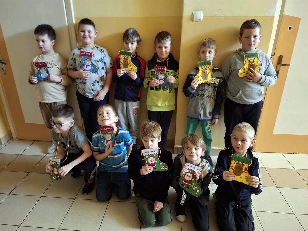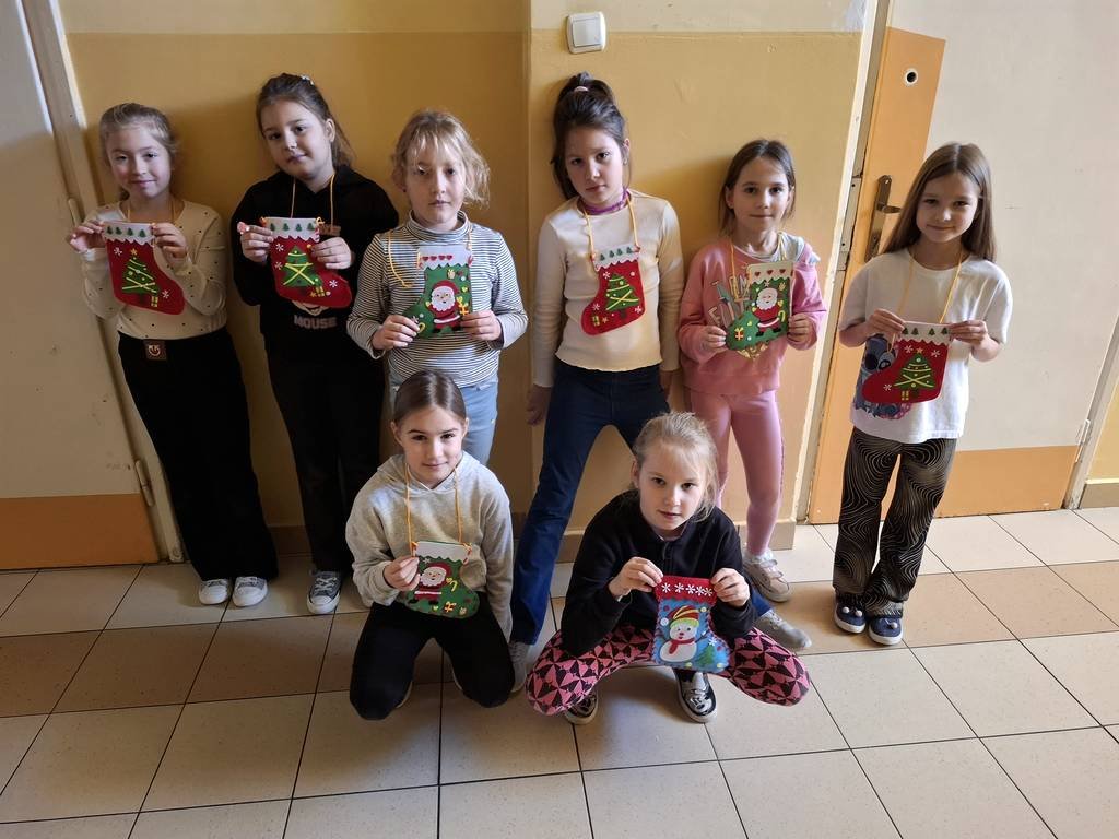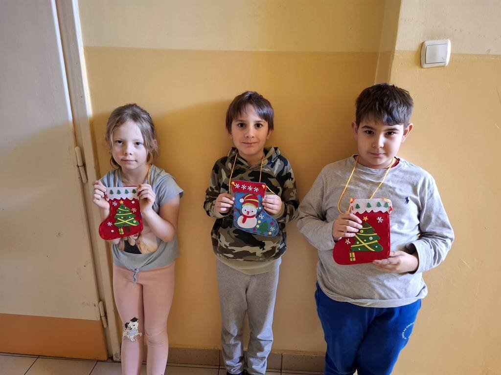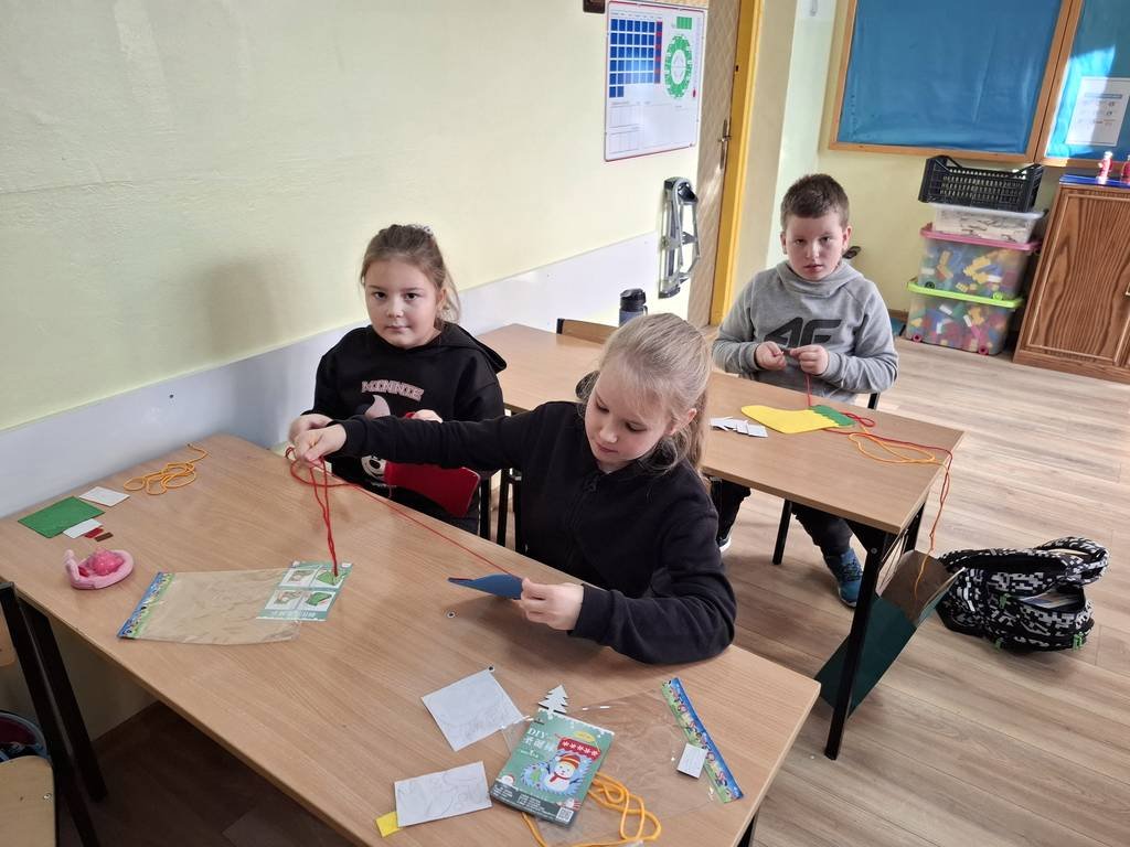 Na kolejnych zajęciach uczniowie uczyli się nawlekać włóczkę na igłę, poznali prosty ścieg, którym obszywali filcowego buta Mikołajkowego. Po wykonaniu tej czynności obszyty but został udekorowany świątecznymi naklejkami.