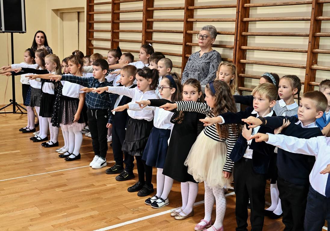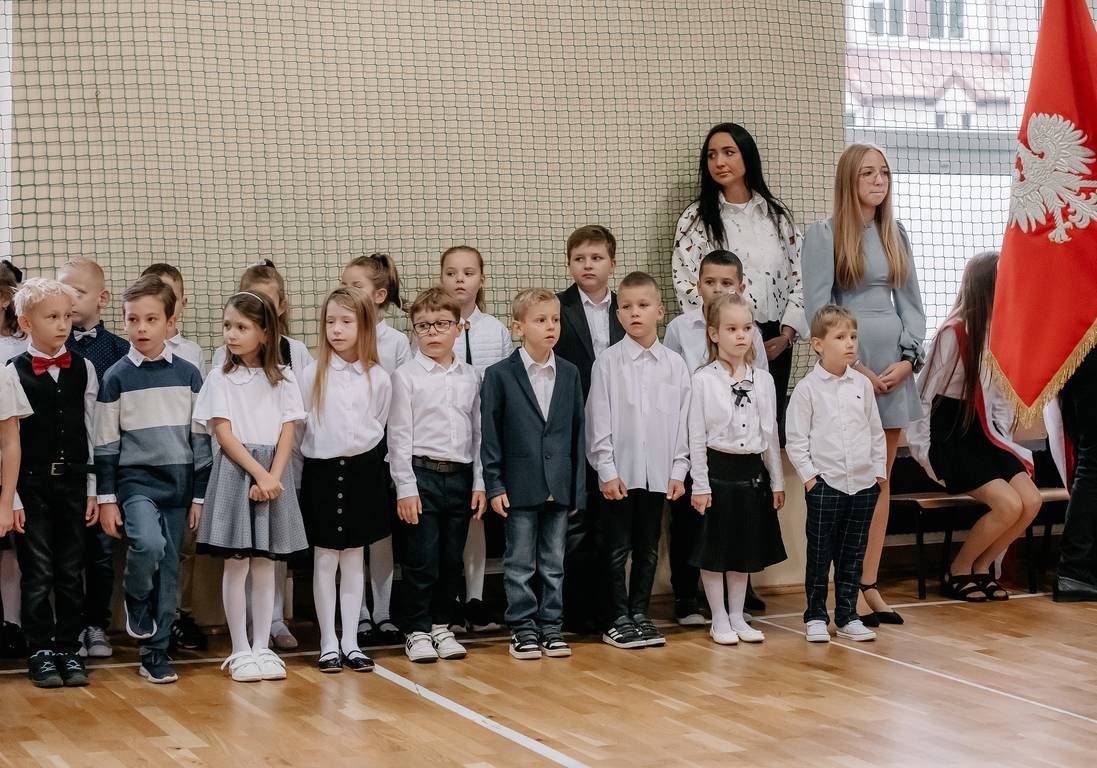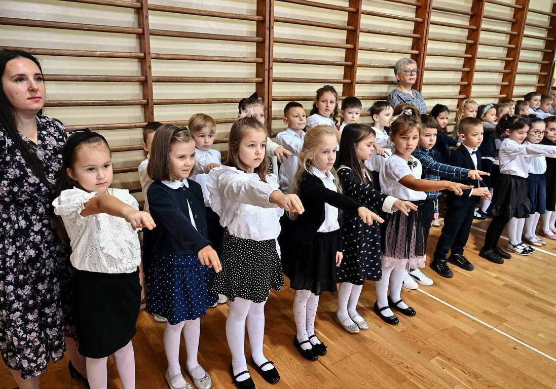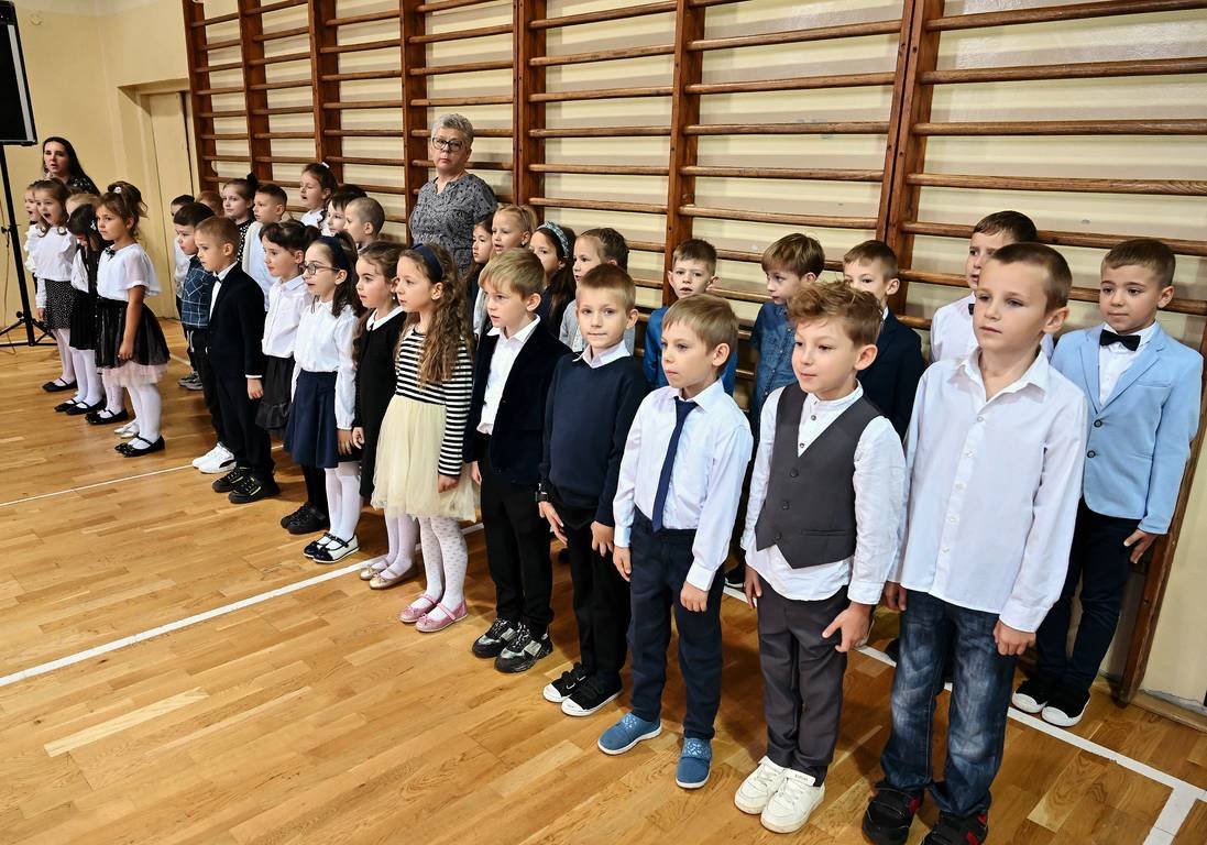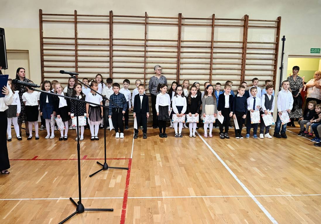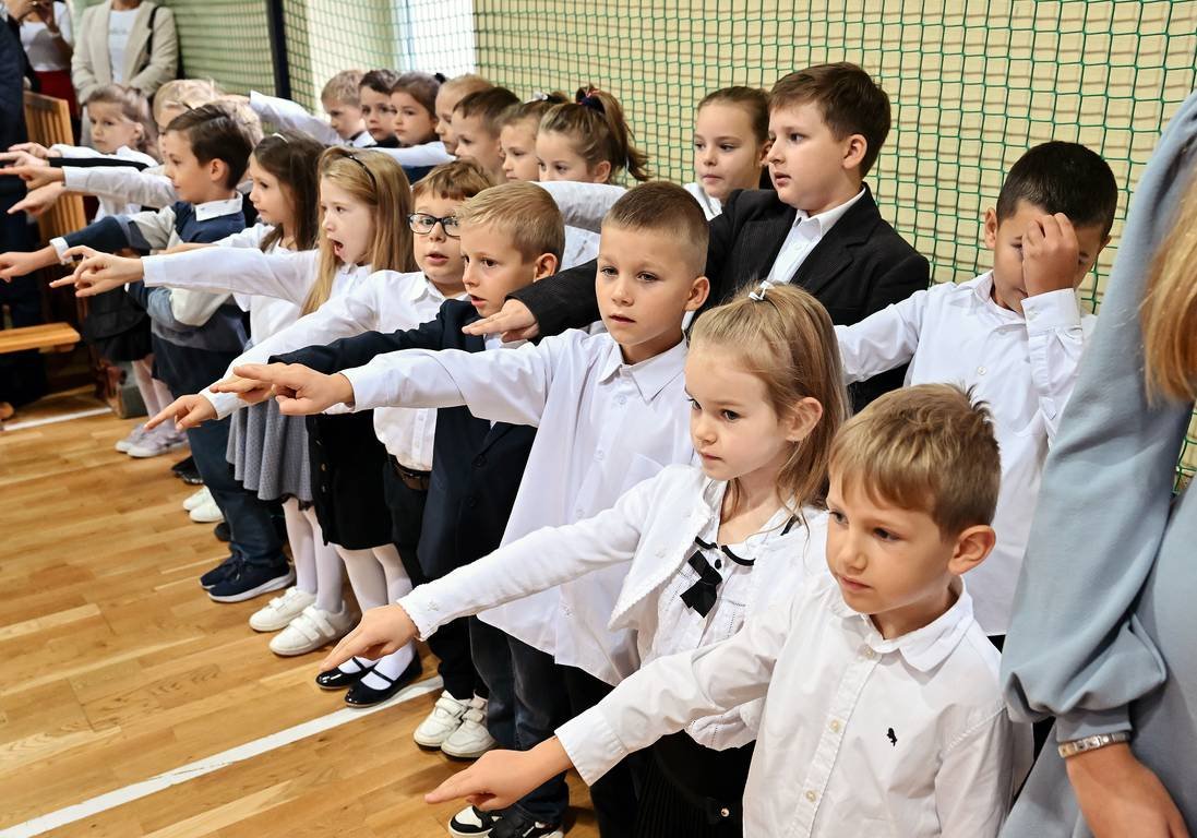 W tym dniu dzieci oficjalnie przyjęte zostały do grona uczniów szkoły. Najważniejszą częścią uroczystości, na którą wszyscy czekali było ślubowanie oraz pasowanie wielkim piórem przez Dyrektor Szkoły. Pierwszaki głośno i z przekonaniem przyrzekały być dobrymi i pilnymi uczniami oraz rzetelnie wypełniać swoje obowiązki, o czym przypominać im będą otrzymane dyplomy. Na koniec uczniowie klasy 2a pod opieką wychowawczyni Marty Kamykowskiej przygotowali występ dla wszystkich obecnych na uroczystości. Wszystkim pierwszoklasistom w tak ważnym dla nich dniu życzymy wielu sukcesów na nowej drodze w murach naszej szkoły.