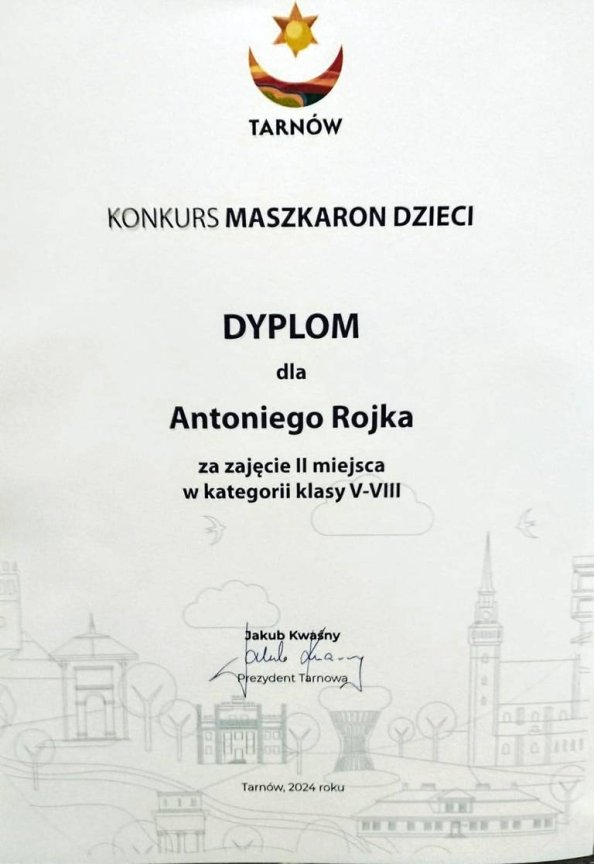 Niezwykle miło nam poinformować, że zdobywcą II nagrody – w konkursie „Maszkaron Dzieci” zorganizowanym przez Urząd Miasta Tarnowa - został nasz uczeń Antoni Rojek, natomiast wyróżnienie przypadło w udziale naszej tegorocznej absolwentce Mai Witos.