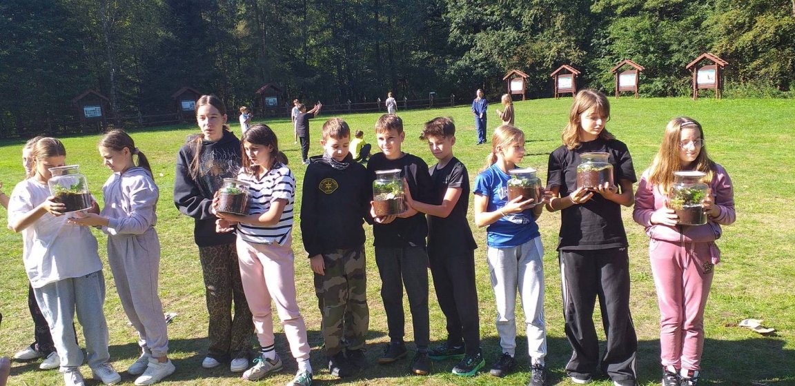 Jedną z najbardziej kreatywnych części wycieczki było własnoręczne tworzenie „lasu w słoiku” – miniaturowego ekosystemu zamkniętego w szklanym naczyniu. Dzieci z dużym zaangażowaniem podeszły do zadania i z dumą prezentowały swoje zielone dzieła . Prace te ozdobią nasza szkolną salę lekcyjną.