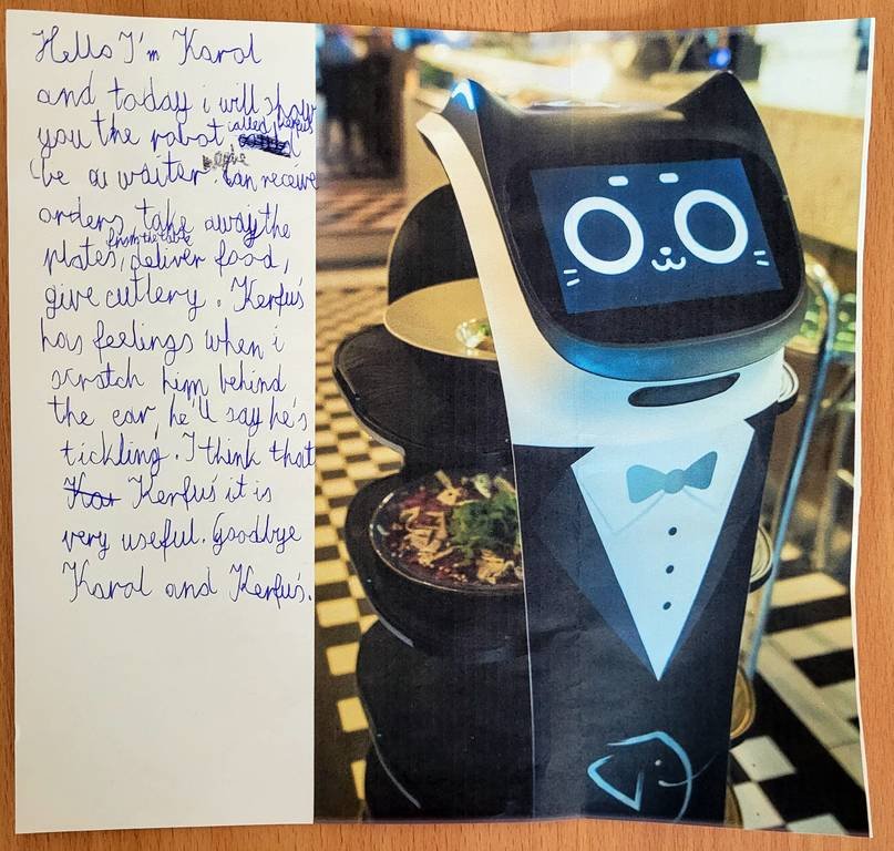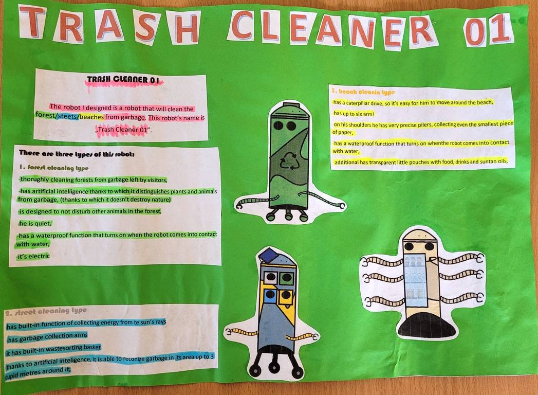 Były więc roboty od "brudnej roboty" czyli prania , sprzątania, gotowania, roboty od zadań domowych, styliści, ekolodzy, kelnerzy, poprawiające nastrój, a hitem był robot poprawiający sprawdziany i czuwający nad prawidłowym ich przebiegiem. „Myślę, że ten ostatni bardzo by mi się przydał” – skwitowała nasza pani anglistka Marta Mazur.