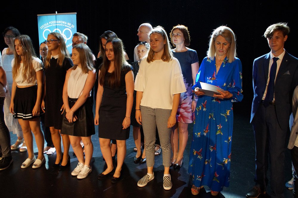 W zapełnionej po brzegi auli obecni byli: Dyrektor i wicedyrektorzy, nauczyciele, uczniowie wraz z rodzicami, przyjaciele i sympatycy Szkoły. Dyrektor przypomniał najważniejsze tegoroczne osiągnięcia dydaktyczne, sportowe i artystyczne dzieci i młodzieży. Nastąpiło przekazanie Sztandaru. Licznie wyróżnieni absolwenci otrzymali „Złote tarcze” oraz „Listy pochwalne”, a ich rodzice „Listy gratulacyjne”. Kilkunastoosobowa grupa absolwentów, którzy pozytywnie zdali egzaminy językowe otrzymała elitarne certyfikaty języka angielskiego i niemieckiego. Upominkami rzeczowymi nagrodzono szczególnie wyróżniających się w nauce, zachowaniu i pracy społecznej uczniów wytypowanych przez wychowawców. Nagrody za sukcesy piłkarskie, lekkoatletyczne i pływackie odebrali sportowcy. Swoje najważniejsze puchary przekazali na ręce Dyrektora Szkoły. Rozstrzygnięto tradycyjny plebiscyt Samorządu Uczniowskiego, w którym głosami koleżanek i kolegów wyróżniono w pięciu kategoriach uczniowskie osobowości. Uroczystość zakończył program artystyczny przygotowany przez dzieci i młodzież Dwudziestki. Wyjątkowy pod wieloma względami rok szkolny przeszedł do historii. Nim wrócimy 2 września pełni wrażeń i opaleni do naszej Dwudziestki, wypada życzyć wszystkim uczniom bezpiecznych i dłuuugich wakacji. Niech to magiczne słowo odmieniane przez wszystkie przypadki przyniesie radosny wypoczynek, pozwoli nabrać dystansu do obowiązków szkolnych, sprawi, że zatęsknimy w końcu sierpnia za naszą klasą, wychowawcą, nauczycielami…