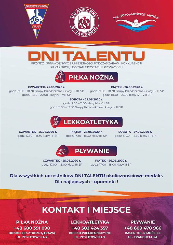 Na zakończenie roku szkolnego, po kilku miesiącach nauki przy komputerze, Szkoła Podstawowa nr 20 z Oddziałami Sportowymi w Tarnowie organizuje w tym tygodniu Dni Talentu. Jest to wspólna akcja Akademii Górnik 20 Tarnów, AZS PWSZ Tarnów oraz UKS „Sokół-Mościce” Tarnów. – Przyjdź i sprawdź swoje umiejętności podczas zabaw i konkurencji piłkarskich, lekkoatletycznych i pływackich – zachęcają organizatorzy. Zajęcia piłkarskie odbędą się na boisku ze sztuczną trawą przy ul. Zbylitowskiej 7. Ich program – oprócz gry w futbol - obejmuje m.in. bieg bez piłki, drybling czy zwroty z piłką. Przedszkolacy i uczniowie trzech pierwszych klas szkół podstawowych będą mogli sprawdzić swoje umiejętności w czwartek i w piątek, 25 i 26 czerwca, w godz. 17.00-18.30 oraz w sobotę, 27 czerwca, między godz. 11.00 a 12.30. Uczniowie pozostałych klas szkół podstawowych będą mogli natomiast zaprezentować się w 25 i 26 czerwca od godz. 18.30 do 20.00 oraz 27 czerwca w godz. 9.30-11.00.