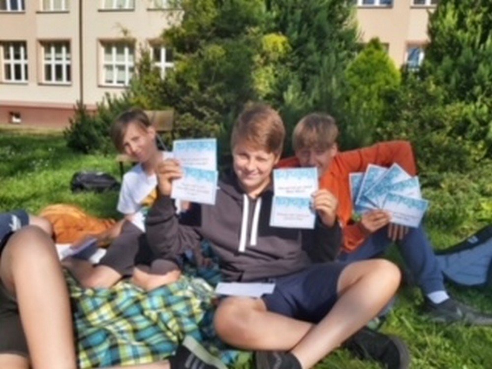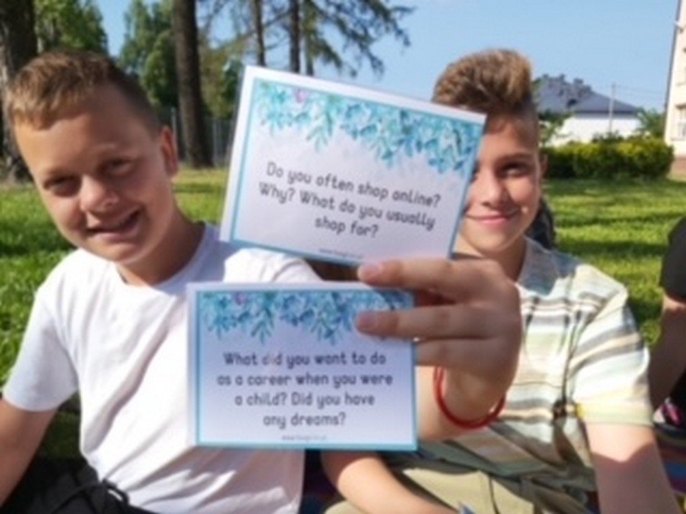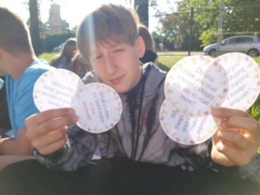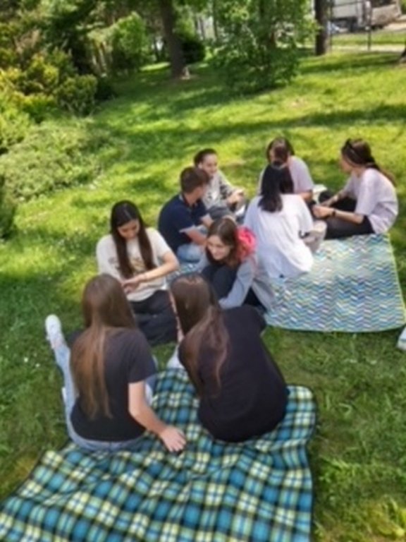 Uczniowie klas Euro przy sprzyjajacej czerwcowej aurze uczestniczą w ciekawych zajęciach jezykowych na świeżym powietrzu. Uczniowie pracują w parach lub grupach, odpowiadają na ciekawe pytania dotyczace codziennego życia i poglądu na różne sprawy życiowe.
